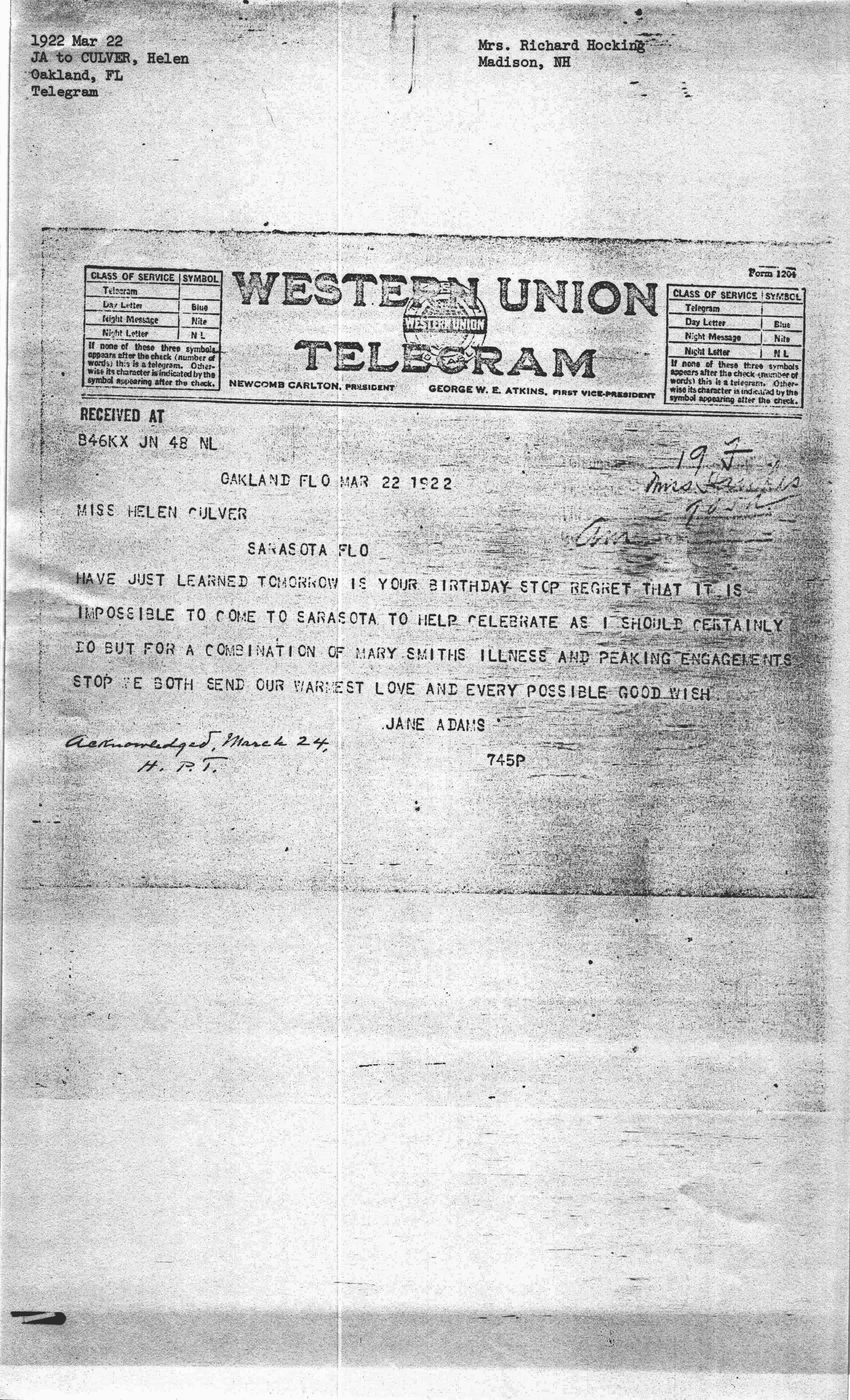 HAVE JUST LEARNED TOMORROW IS YOUR BIRTHDAY. REGRET THAT IT IS IMPOSSIBLE TO COME TO SARASOTA TO HELP CELEBRATE AS I SHOULD CERTAINLY DO BUT FOR A COMBINATION OF MARY SMITHS ILLNESS AND [SPEAKING] ENGAGEMENTS. WE BOTH SEND OUR WARMEST LOVE AND EVERY POSSIBLE GOOD WISH.