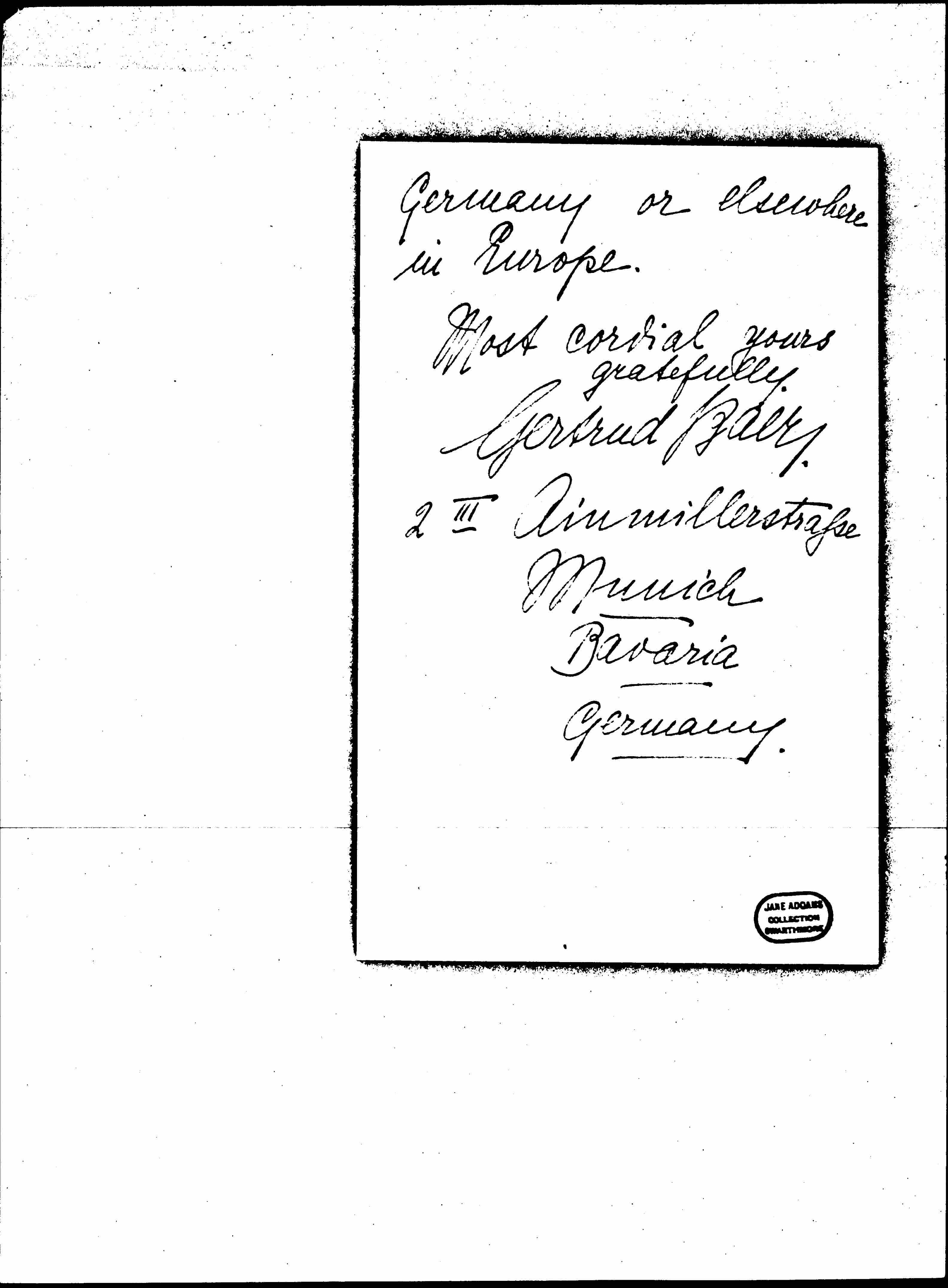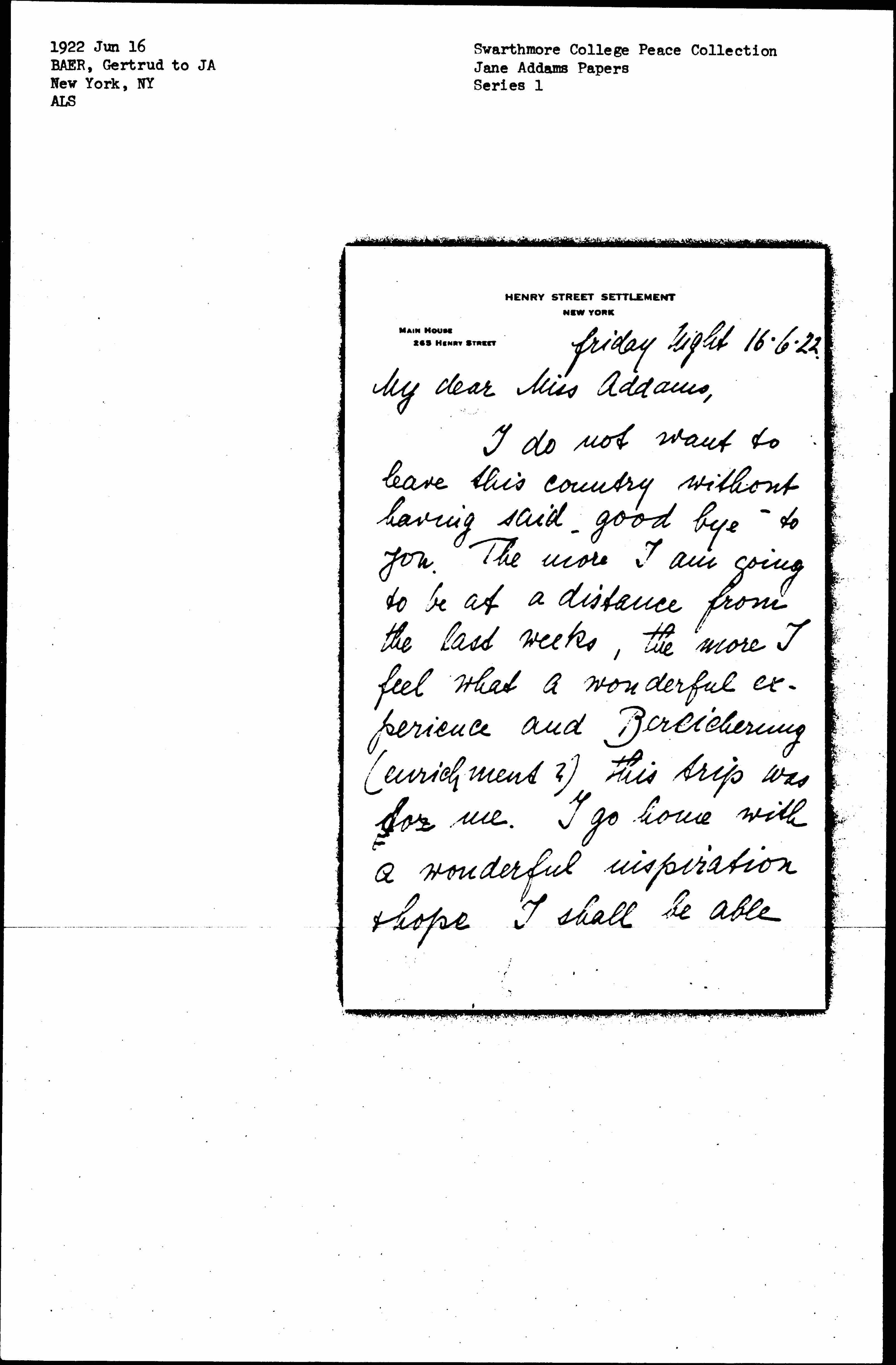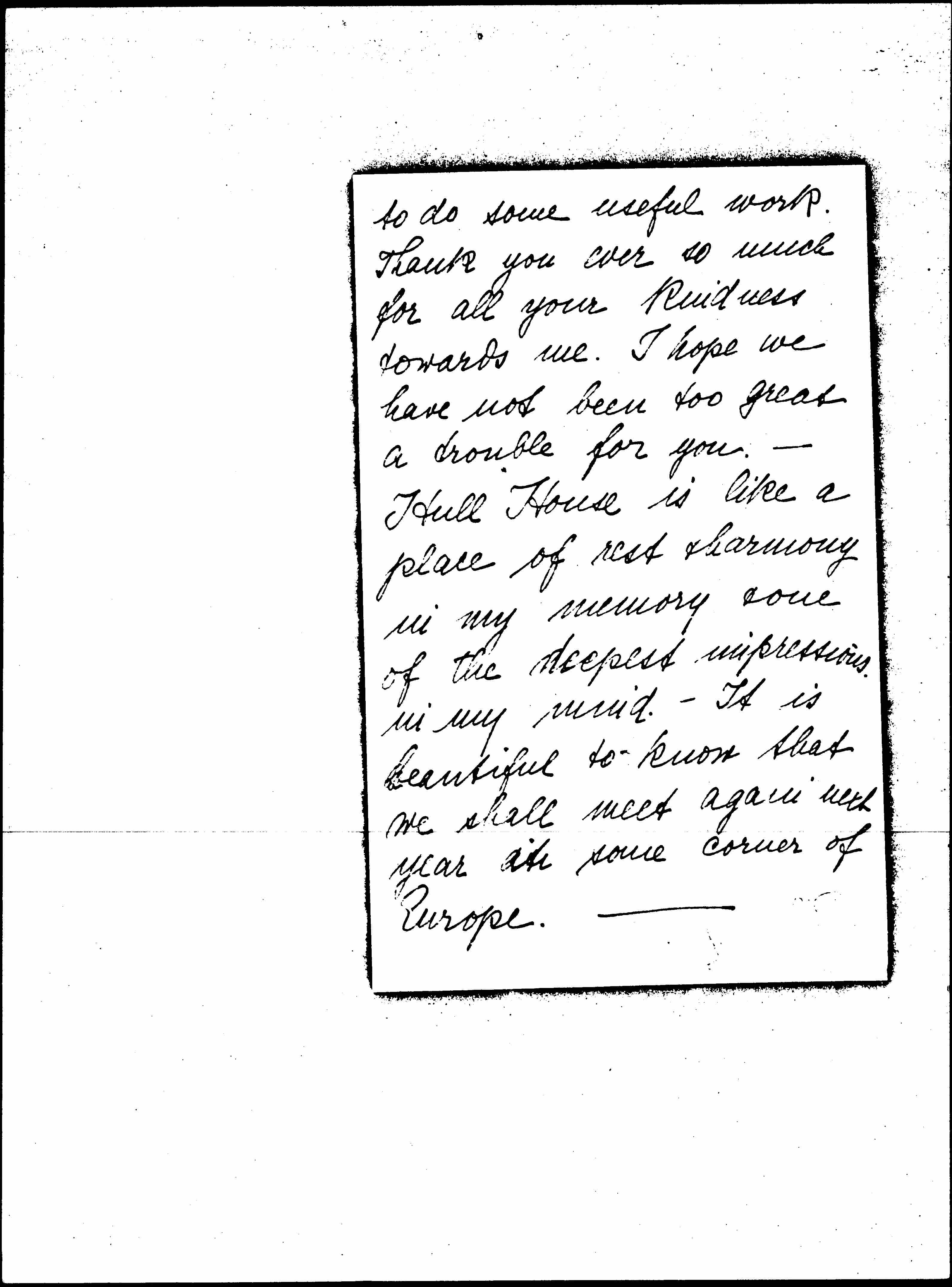 I do not want to leave this country without having said "[goodbye]" to you. The more I am going to be at a distance from the last weeks, the more I feel what a wonderful experience and Bereicherung (enrichment?) this trip was for me. I go home with a wonderful inspiration & hope I shall be able [page 2] to do some useful work. Thank you each so much for all you kindness towards me. I hope we have not been too great a trouble for you. -- Hull House is like a place of rest & harmony in my memory & one of the deepest impressions in my mind. -- It is beautiful to know that we shall meet again next year [in] some corner of Europe. [page 3] My very best wishes to Hull House & all who come & go there & most cordial thanks again to Miss Smith for her very kind hospitality. Please, let me know, whether I can do anything for you in [page 4] Germany or elsewhere in Europe.