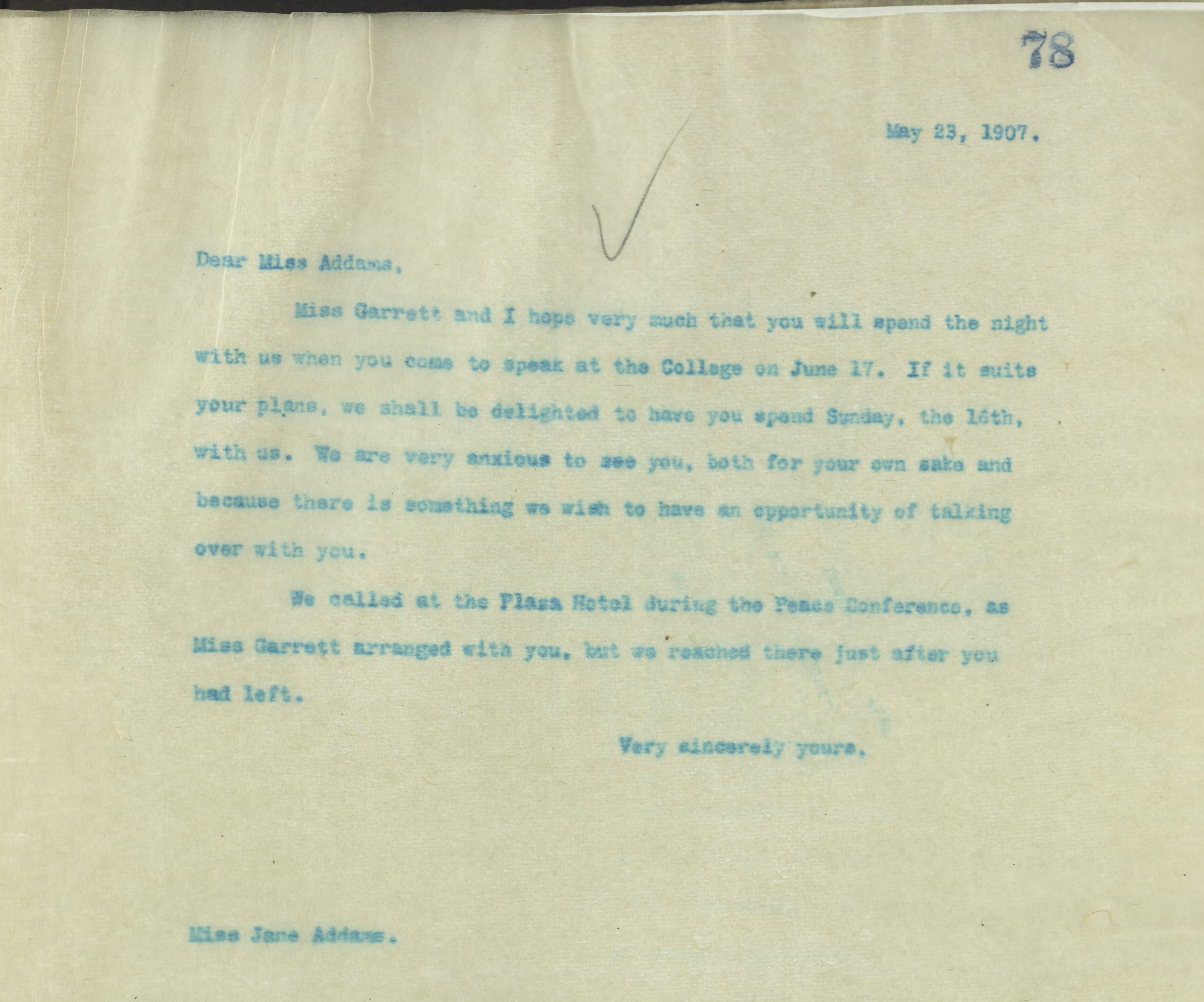 Miss Garrett and I hope very much that you will spend the night with us when you come to speak at the College on June 17. If it suits your plans, we shall be delighted to have you spend Sunday, the 16th, with us. We are very anxious to see you, both for your own sake and because there is something we wish to have an opportunity of talking over with you.