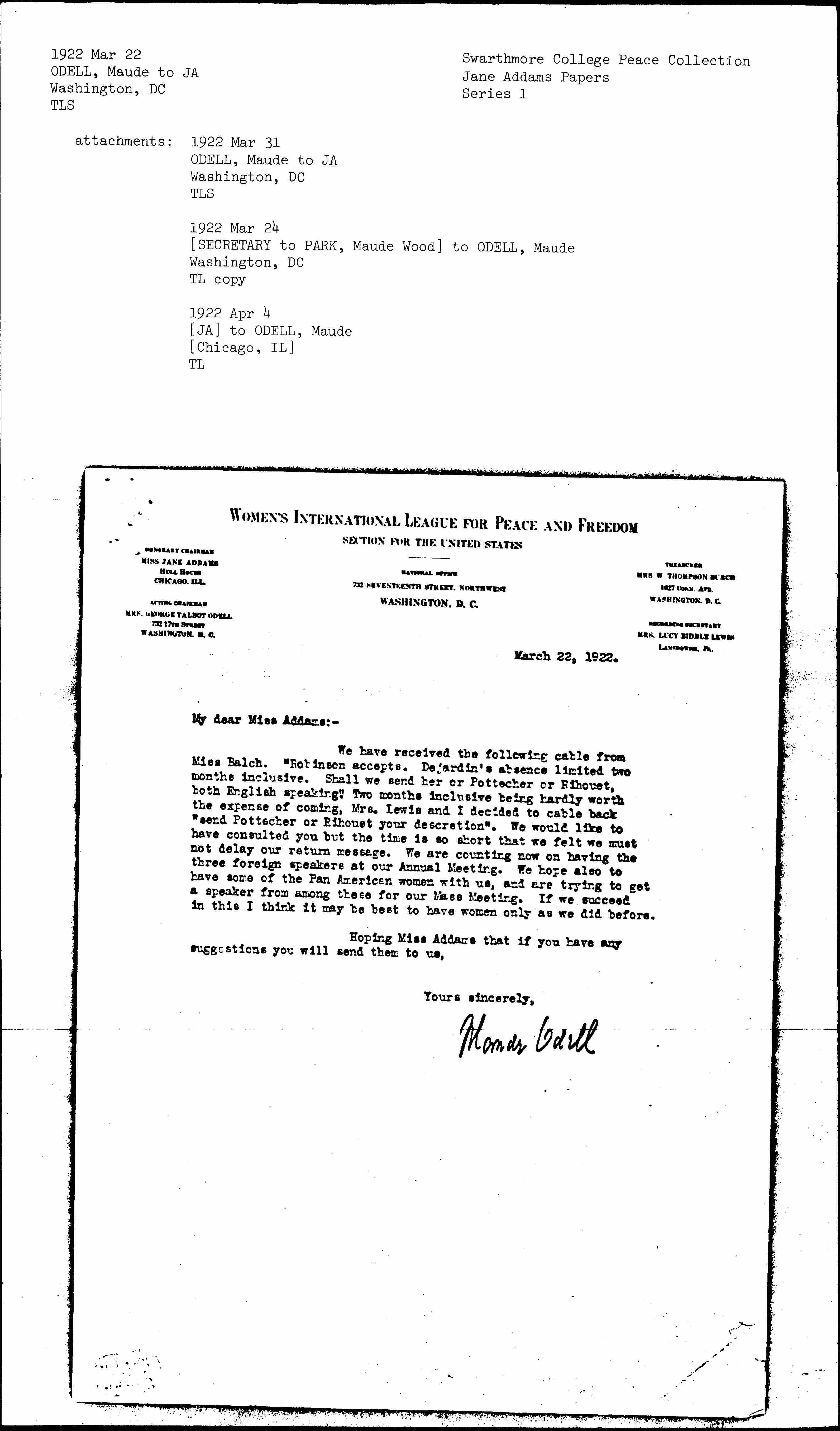 We have received the following cable from Miss Balch. “Robinson accepts. Dejardin’s absence limited two months inclusive. Shall we send her or Pottecher or Rihouĕt, both English speaking." Two months inclusive being hardly worth the expense of coming, Mrs. Lewis and I decided to cable back “send Pottecher or Rihouĕt your discretion” We would like to have consulted you but the time is so short that we felt we must not delay our return message. We are counting now on having the three foreign speakers at our Annual Meeting. We hope also to have some of the Pan American women with us, and are trying to get a speaker from among those for our Mass Meeting. If we succeed in this I think it may be best to have women only as we did before.
