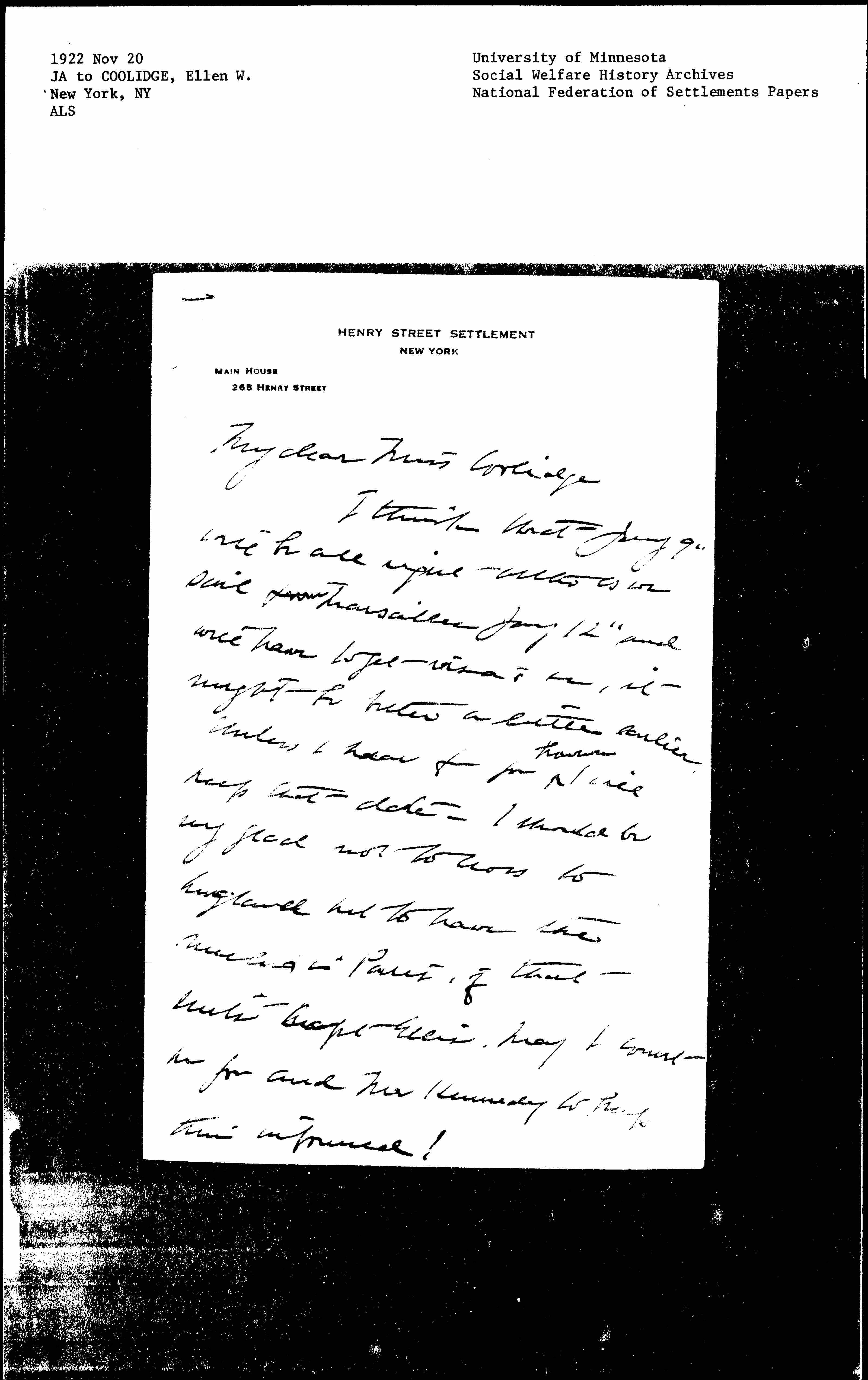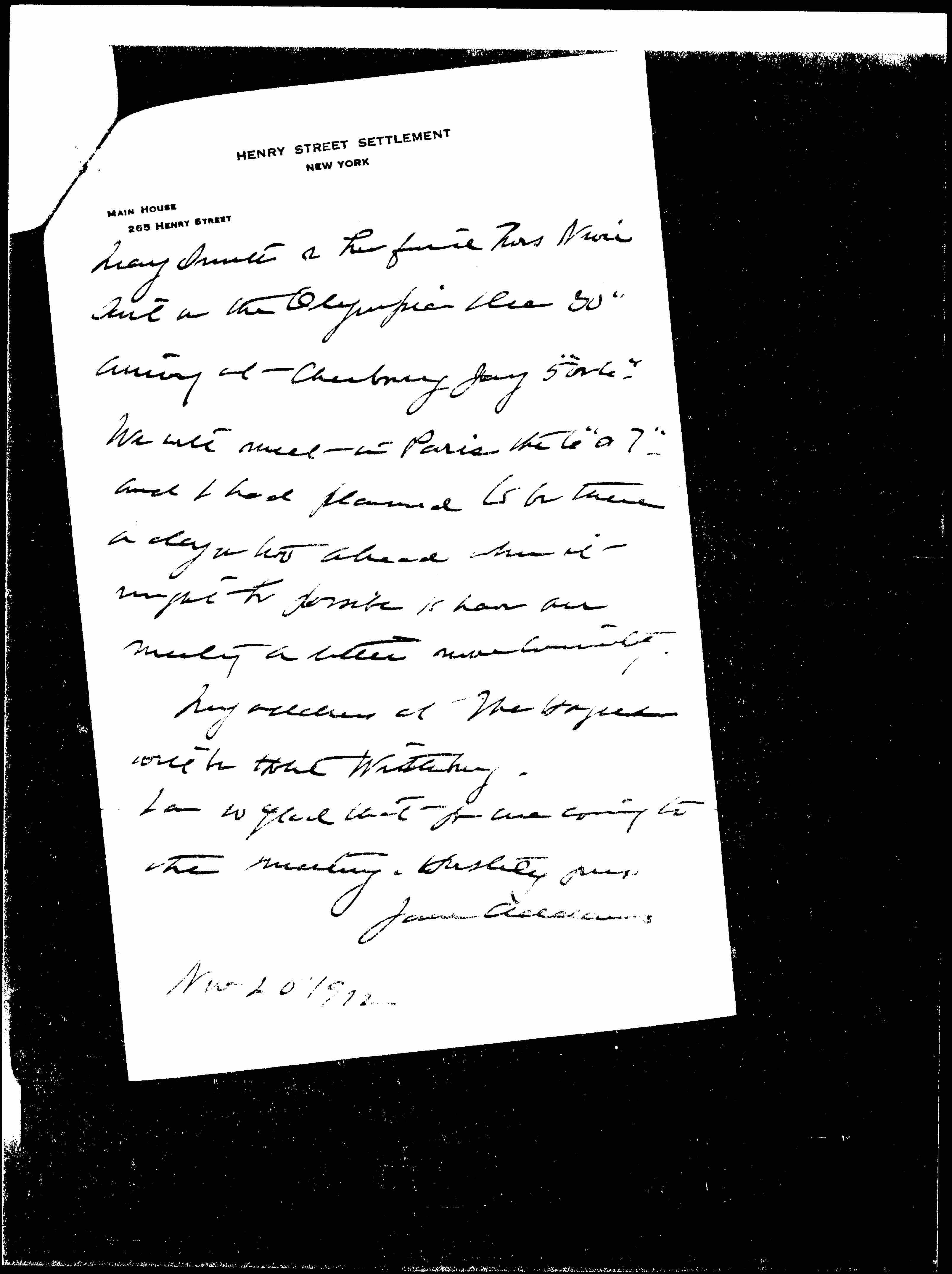 I think that Jany 9" will be all right [although] as we sail from Marseilles Jany 12" and will have to get visa's [etc.], it might be better a little earlier. Unless I hear from you ↑however↓ I will keep that date. I should be very glad not to cross to England but to have the [meeting] in Paris, if that suits Capt Ellis. May I count on you and Mr Kennedy to keep them informed? [page 2] Mary Smith & her friend Mrs Niver sail on the Olympia Dec 30" arriving at Cherbourg Jany 5" or 6". We will meet in Paris the 6" or 7" -- and I had planned to be there a day or two ahead when it might be possible to have our meeting a little more [conveniently].
