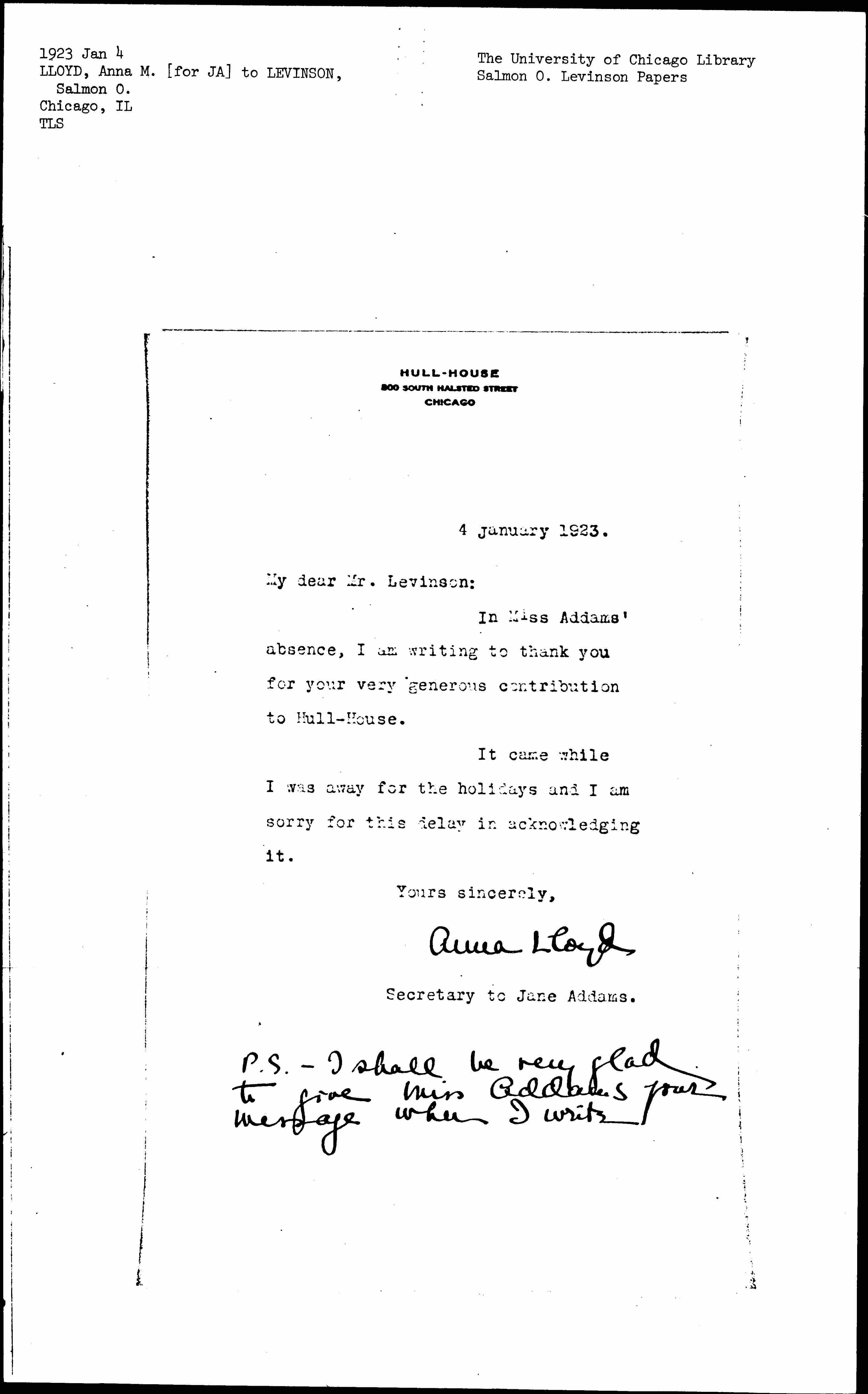 In Miss Addams' absence, I am writing to thank you for your very generous contribution to Hull-House.