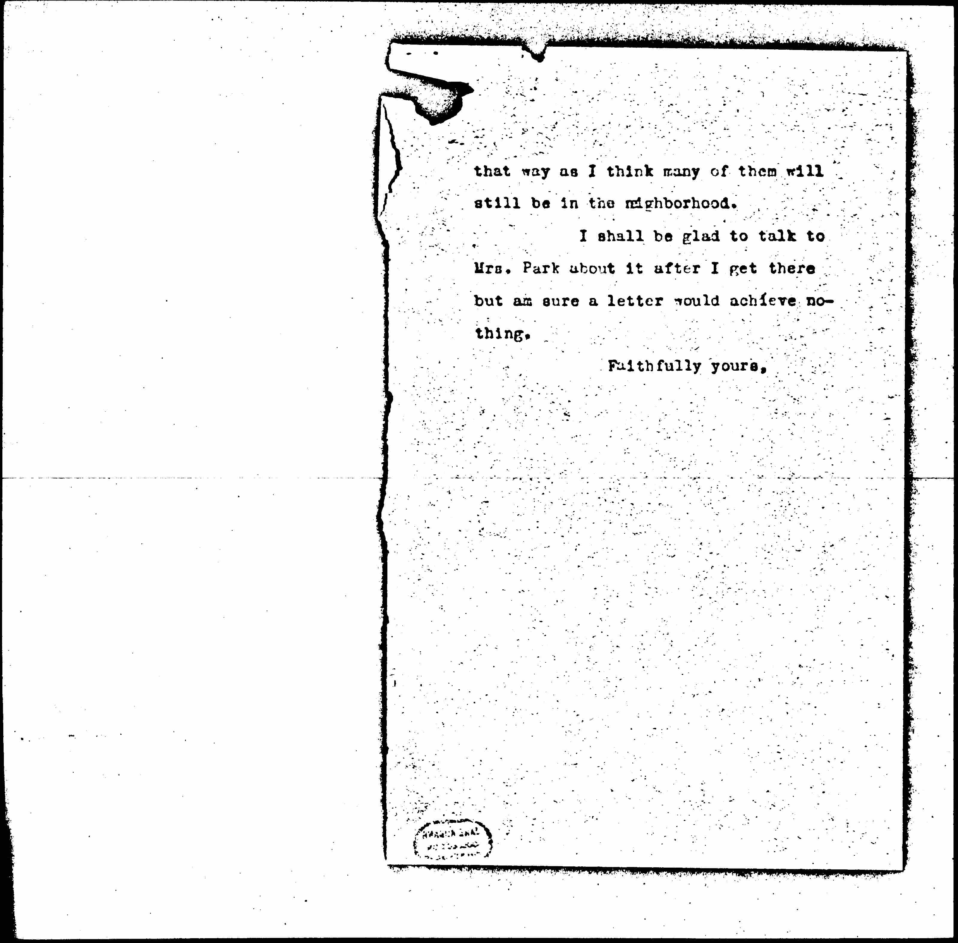I shall be glad to talk to Mrs. Park about it after I get there but am sure a letter would achieve nothing.