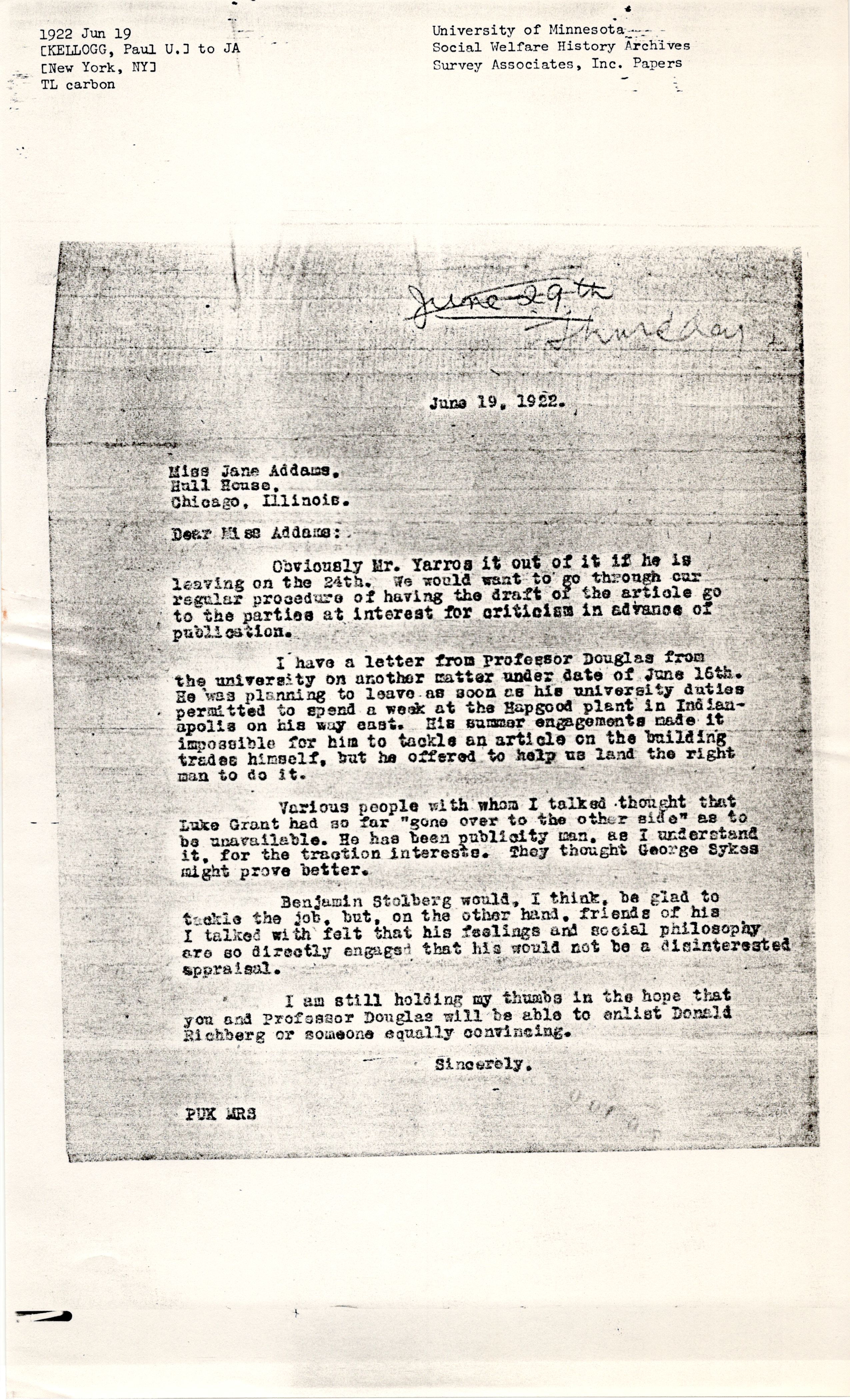 Obviously Mr. Yarros [is] out of it if he is leaving on the 24th. We would want to go through our regular procedure of having the draft of the article go to the parties at interest for criticism in advance of publication.I have a letter from Professor Douglas from the university on another matter under date of June 16th. He was planning to leave as soon as his university duties permitted to spend a week at the Hapgood plant in Indianapolis on his way east. His summer engagements made it impossible for him to tackle an article on the building trades himself, but he offered to help us land the right man to do it.