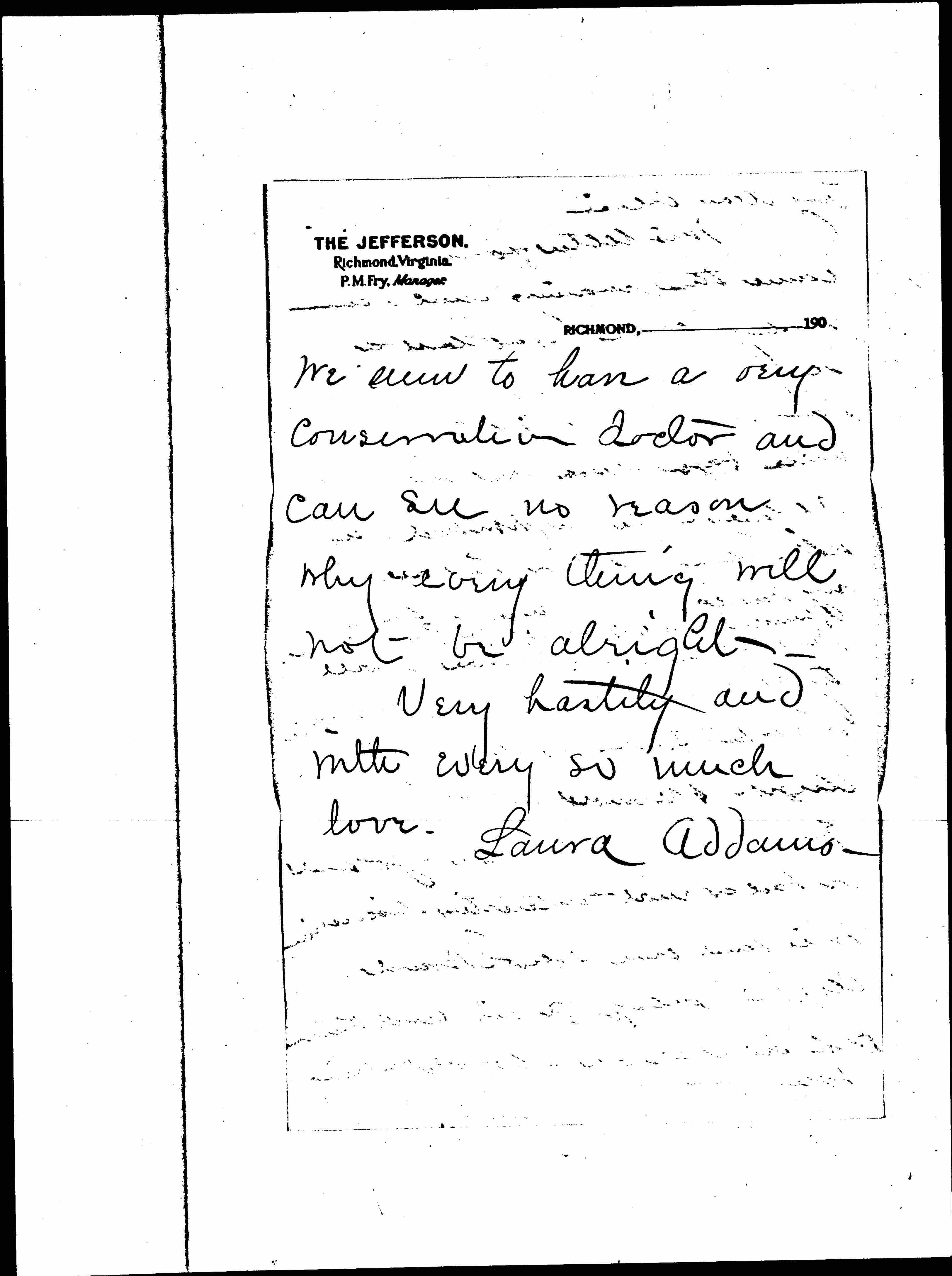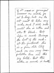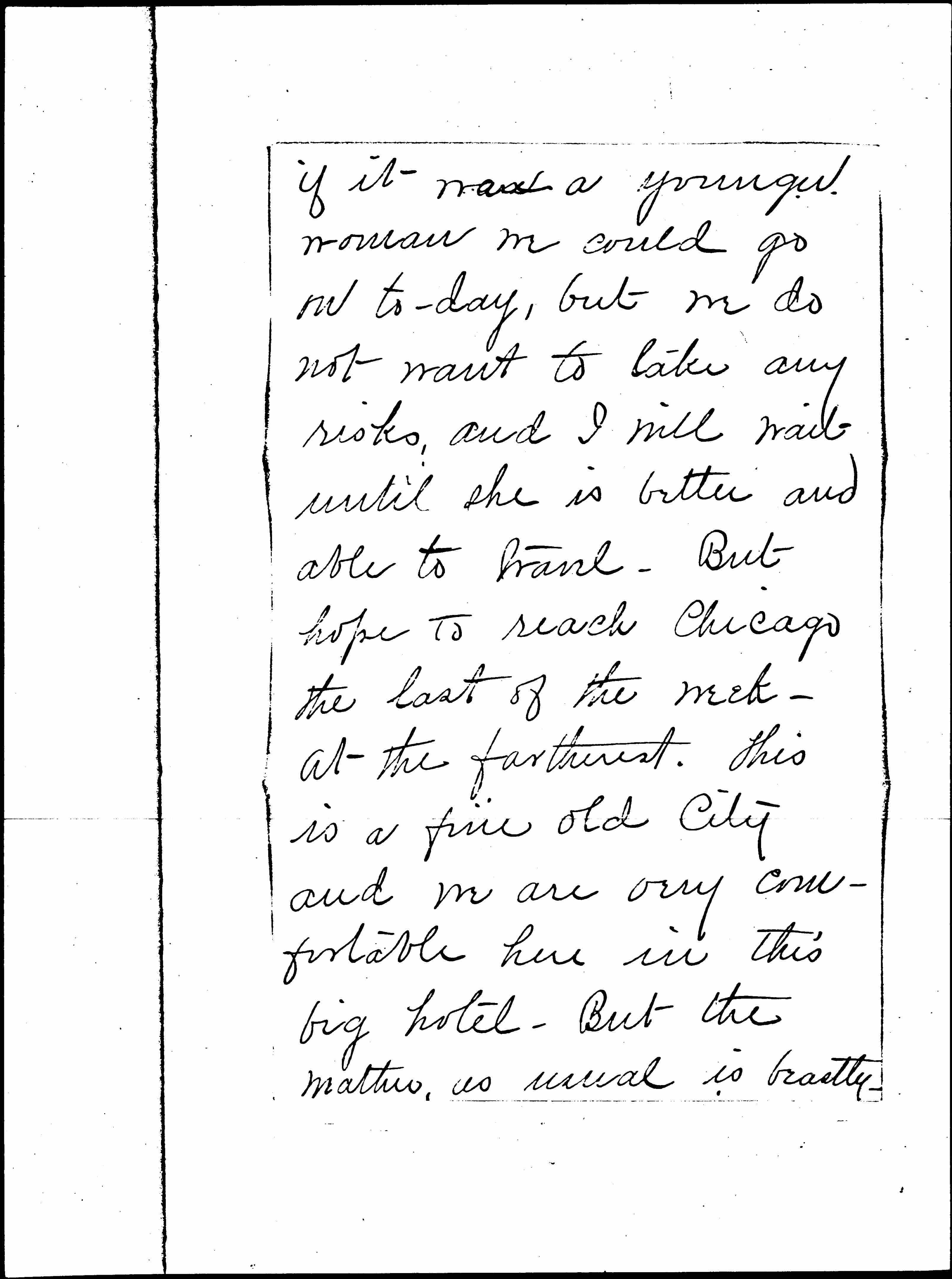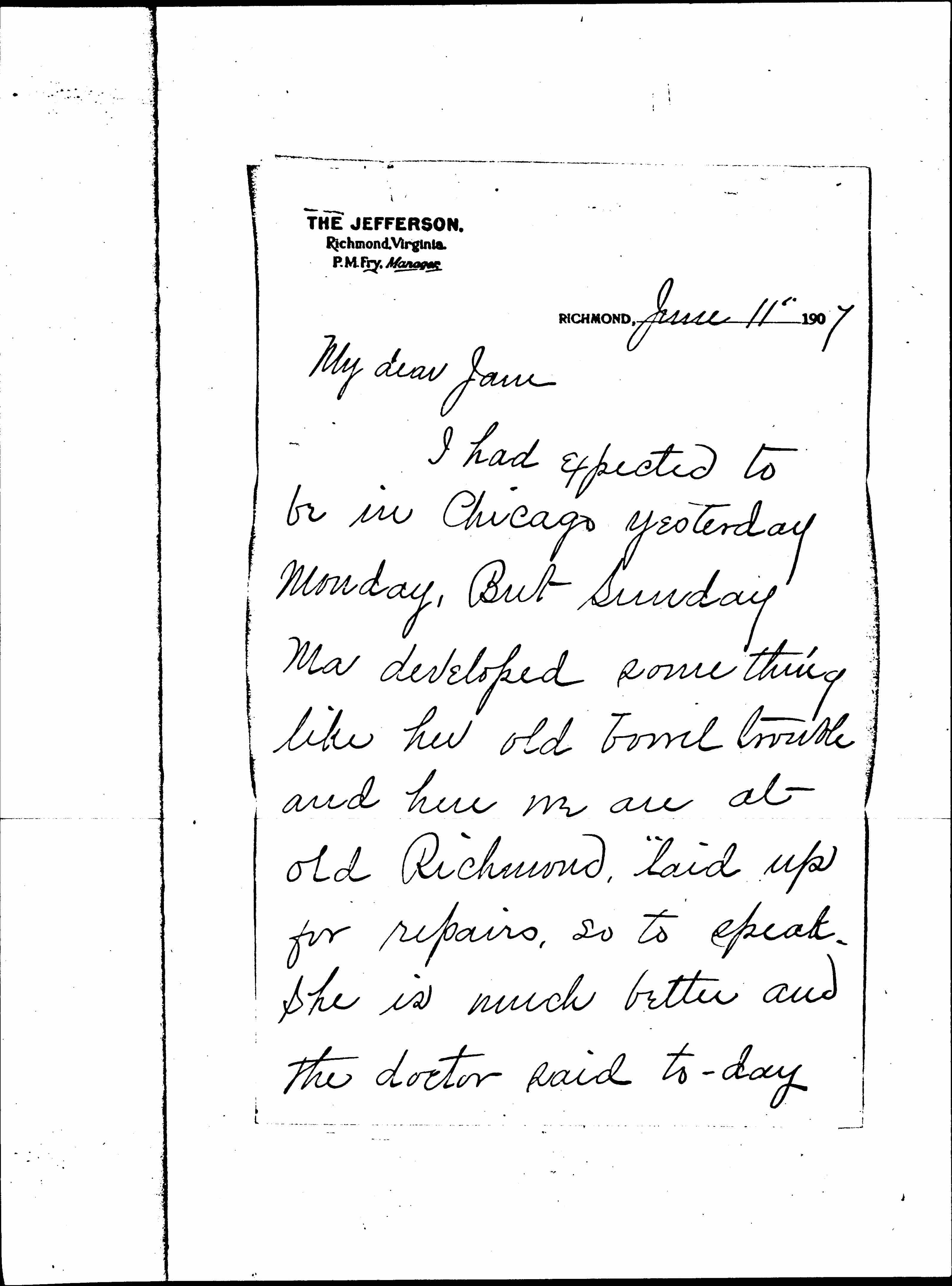 I had expected to be Chicago yesterday Monday, But Sunday Ma developed something like her old [tonsil] trouble and here we are at old Richmond, "laid up for repairs," so to speak. She is much better and the doctor said [today] [page 2] if it was a younger woman we could go on [today], but we do not want to take any risks, and I will wait until she is better and able to travel. But hope to reach Chicago the last of the week--at the fartherest. This is a fine old City and we are very comfortable here in this big hotel. But the weather, as usual is beastly. [page 3] We seem to have a very conservative doctor and can see no reason why every thing will not be alright.