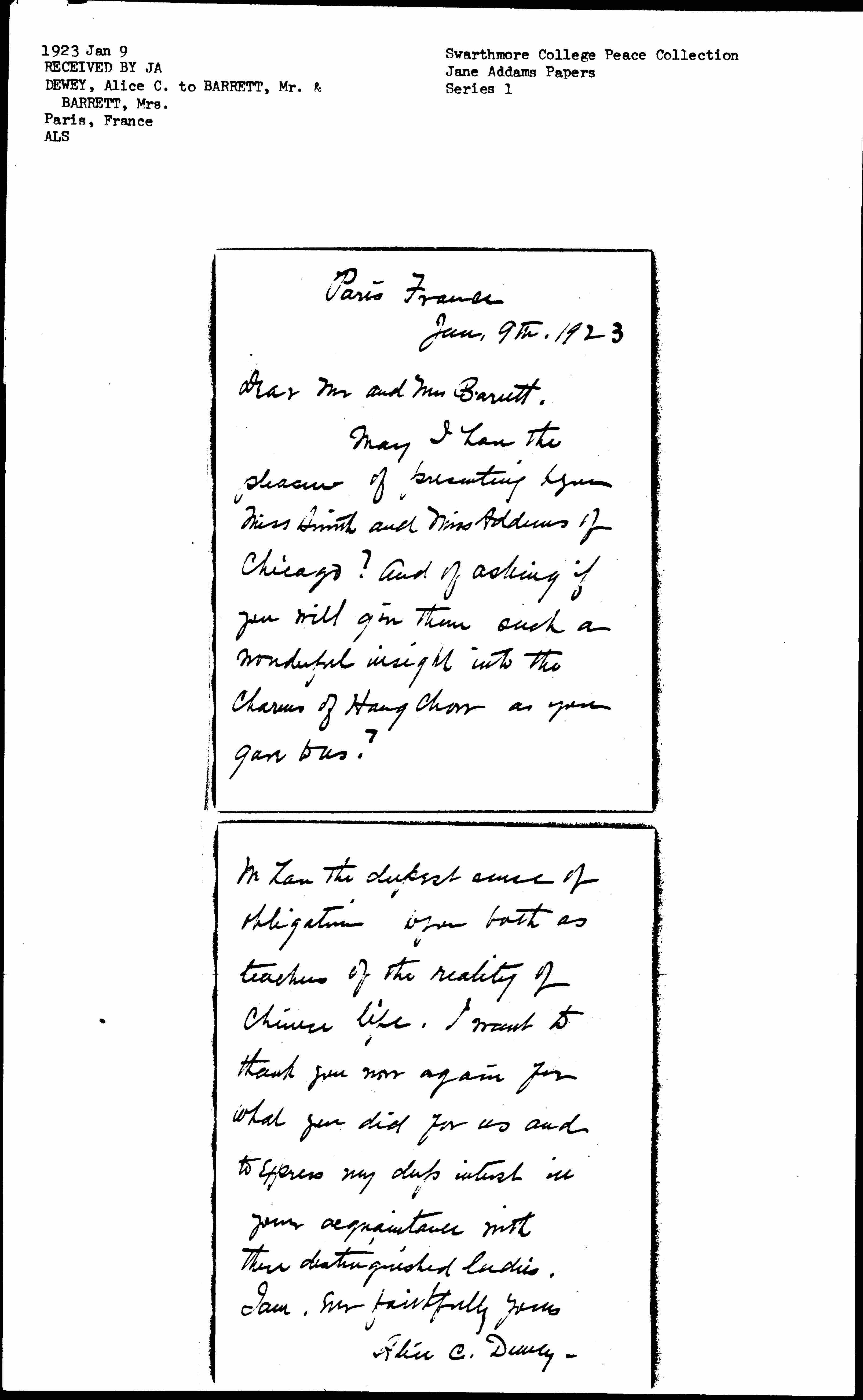 May I have the pleasure of presenting to you Miss Smith and Miss Addams of Chicago? And of asking if you will give them such a wonderful insight into the Charms of [Hangchow] as you gave to us? [page 2] We have the deepest sense of obligation to you both as teachers of the reality of Chinese life. I want to thank you now again for what you did for us and to express my deep interest in your acquaintance with these distinguished ladies.