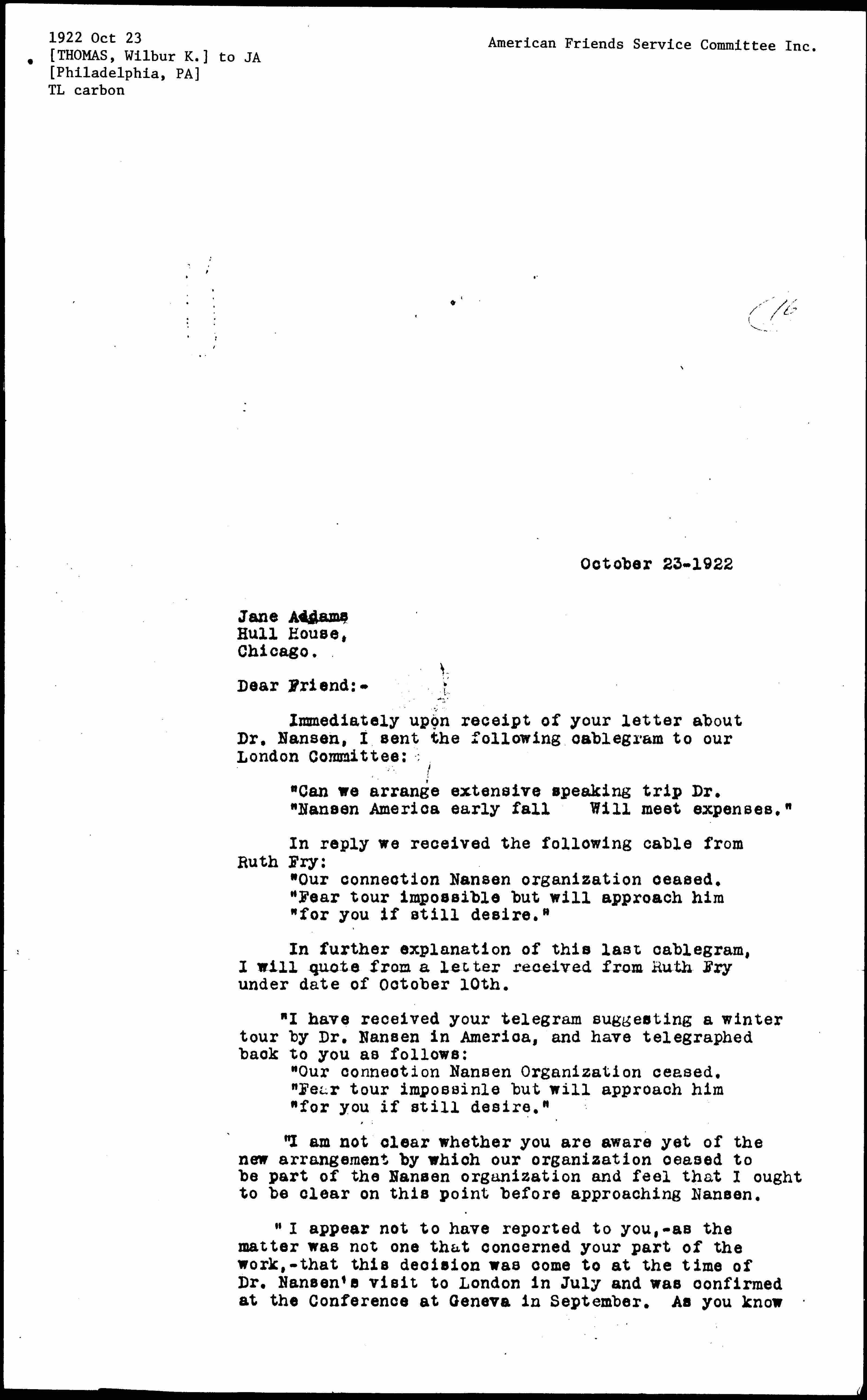 Immediately upon receipt of your letter about Dr. Nansen, I sent the following cablegram to our London Committee: