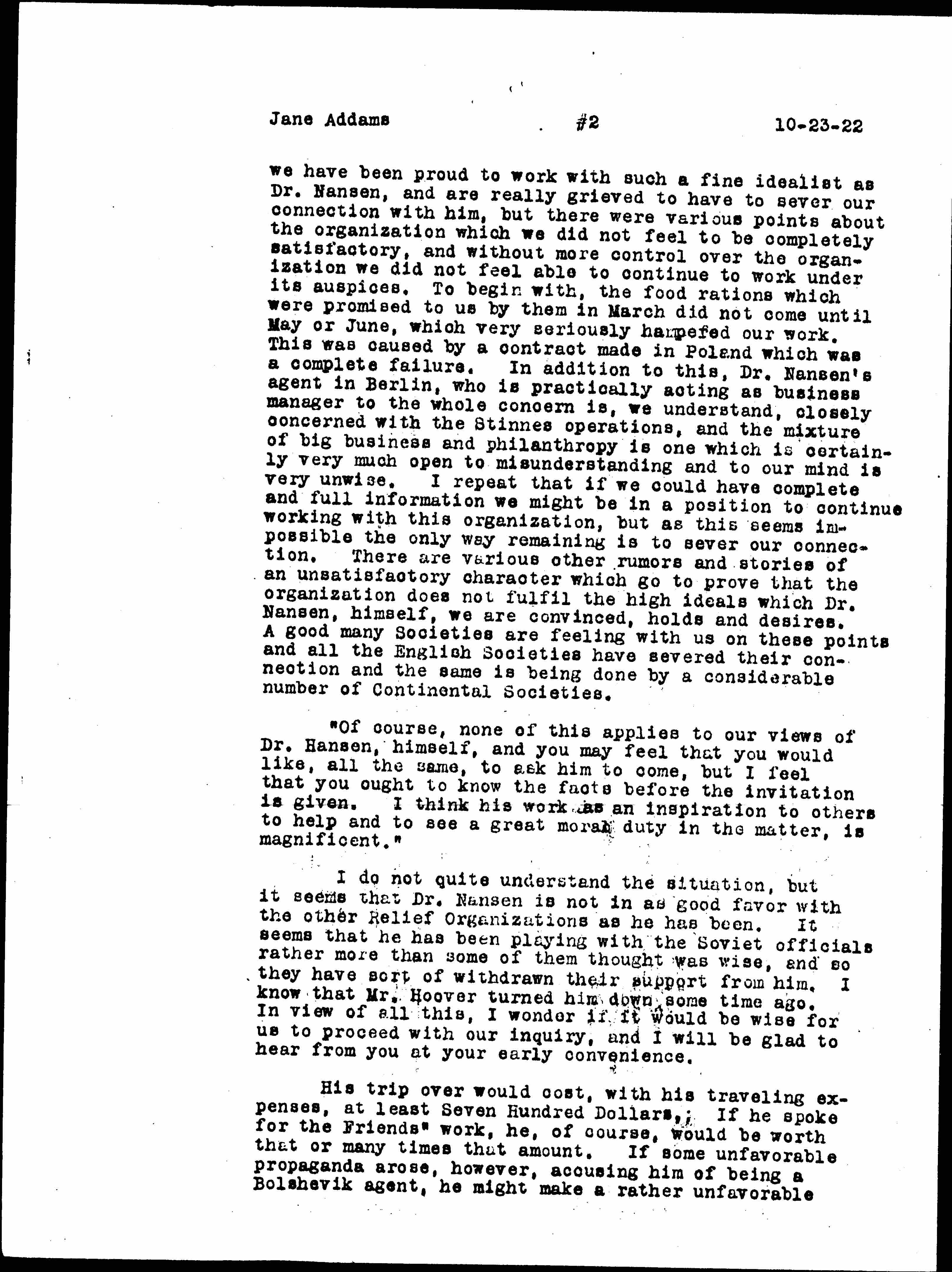 "I appear not to have reported to you, -- as the matter was not one that concerned your part of the work, -- that this decision was come to at the time of Dr. Nansen’s visit to London in July and was confirmed at the Conference at Geneva in September. As you know [page 2] we have been proud to work with such a fine idealist as Dr. Nansen, and are really grieved to have to sever our connection with him, but there were various points about the organization which we did not feel to be completely satisfactory, and without more control over the organization we did not feel able to continue to work under its auspices. To begin with, the food rations which were promised to us by them in March did not come until May or June, which very seriously hampered our work. This was caused by a contract made in Poland which was a complete failure. In addition to this, Dr. Nansen’s agent in Berlin, who is practically acting as business manager to the whole concern is, we understand, closely concerned with the Stinnes operations, and the mixture of big business and philanthropy is one which is certainly very much open to misunderstanding and to our mind is very unwise. I repeat that if we could have complete and full information we might be in a position to continue working with this organization, but as this seems impossible the only way remaining is to sever our connection. There are various other rumors and stories of an unsatisfactory character which go to prove that the organization does not fulfill the high ideals which Dr. Nansen, himself, we are convinced, holds and desires. A good many Societies are feeling with us on these points and all the English Societies have severed their connection and the same is being done by a considerable number of Continental Societies."