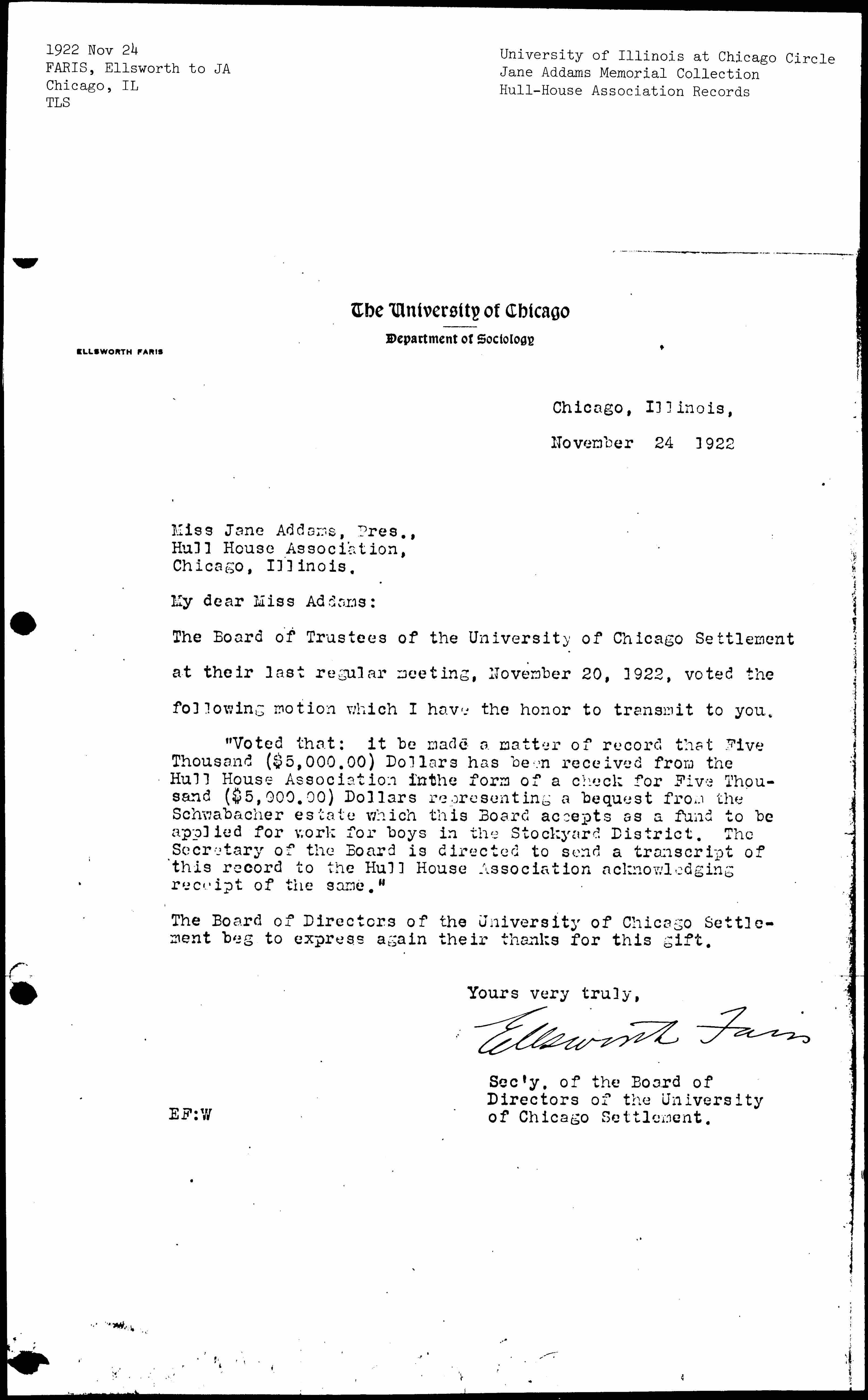 "Voted that: it be made a matter of record that Five Thousand ($5,000.00) Dollars has been received from the Hull House Association in the form of a check for Five Thousand ($5,000.00) Dollars representing a bequest from the Schwabacher estate which this Board accepts as a fund to be applied for work for boys in the Stockyard District. The Secretary of the Board is directed to send a transcript of this record to the Hull House Association acknowledging receipt of the same."