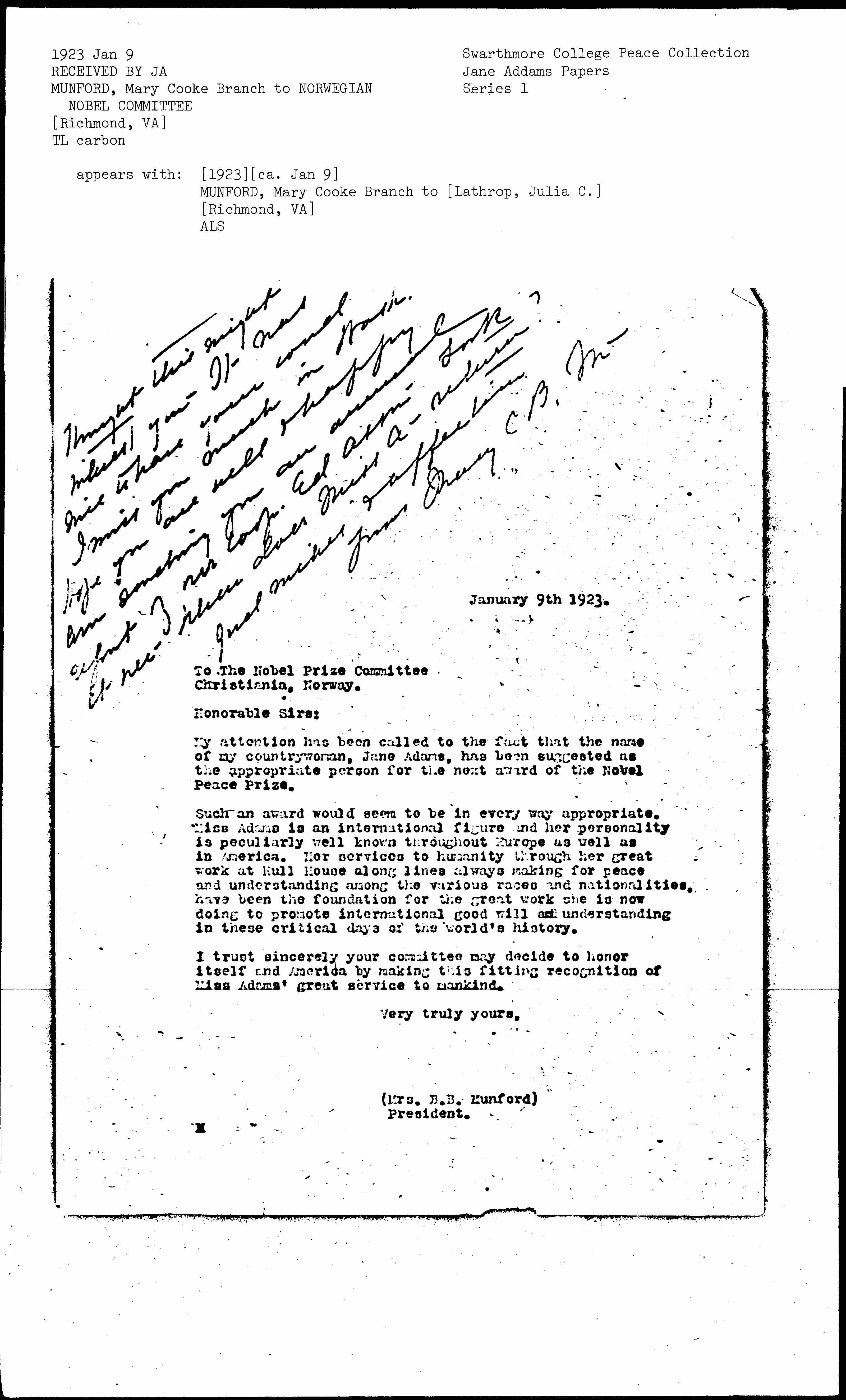 My attention has been called to the fact that the name of my countrywoman, Jane [Addams], has been suggested as the appropriate person for the next award of the Nobel Peace Prize.