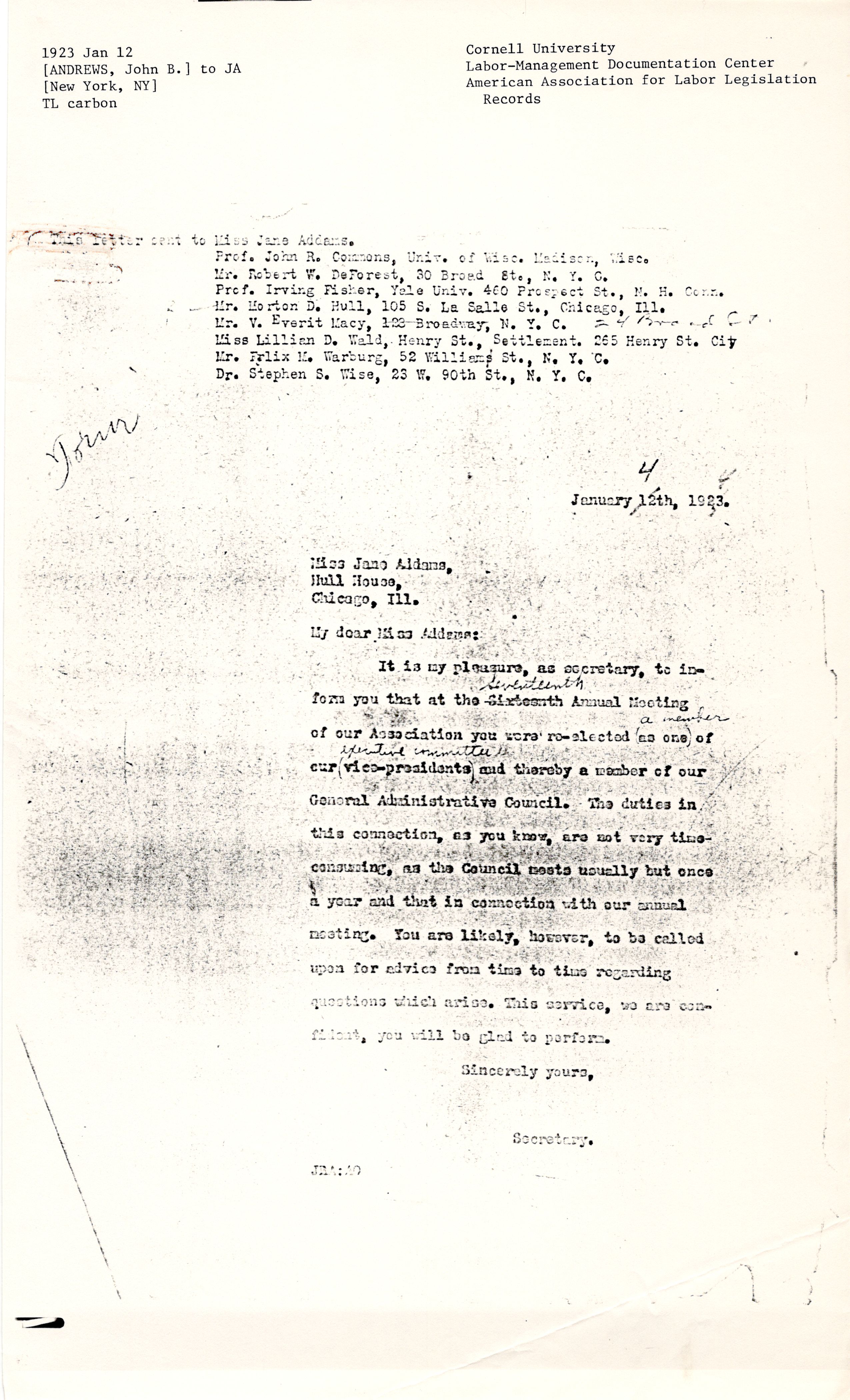 It is my pleasure, as secretary, to inform you that at the Sixteenth ↑Seventeenth↓ Annual Meeting of our Association you were [reelected] ↑a member↓ (as one) of our ↑executive committee↓ (vice-presidents) and thereby a member of our General Administrative Council. The duties in this connection, as you know, are not very time-consuming, as the Council meets usually but once a year and that in connection with our annual meeting. You are likely, however, to be called upon for advice from time to time regarding questions which arise. This service, we are confident, you will be glad to perform.