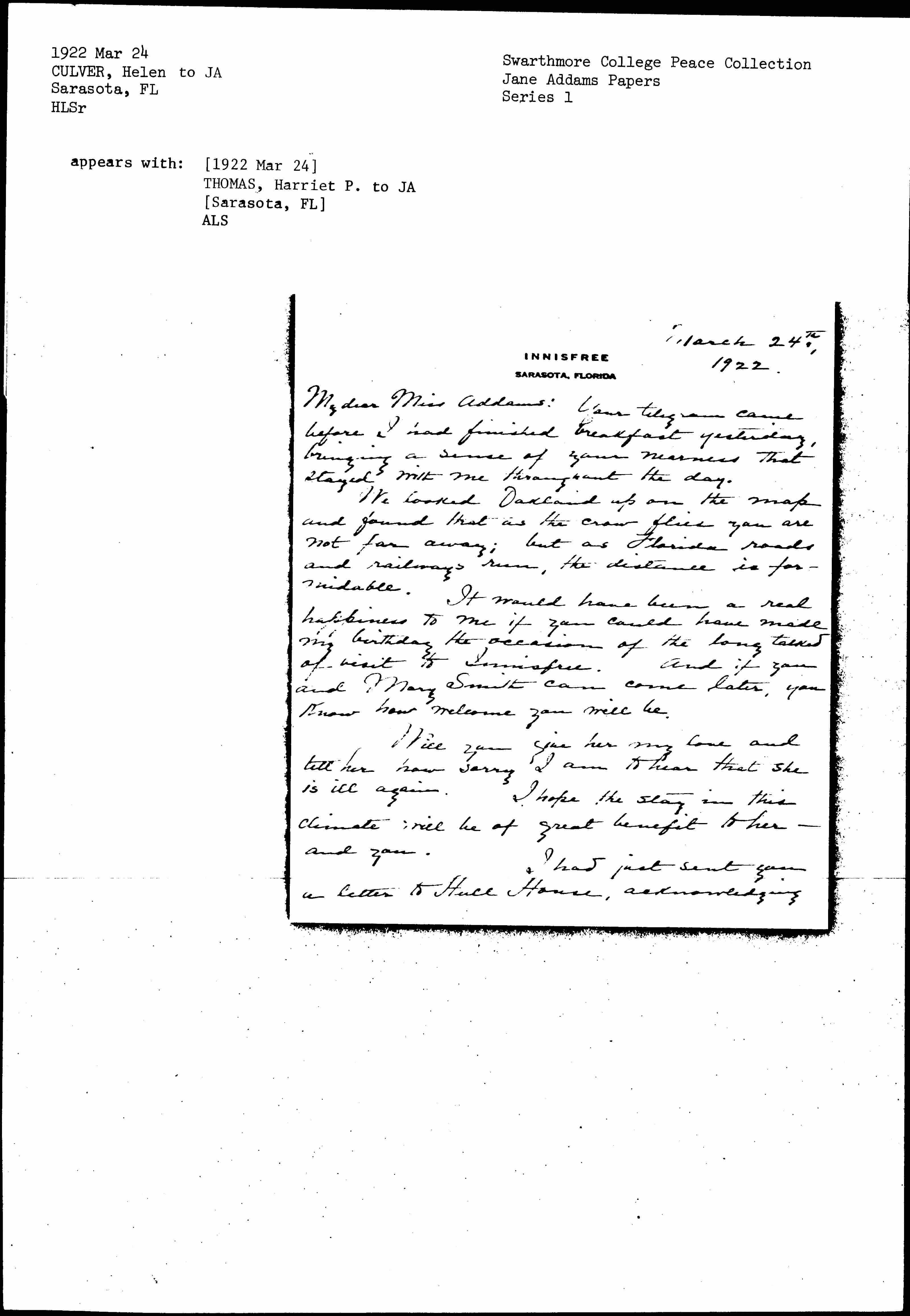 My dear Miss Addams: Your telegram came before I had finished breakfast yesterday, bringing a sense of your nearness that stayed with me throughout the day.