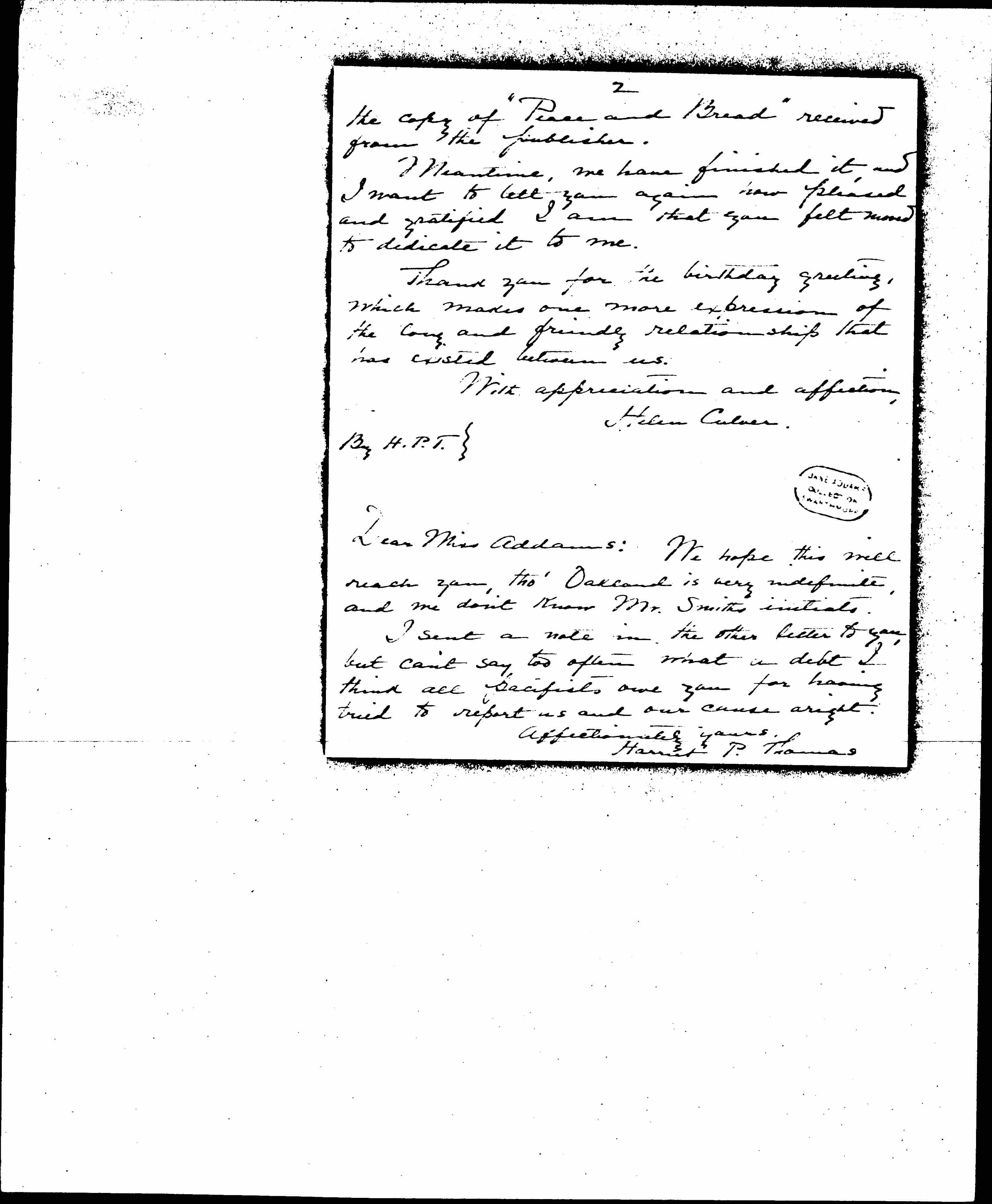 I had just sent you a letter to Hull House, acknowledging [page 2] the copy of “Peace and Bread” received from the publisher.