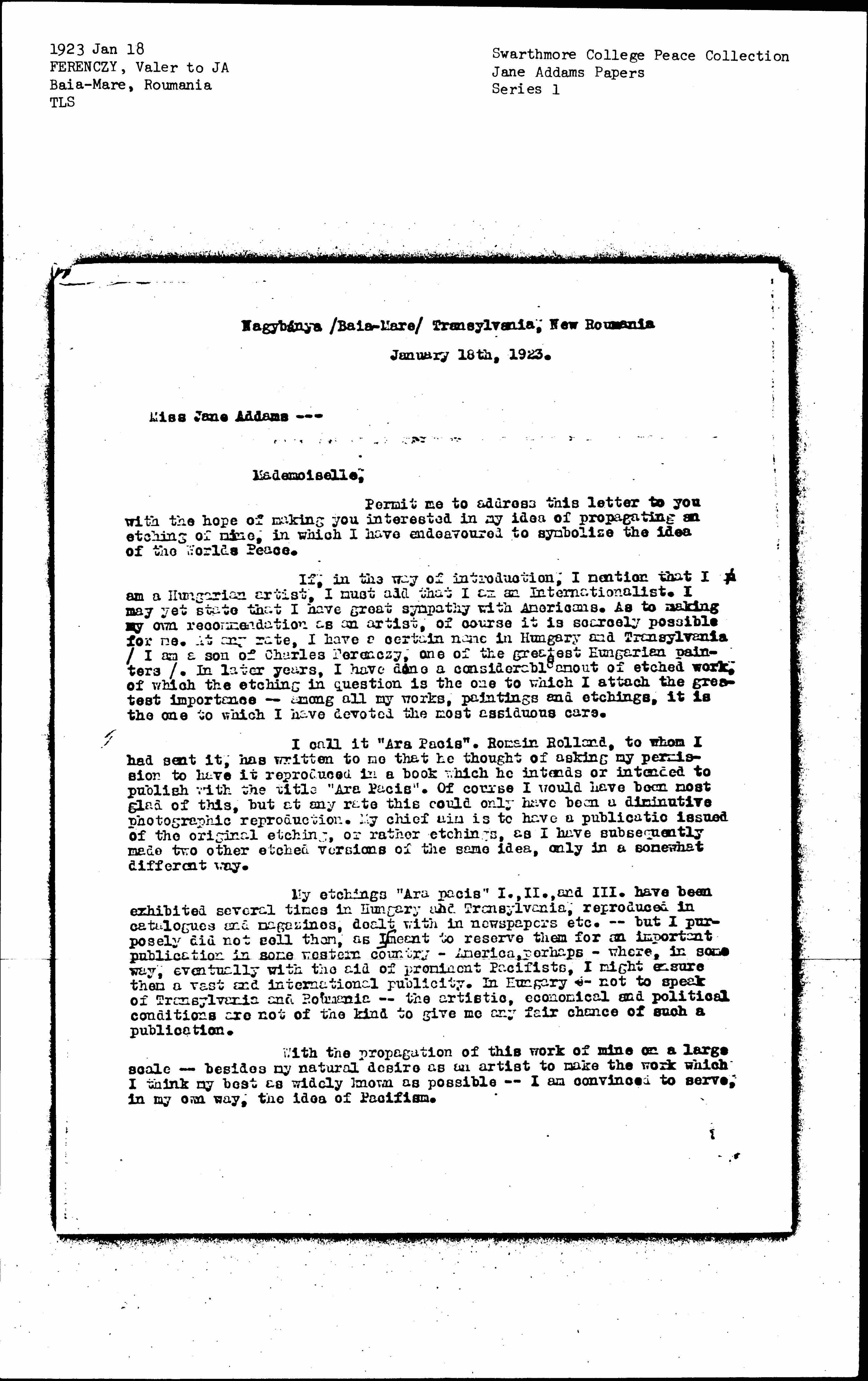 If, in the way of introduction, I mention that I am a Hungarian artist, I must add that I am an Internationalist. I may yet state that I have great sympathy with Americans. As to making my own recommendation as an artist, of course it is scarcely possible for me. At any rate, I have a certain name in Hungary and Transylvania (I am a son of Charles Ferenczy, one of the greatest Hungarian painters ). In later years, I have done a considerable [amount] of etched work, of which the etching in question is the one to which I attach the greatest importance -- among all my works, paintings and etchings, it is the one to which I have devoted the most assiduous care.