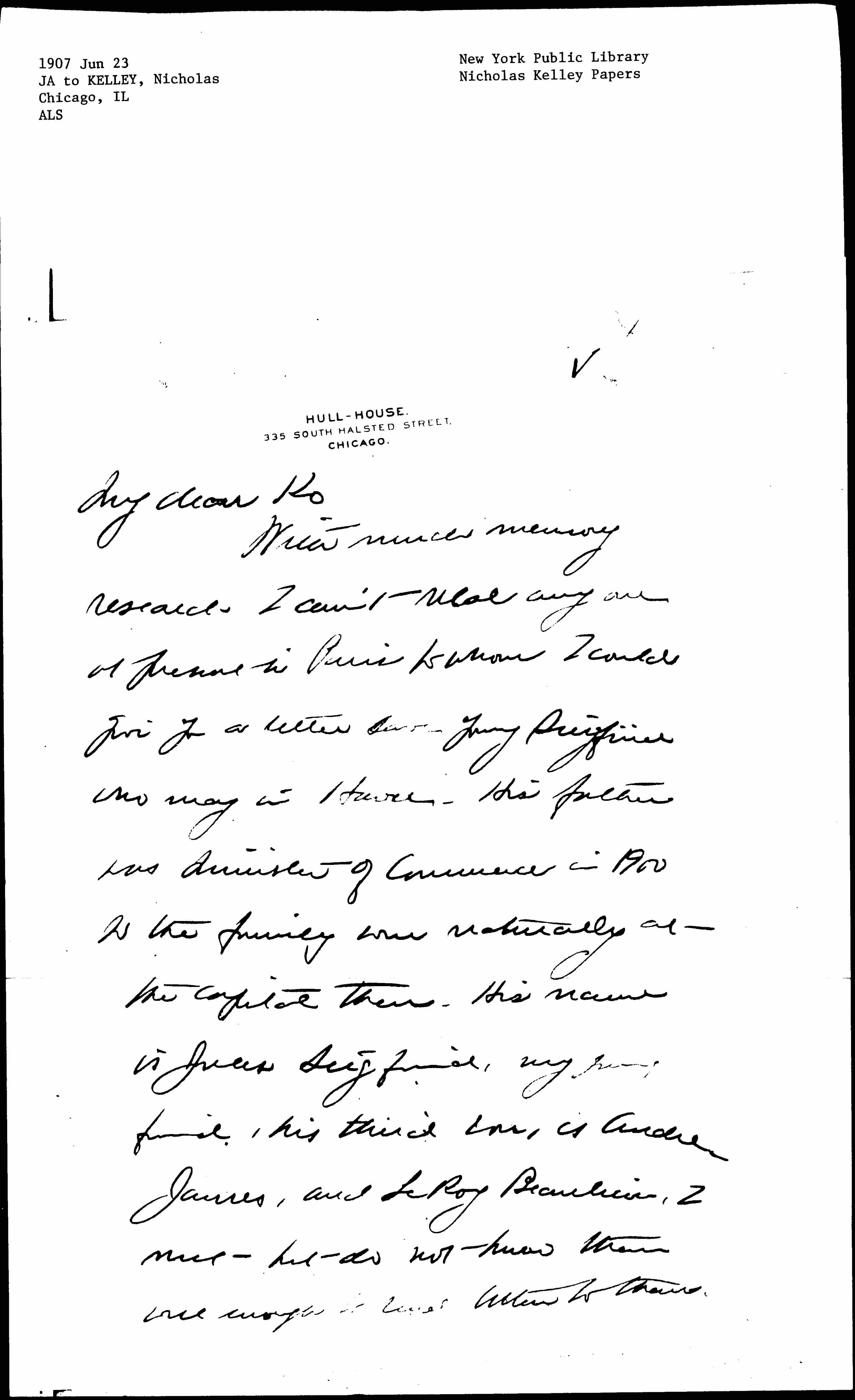 With much memory research, I can't [recall] anyone at present in Paris to whom I could give you a letter save young [Siegfried] who may in Havre. His father was Minister of Commerce in 1900 so the family were naturally at the capital then. His name is Jules Siegfried, my young friend, his third son, is Andre James, and LeRoy Beaulieu, I met but do not know them well enough to send letters to them. [page 2] The head of the Universite Populaire used to be a fine young Frenchman who was interested in Oxford, but I have forgotten [his?] name, and he doubtless has left long since. I am sending you a letter to Mr. H. G. Wells whom I hope will introduce you to other Fabians. With all Good Luck to you Always affectionately yours
