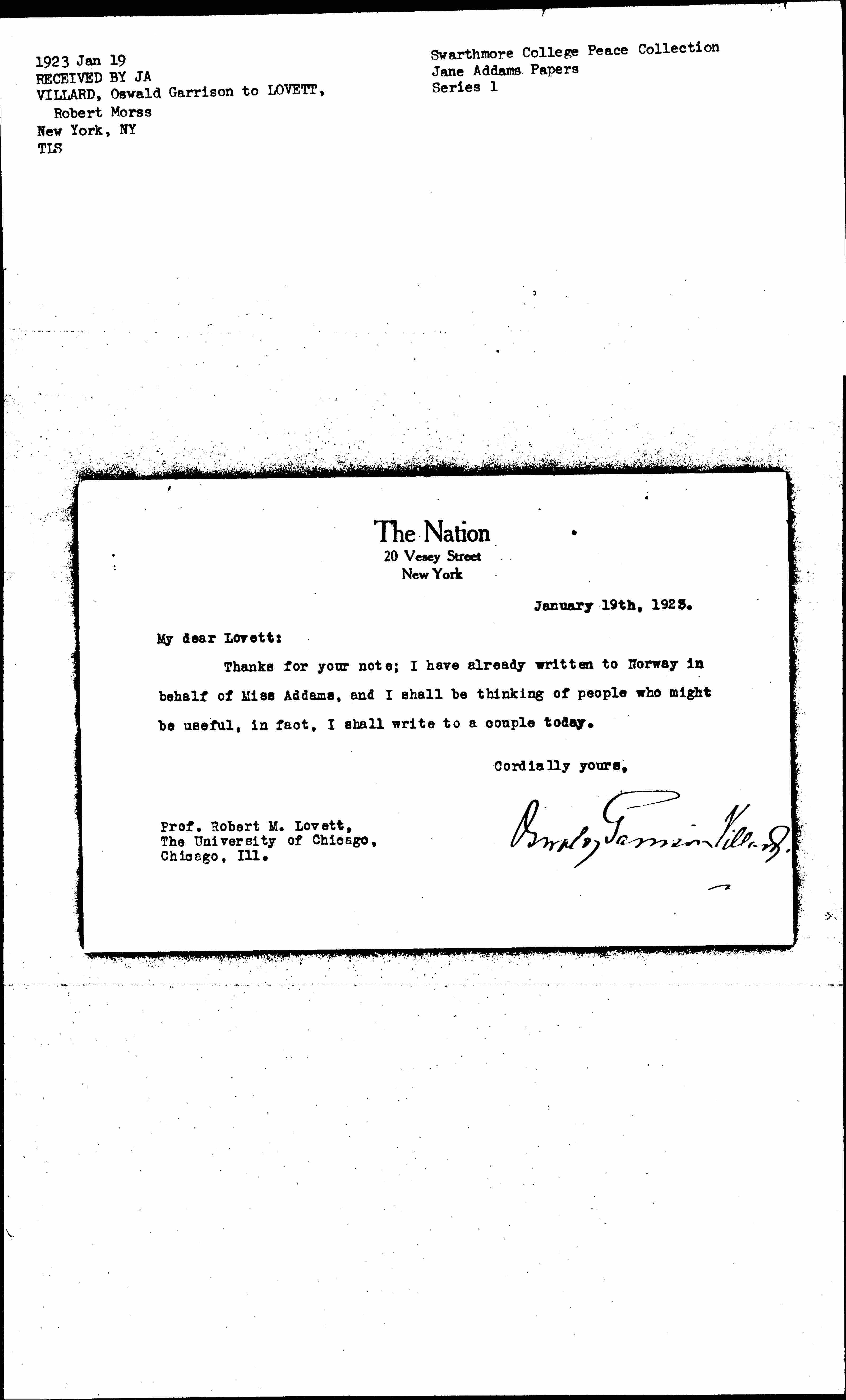 Thanks for your note; I have already written to Norway in behalf of Miss Addams, and I shall be thinking of people who might be useful, in fact, I shall write to a couple today.