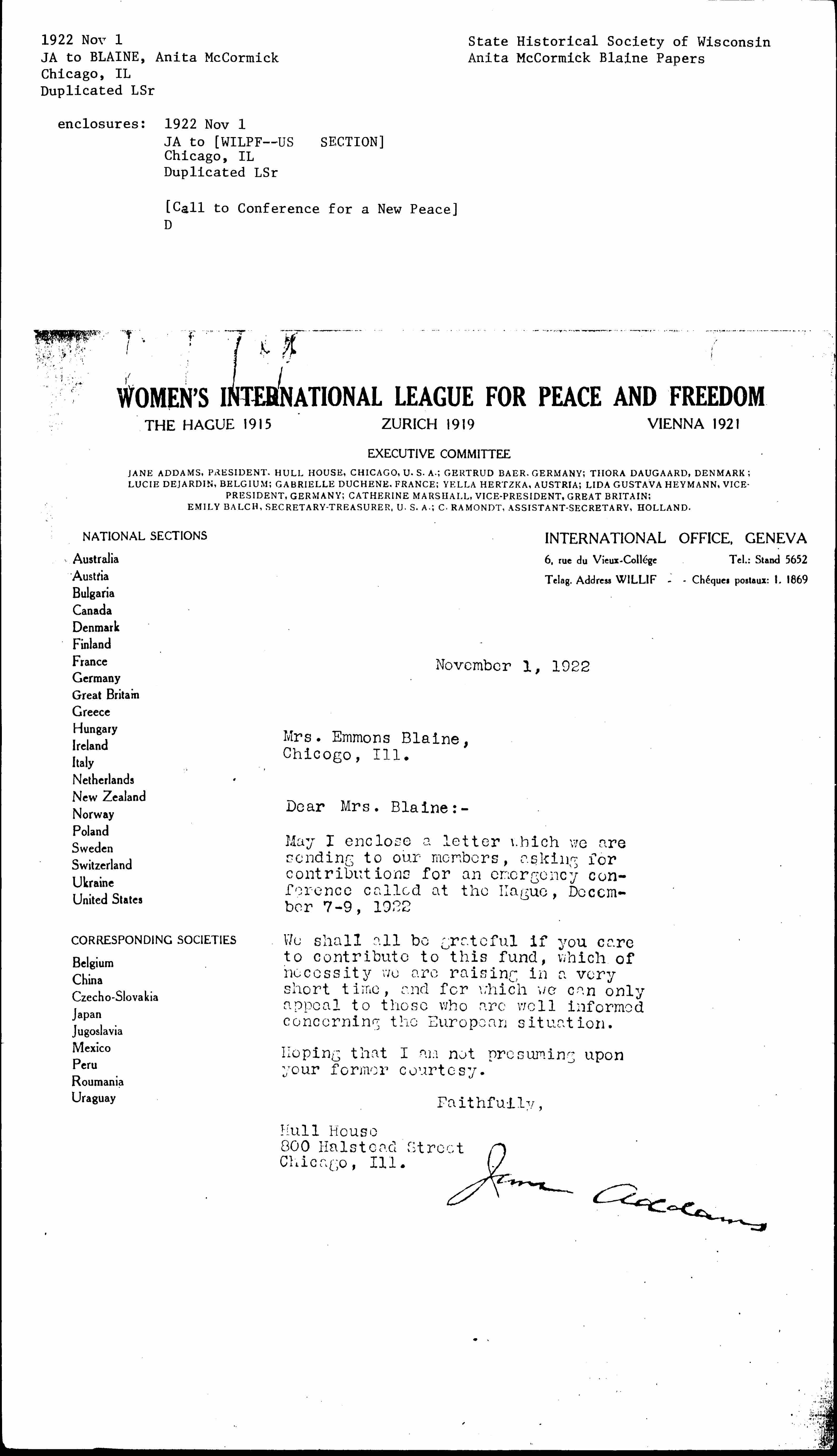 May I enclose a letter which we are sending to our members, asking for contributions for an emergency conference called at The Hague, December 7-9, 1922.