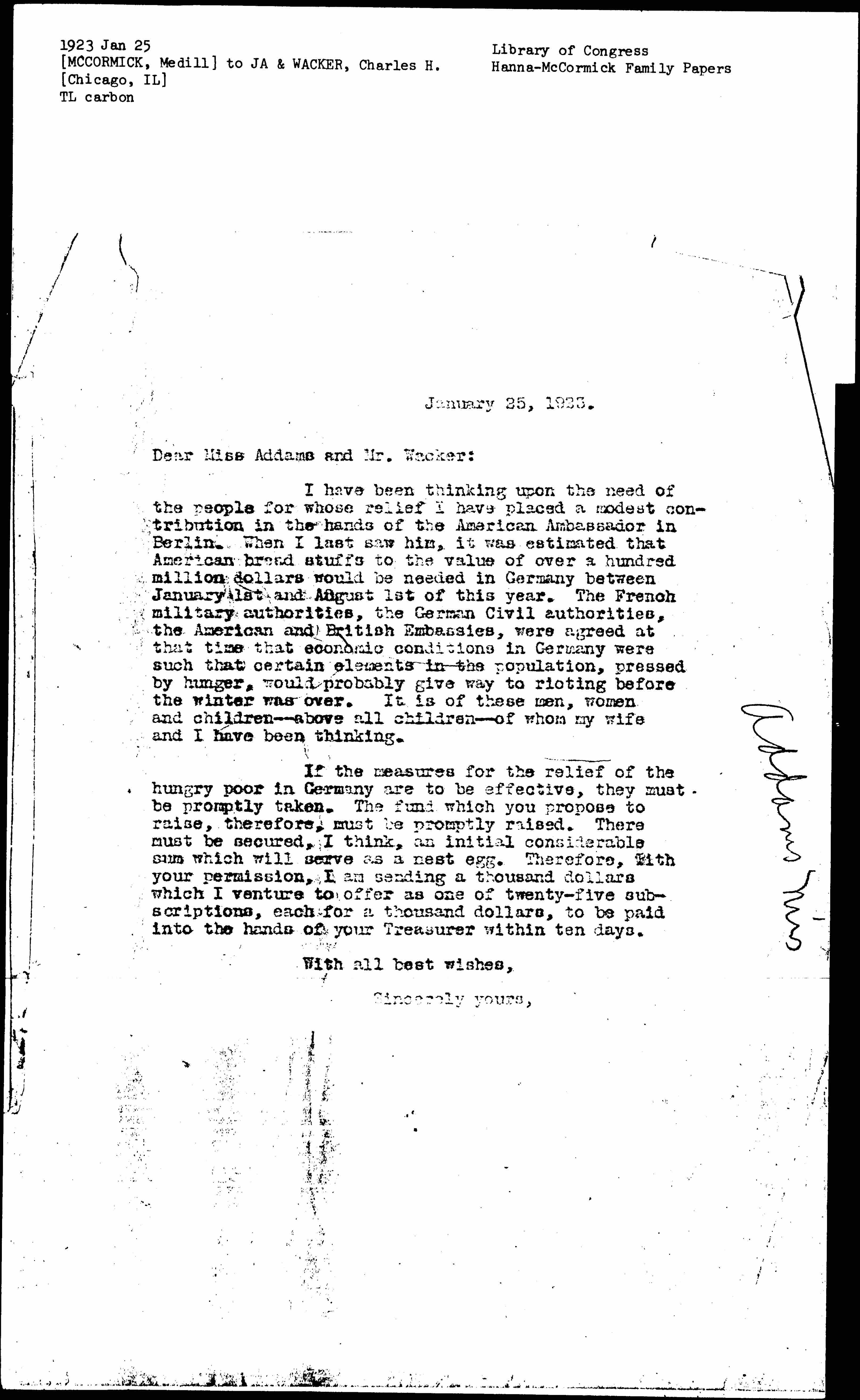 If the measures for the relief of the hungry poor in Germany are to be effective, they must be promptly taken. The fund which you proposed to raise, therefore, must be promptly raised. There must be secured, I think, an initial considerable sum which will serve as a nest egg. Therefore, with your permission, I am sending a thousand dollars which I venture to offer as one of twenty-five subscriptions, each for a thousand dollars, to be paid into the hands of your Treasurer within ten days.