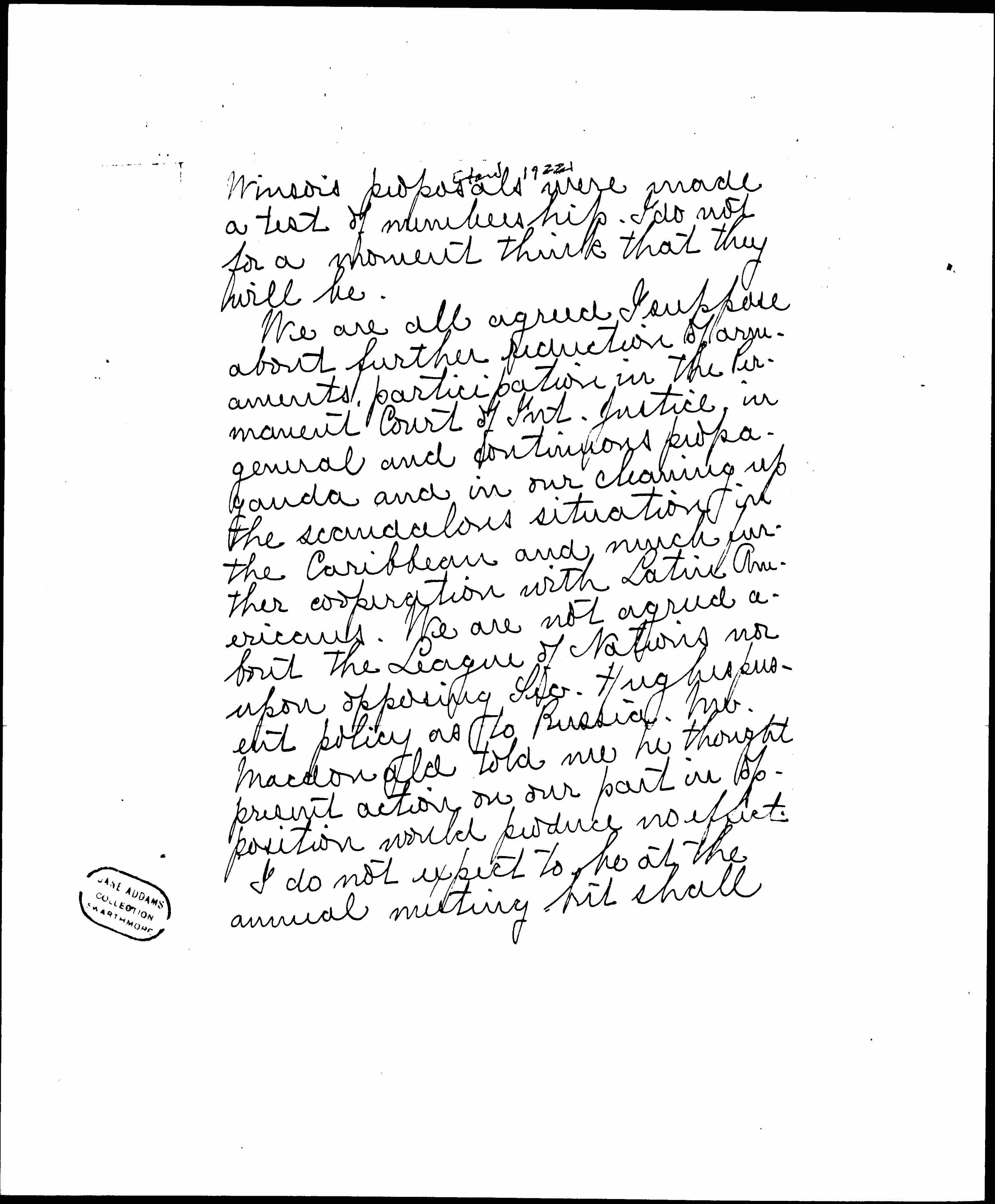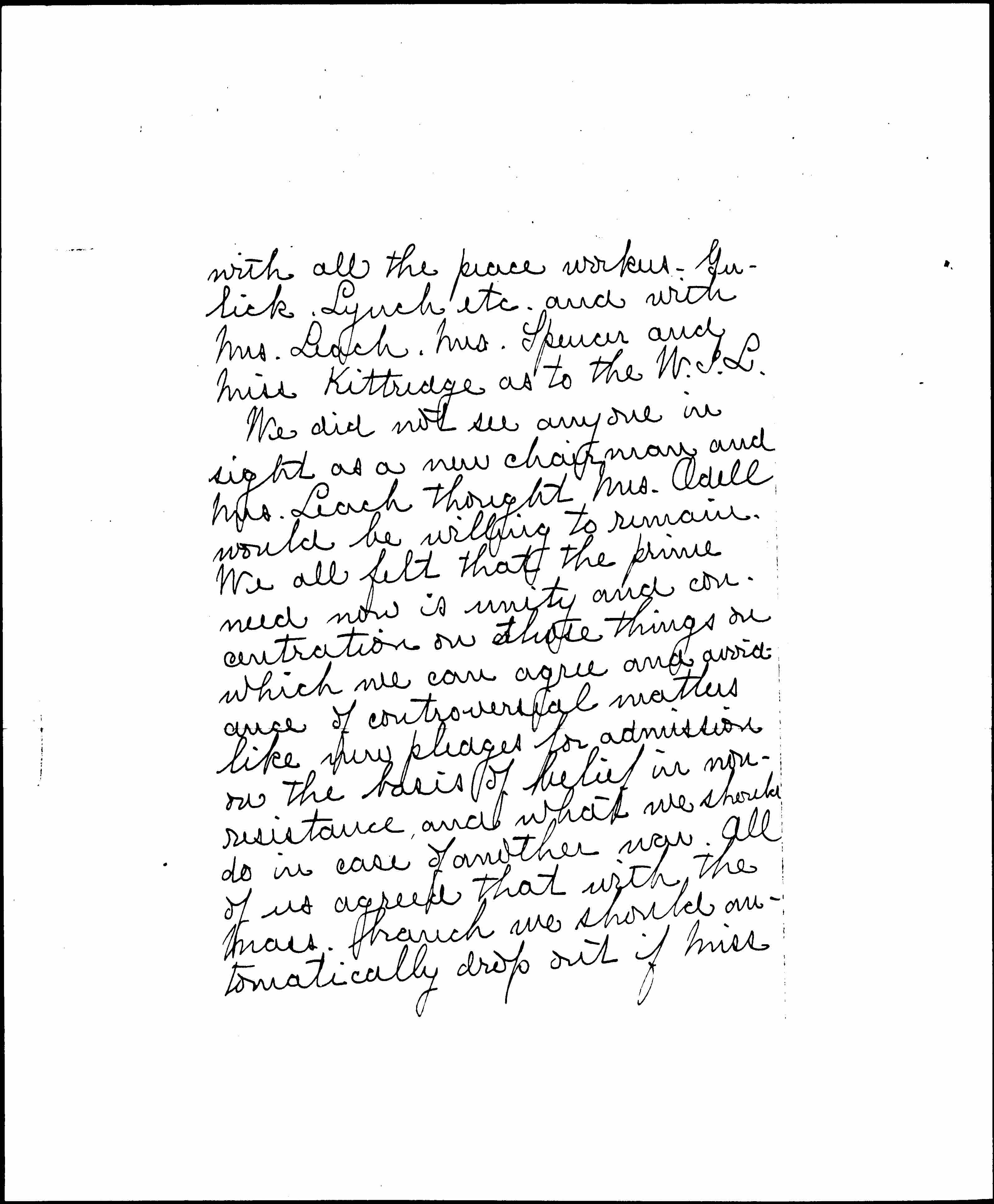 We did not see anyone in sight as a new chairman and Mrs. Leach thought Mrs. Odell would be willing to remain. We all felt that the prime need now is unity and concentration on those things on which we can agree and avoidance of controversial matters like new pledges for admission on the basis of belief in nonresistance, and what we should do in case of another war. All of us agreed that with the Mass. branch we should automatically drop out if Miss [page 3] Winsor's proposals were made a test of membership. I do not for a moment think that they will be.
