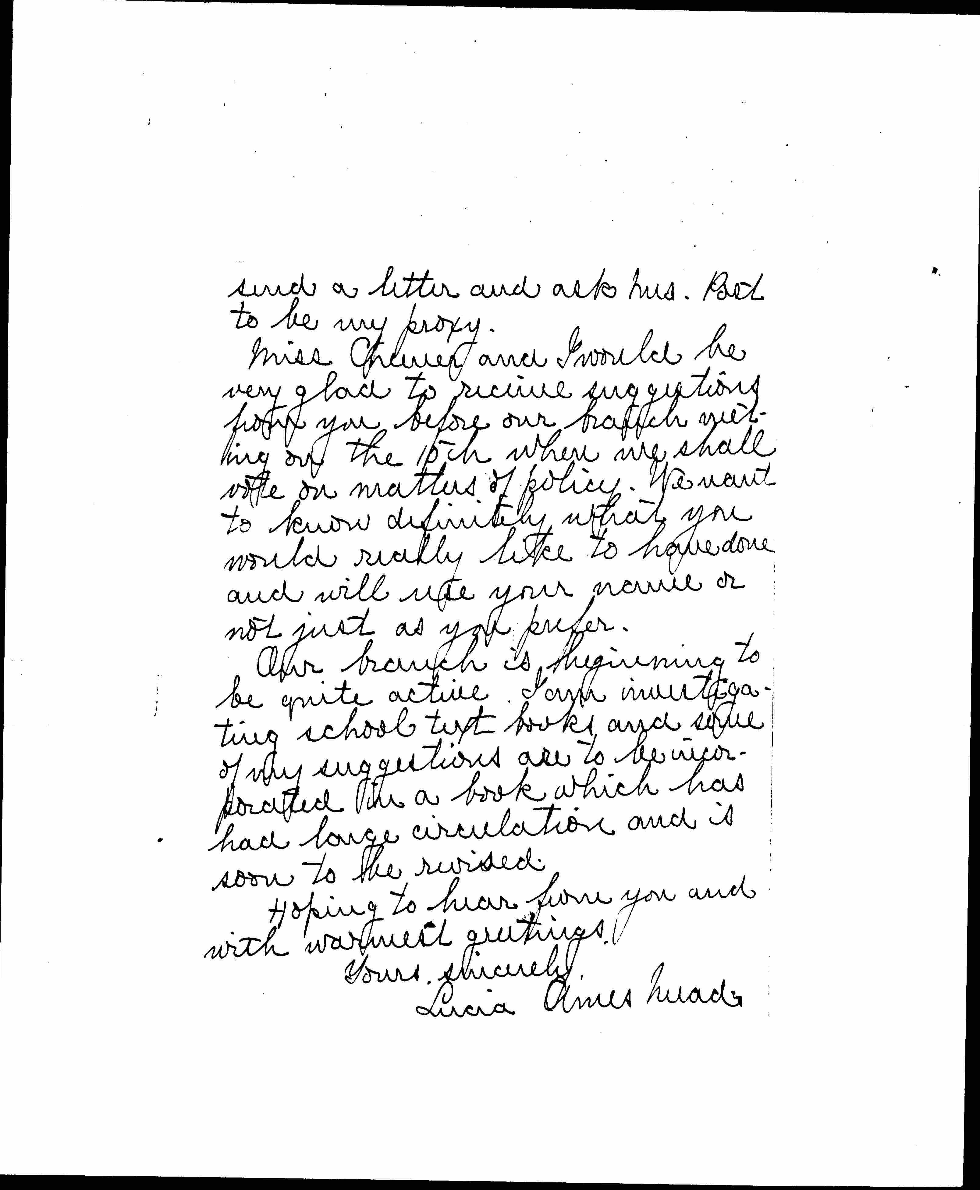 Miss Cheever and I would be very glad to receive suggestions from you before our branch meeting on the 15th when we shall vote on matters of policy. We want to know definitely what you would really like to have done and will use your name or not just as you prefer.
