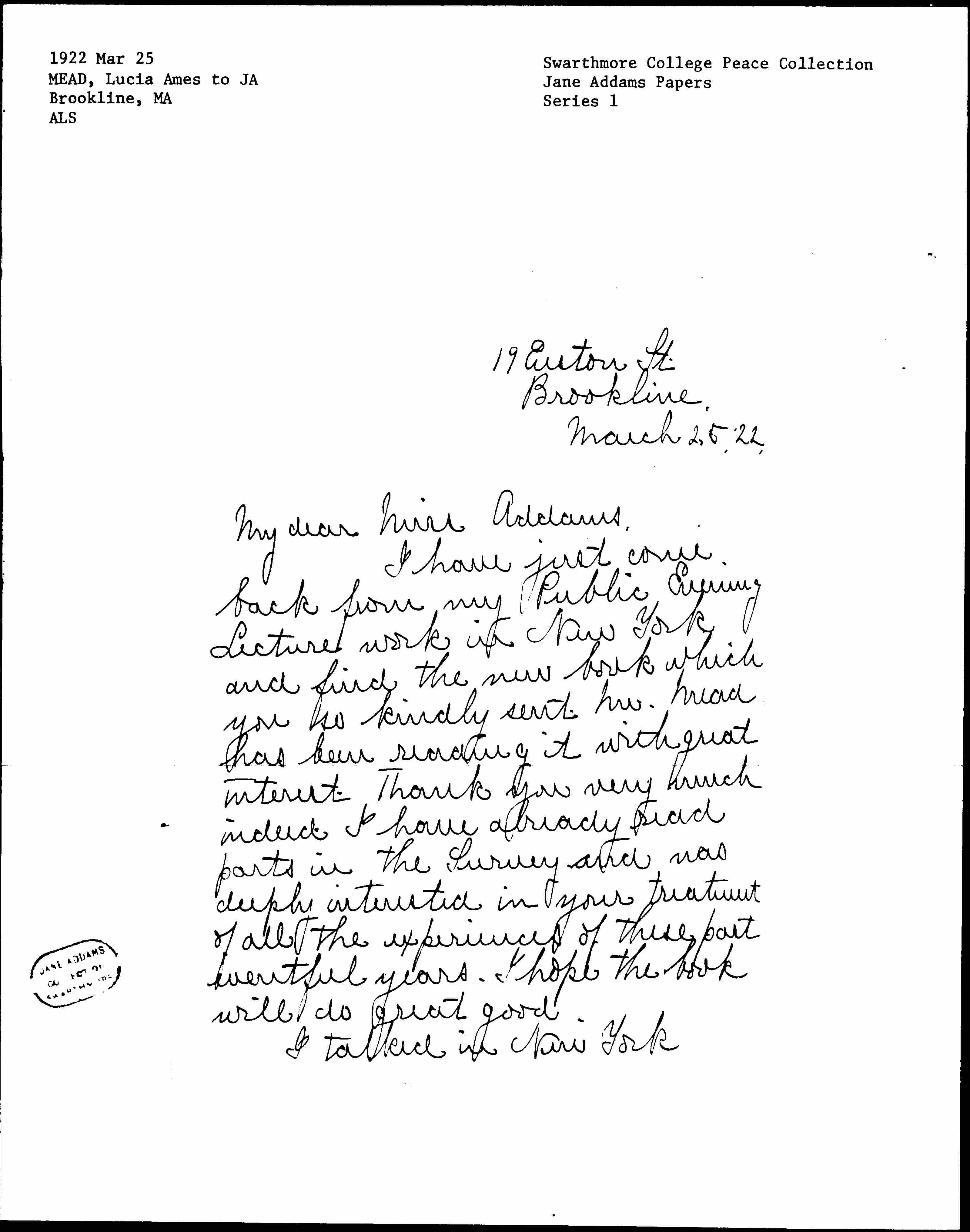 I talked in New York [page 2] with all the peace workers -- Gulick, Lynch etc. and with Mrs. Leach, Mrs. Spencer and Miss Kittredge as to the W.I.L.