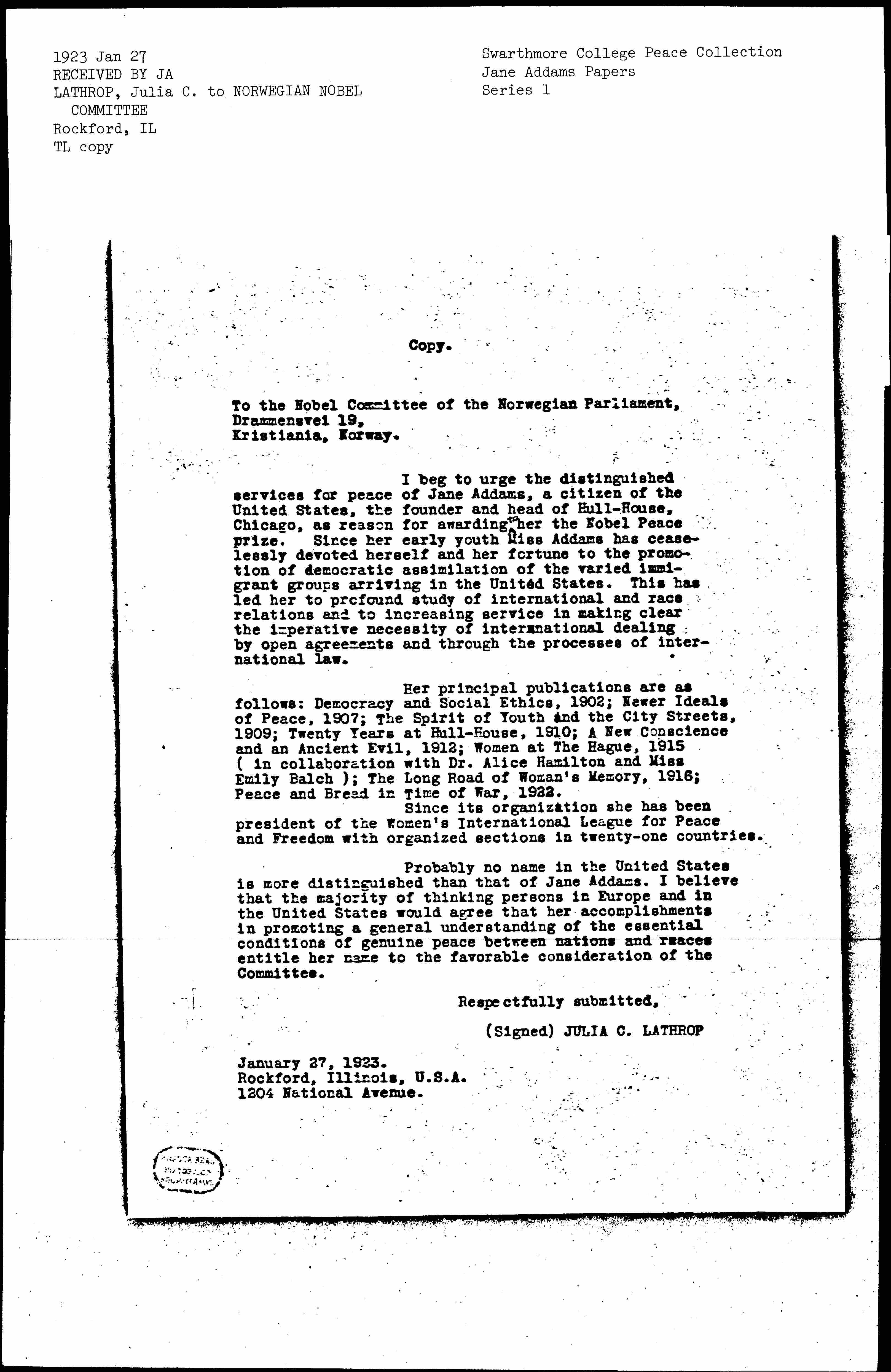 I beg to urge the distinguished services for peace of Jane Addams, a citizen of the United States, the founder and head of Hull-House, Chicago, as reason for awarding ↑to↓ her the Nobel Peace prize. Since her early youth Miss Addams has ceaselessly devoted herself and her fortune to the promotion of democratic assimilation of the varied immigrant groups arriving in the United States. This has led her to profound study of international and race relations and to increasing service in making clear the imperative necessity of international dealing by open agreements and through the processes of international law.