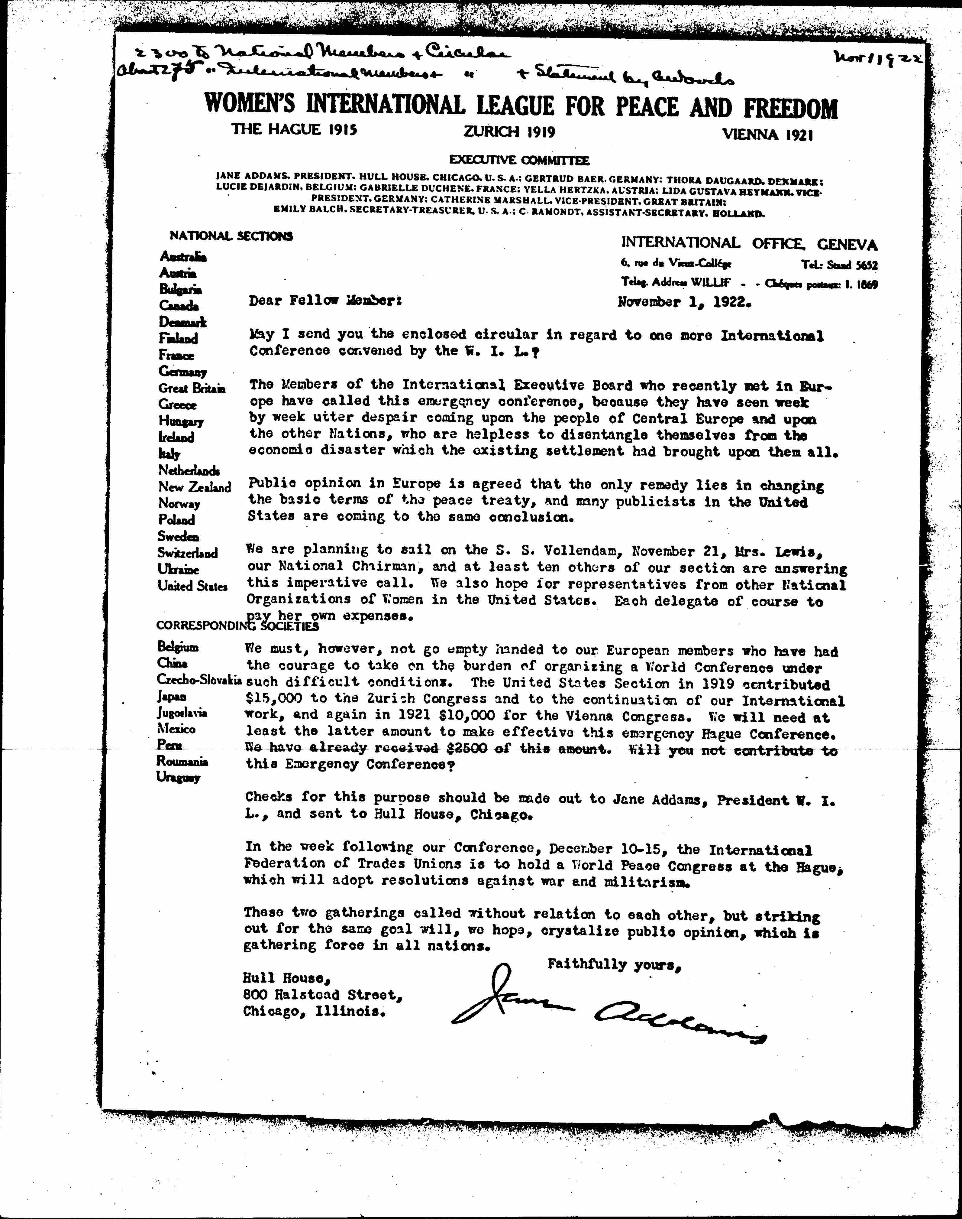 We must, however, not go empty handed to our European members who have had the courage to take on the burden of organizing a World Conference under such difficult conditions. The United States Section in 1919 contributed $15,000 to the Zurich Congress and to the continuation of our International work, and again in 1921 $10,000 for the Vienna Congress. We will need at least the latter amount to make effective this emergency Hague Conference. We have already received $2500 of this amount. Will you not contribute to this Emergency Conference?