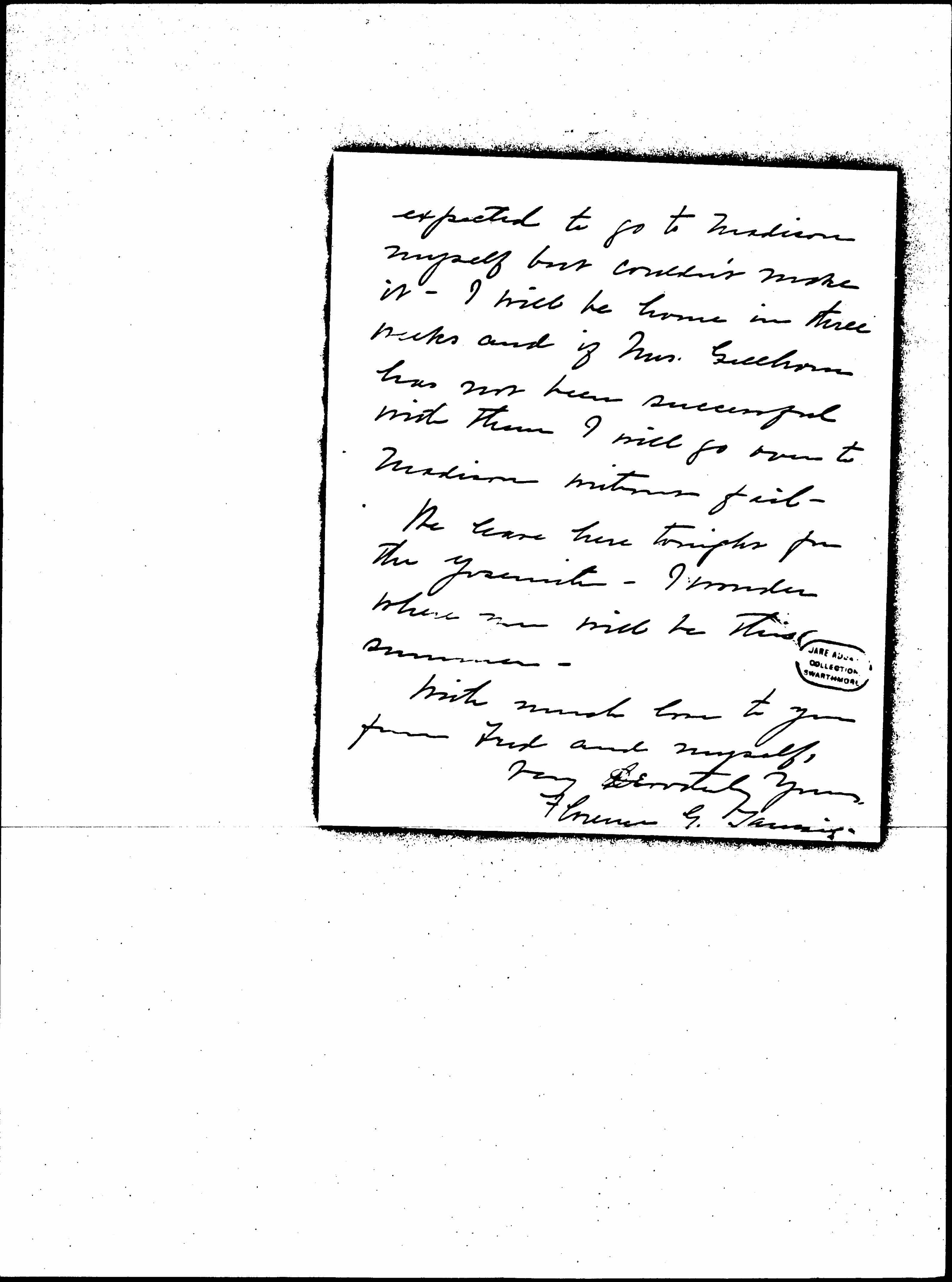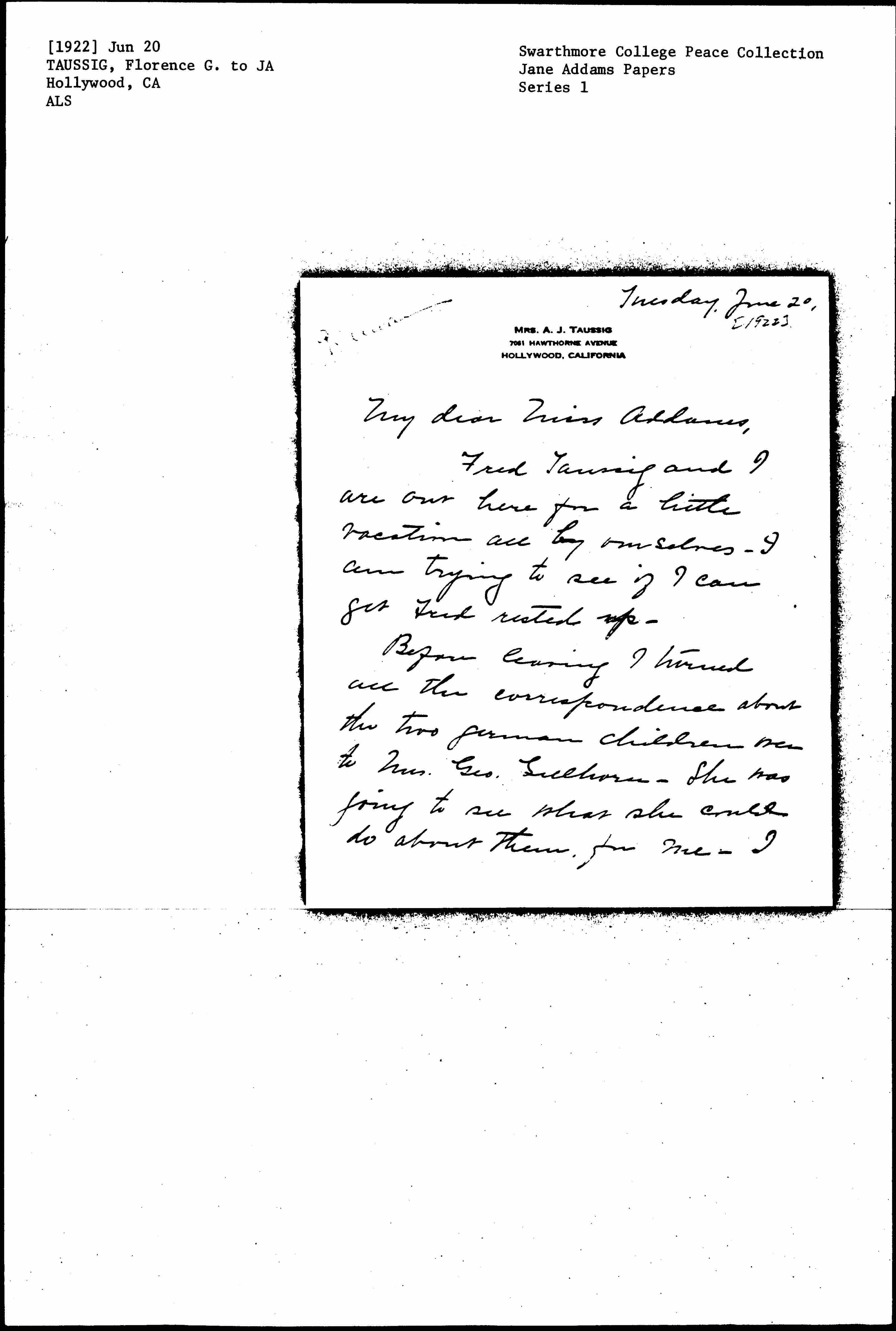 Before leaving I turned all the correspondences about the two German children over to Mrs. Geo. Gellhorn. She was going to see what she could do about them for me. I [page 2] expected to go to Madison myself but couldn’t make it. I will be home in three weeks and if Mrs. Gellhorn has not been successful with them I will go over to Madison without fail.