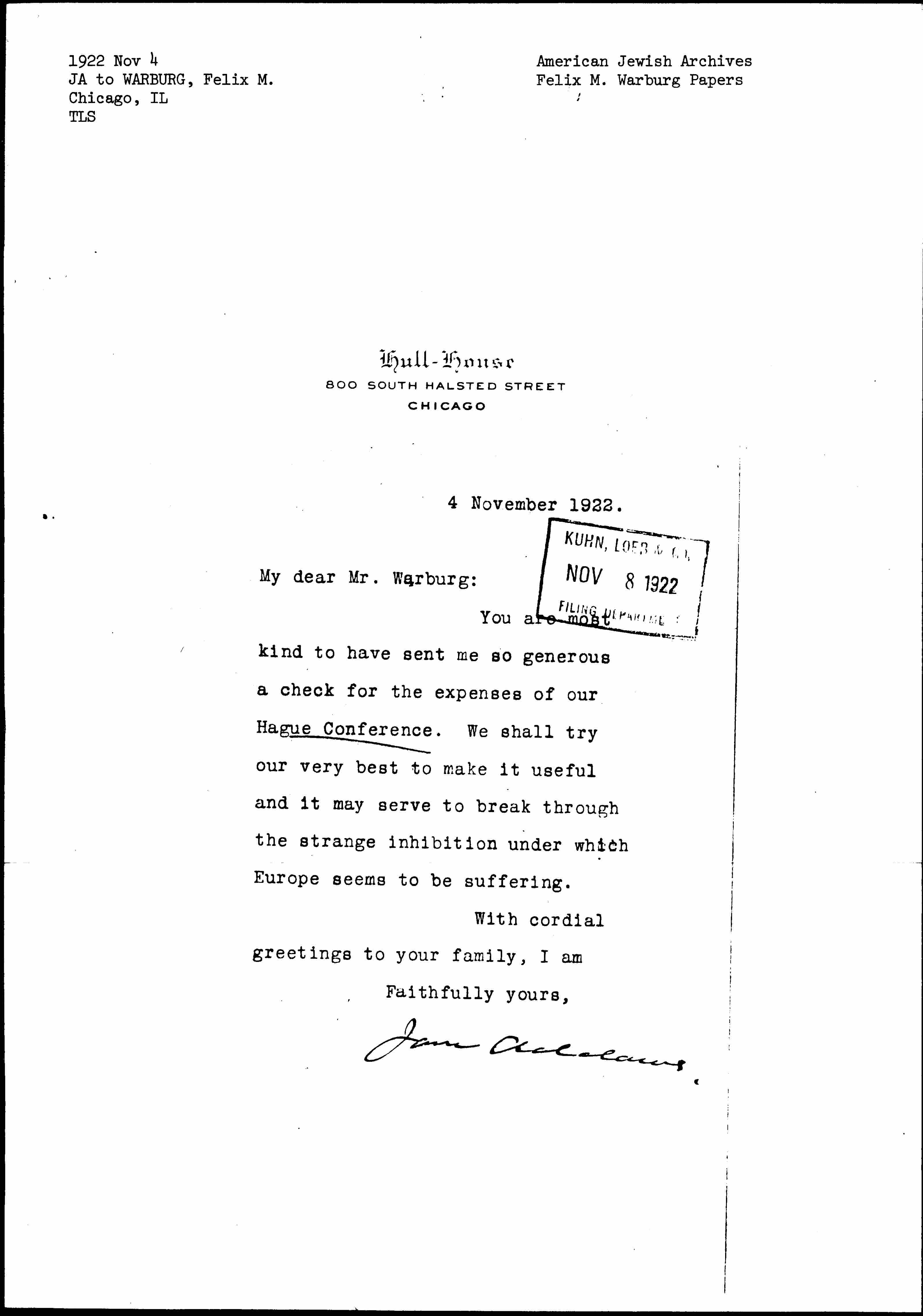 Jane Addams. [signed]