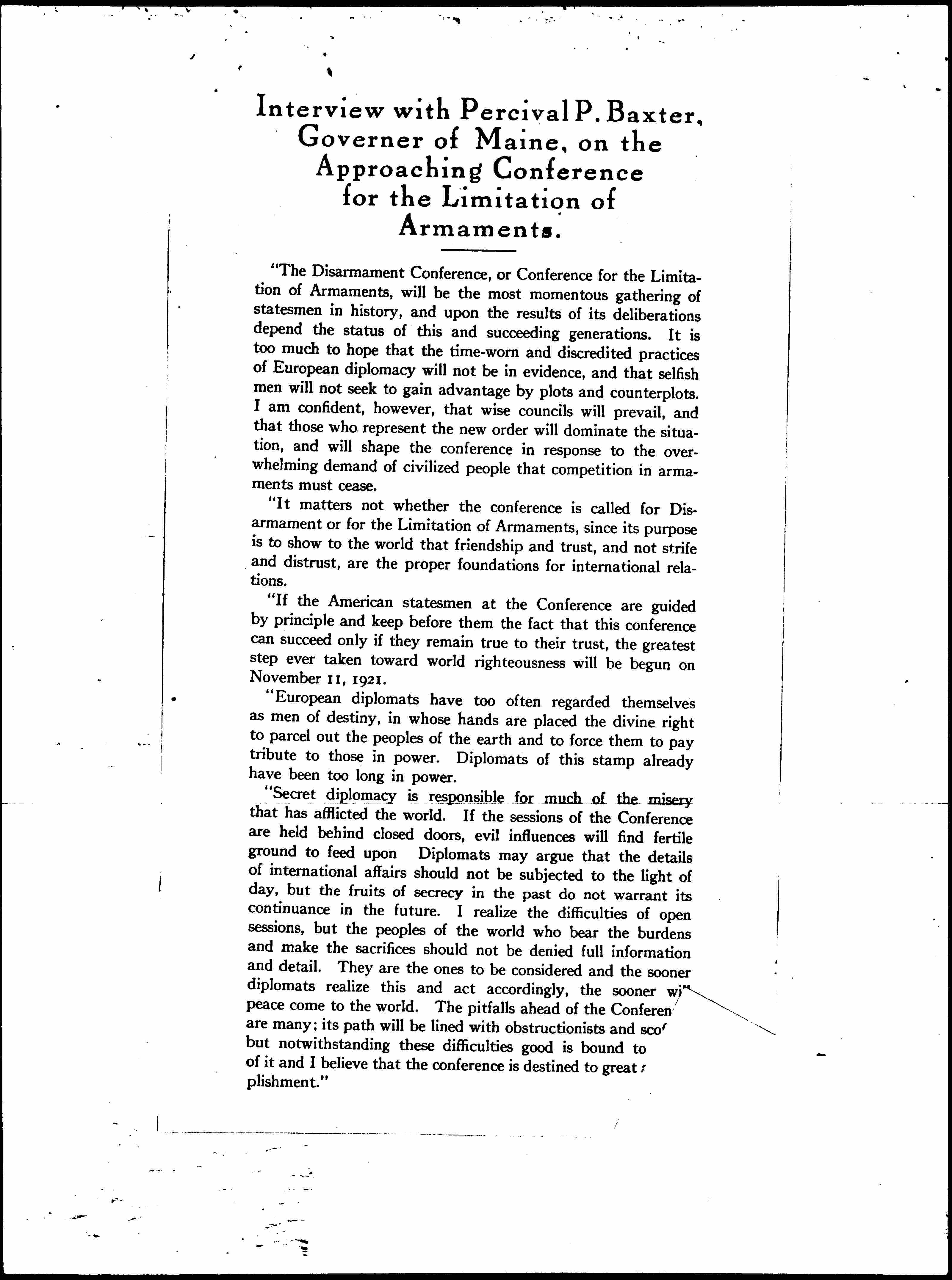 Interview with Percival P. Baxter, Governor of Maine, on the Approaching Conference for the Limitation of Armaments.