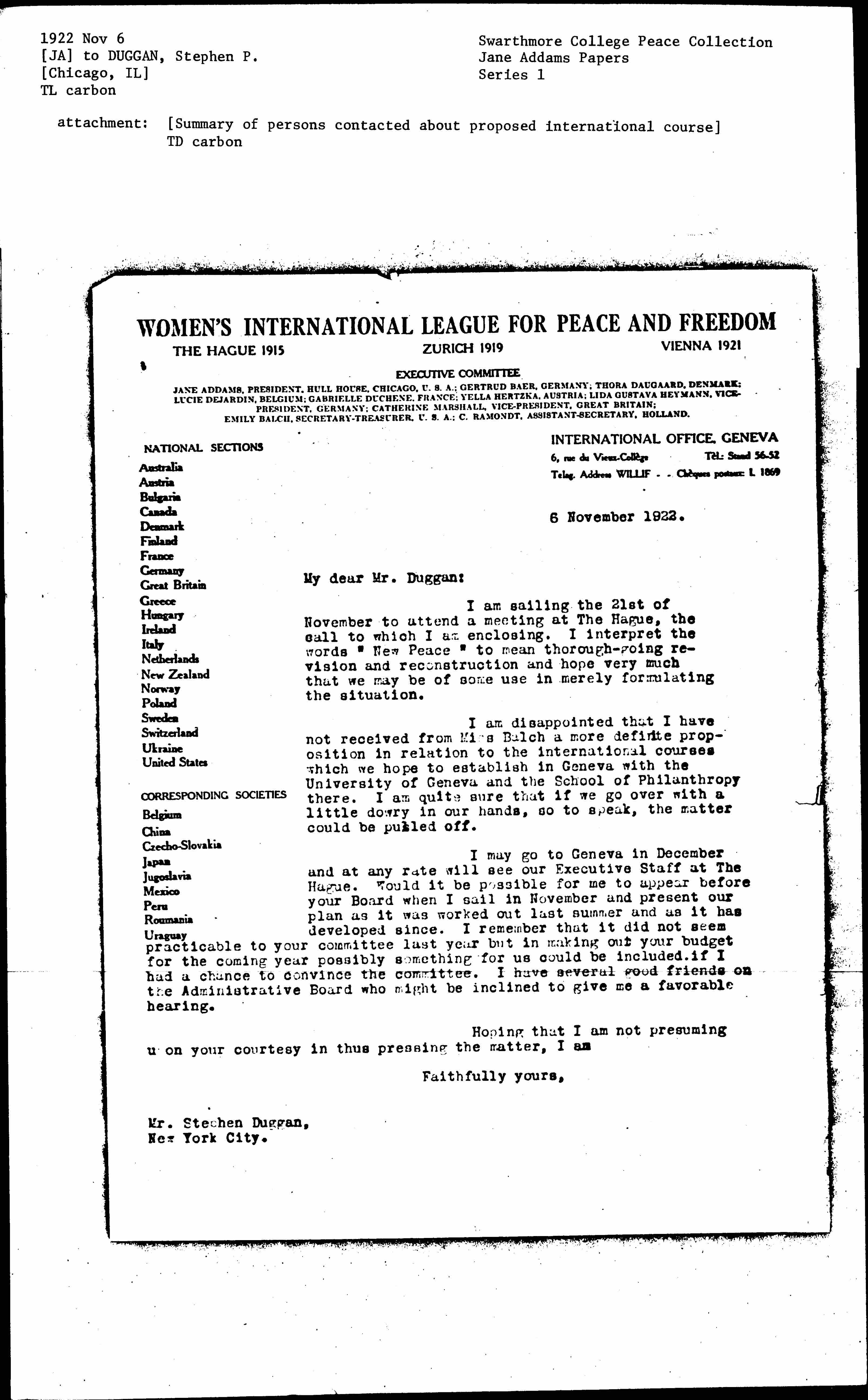 I may go to Geneva in December and at any rate will see our Executive Staff at The Hague. Would it be possible for me to appear before your Board when I sail in November and present our plan as it was worked out last summer and as it has developed since. I remember that it did not seem practicable to your committee last year but in making out your budget for the coming year possibly something for us could be included if I had a chance to convince the committee I have several good friends on the Administrative Board who might be inclined to give me a favorable hearing.