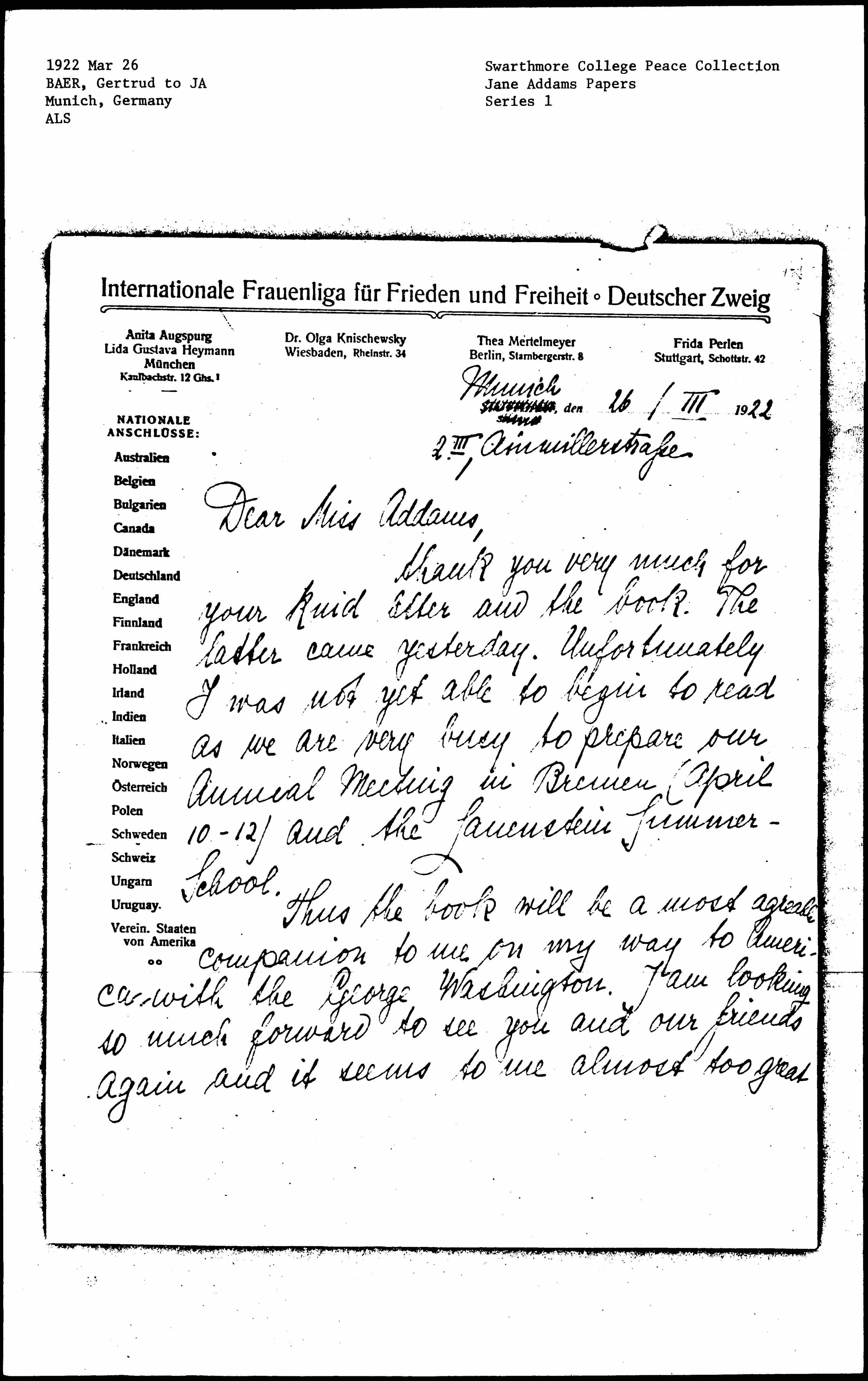 Thus the book will be a most [agreeable] companion to me on my way to America with the George Washington. I am looking so much forward to see you and our friends again and it seems to me almost too great [page 2] a privilege to be the first woman of the German Section to go to America after this war.