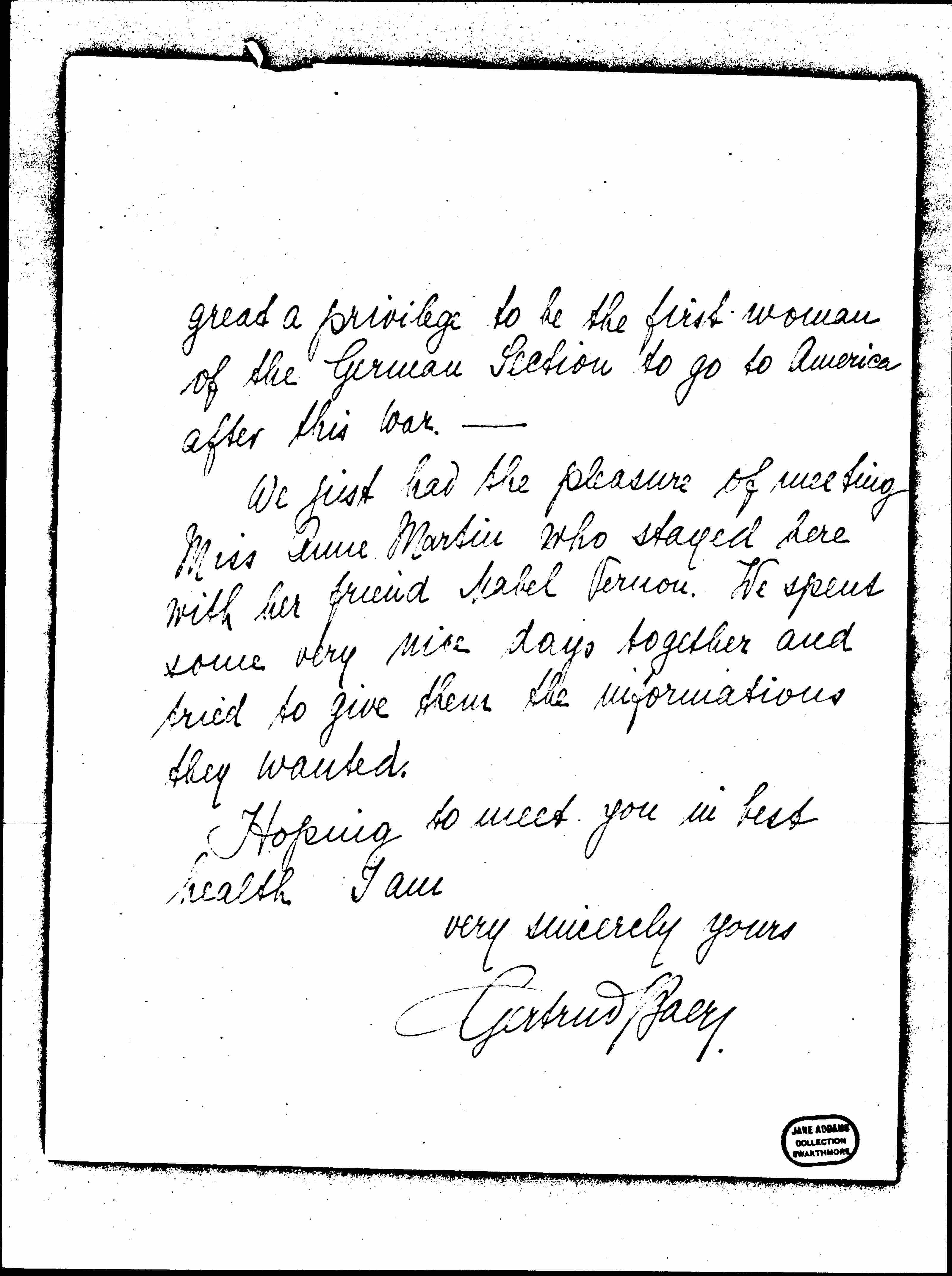 We just had the pleasure of meeting Miss Anne Martin who stayed here with her friend Mabel Vernon. We spent some very nice days together and tried to give them the [information] they wanted.