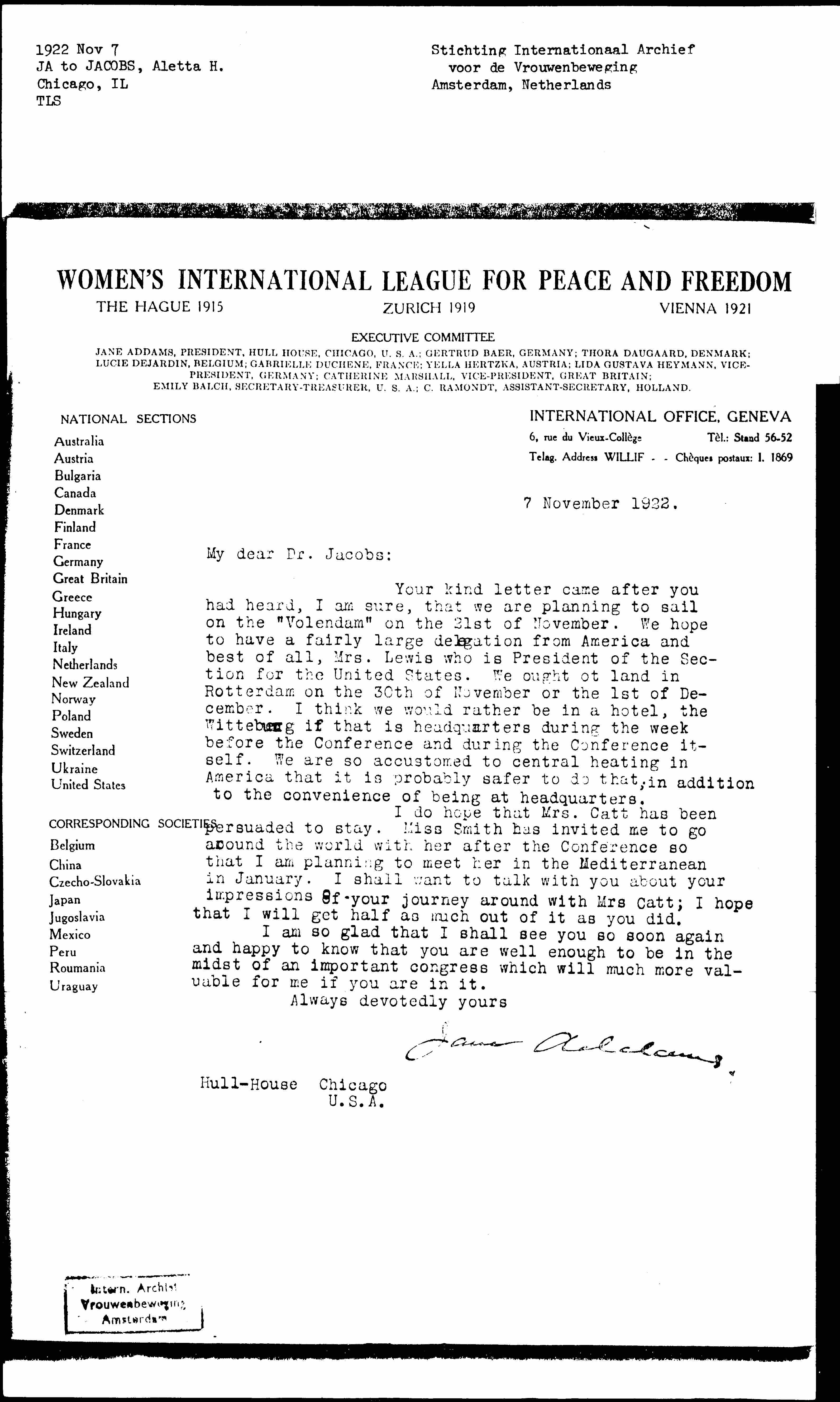 Your kind letter came after you had heard, I am sure, that we are planning to sail on the "Volendam" in the 21st of November. We hope to have a fairly large delegation from America and best of all, Mrs. Lewis who is President of the Section for the United States. We ought to land in Rotterdam on the 30th of November or the 1st of December. I think we would rather be in a hotel, the [Wittebrug] if that is headquarters during the week before the Conference and during the Conference itself. We are so accustomed to central heating in American that it is probably safer to do that, in addition to the convenience of being at headquarters.