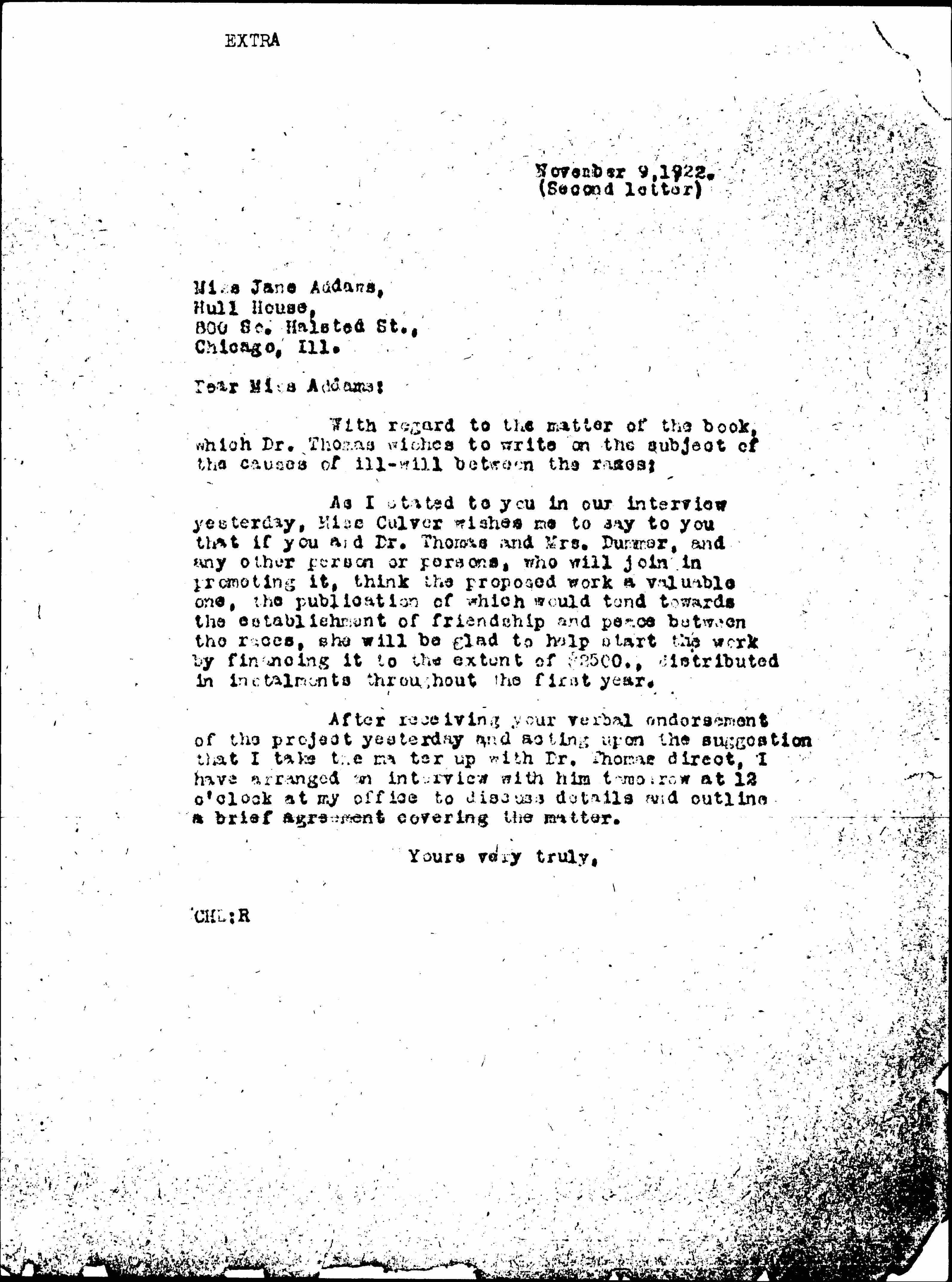 As I stated to you in our interview yesterday, Miss Culver wishes me to say to you that if you [and] Dr. Thomas and Mrs. Dummer, and any other person or persons, who will join in promoting it, think the proposed work a valuable one, the publication of which would tend towards the establishment of friendship and peace between the races, she will be glad to help start the work by financing it to the extent of $2500, distributed in [installments] throughout the first year.
