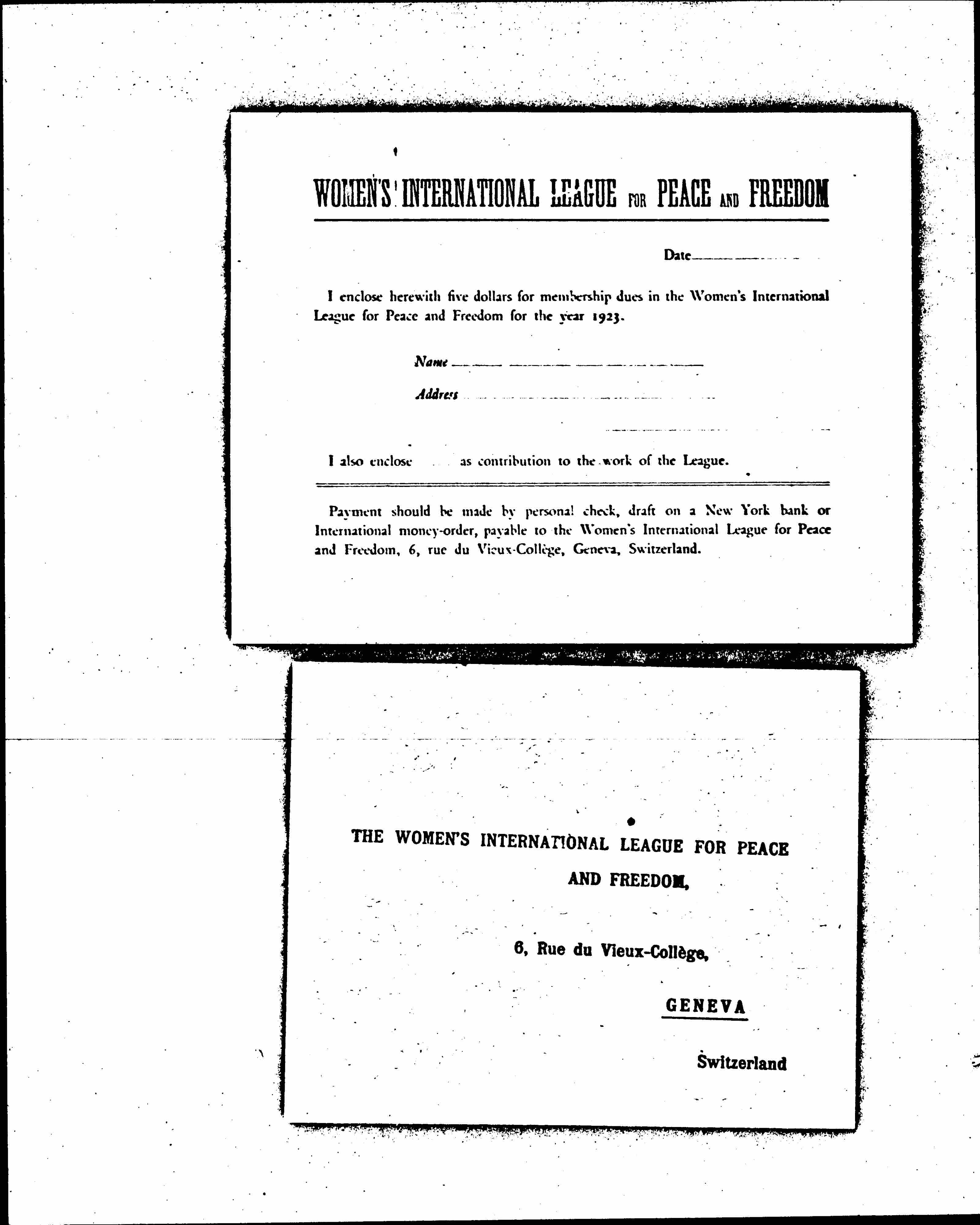 Payment should be made by personal check, draft on a New York bank or International money-order, payable to the Women's International League for Peace and Freedom, 6, rue du Vieux-Collège, Geneva, Switzerland. [page 2]
