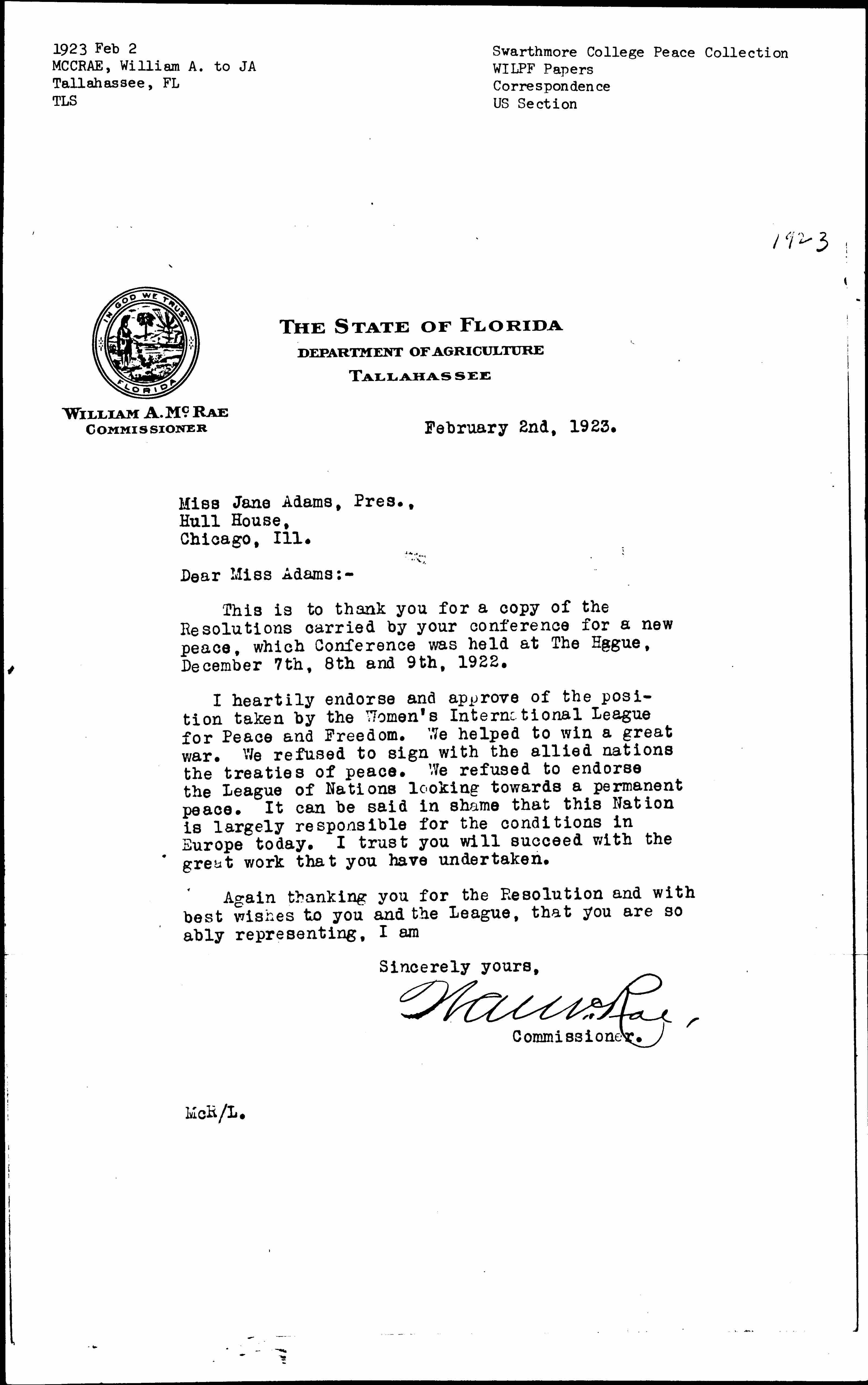 I heartily endorse and approve of the position taken by the Women's International League for Peace and Freedom. We helped to win a great war. We refused to sign with the allied nations the treaties of peace. We refused to endorse the League of Nations looking towards a permanent peace. It can be said in shame that this Nation is largely responsible for the conditions in Europe today. I trust you will succeed with the great work that you have undertaken.