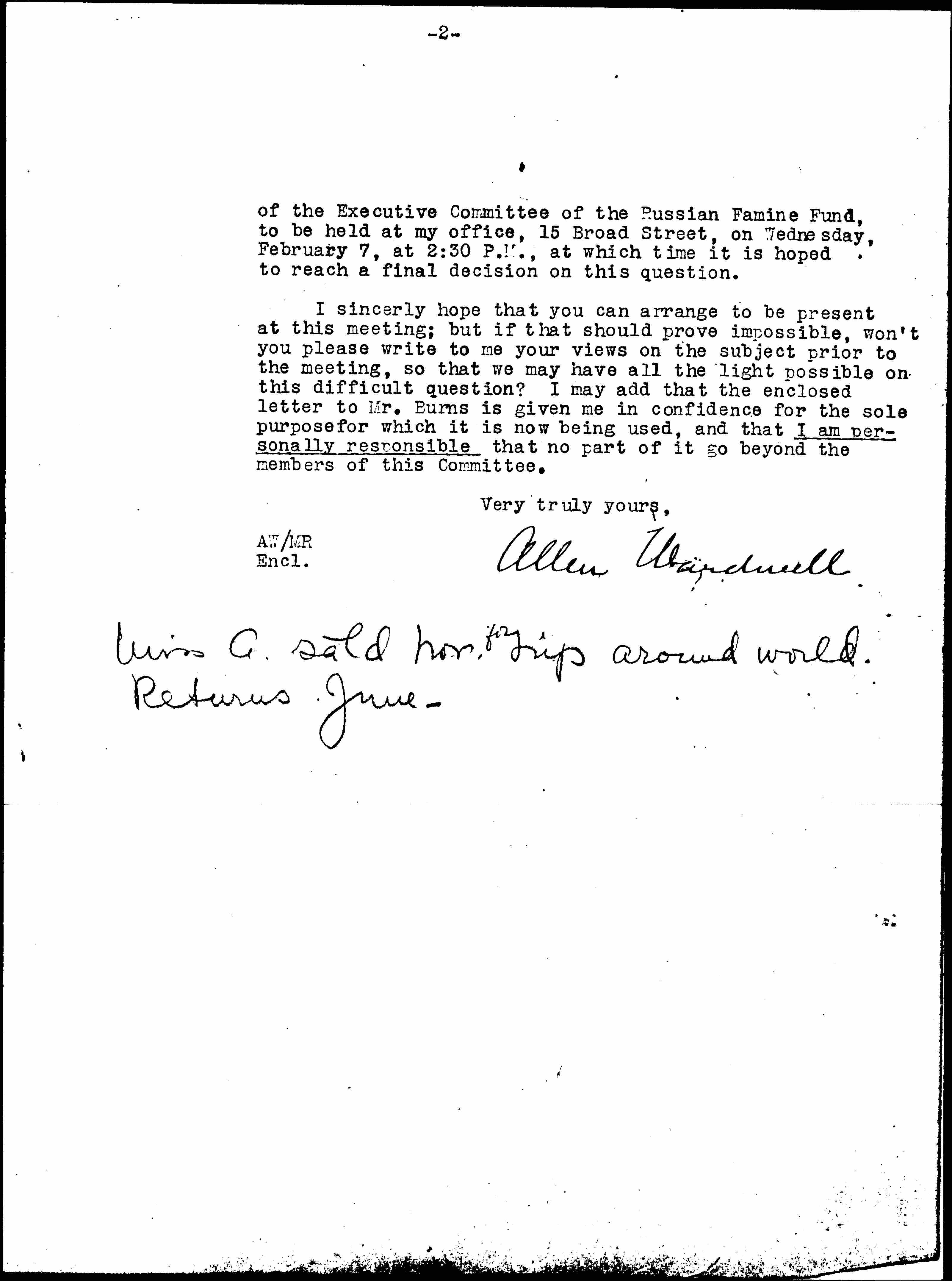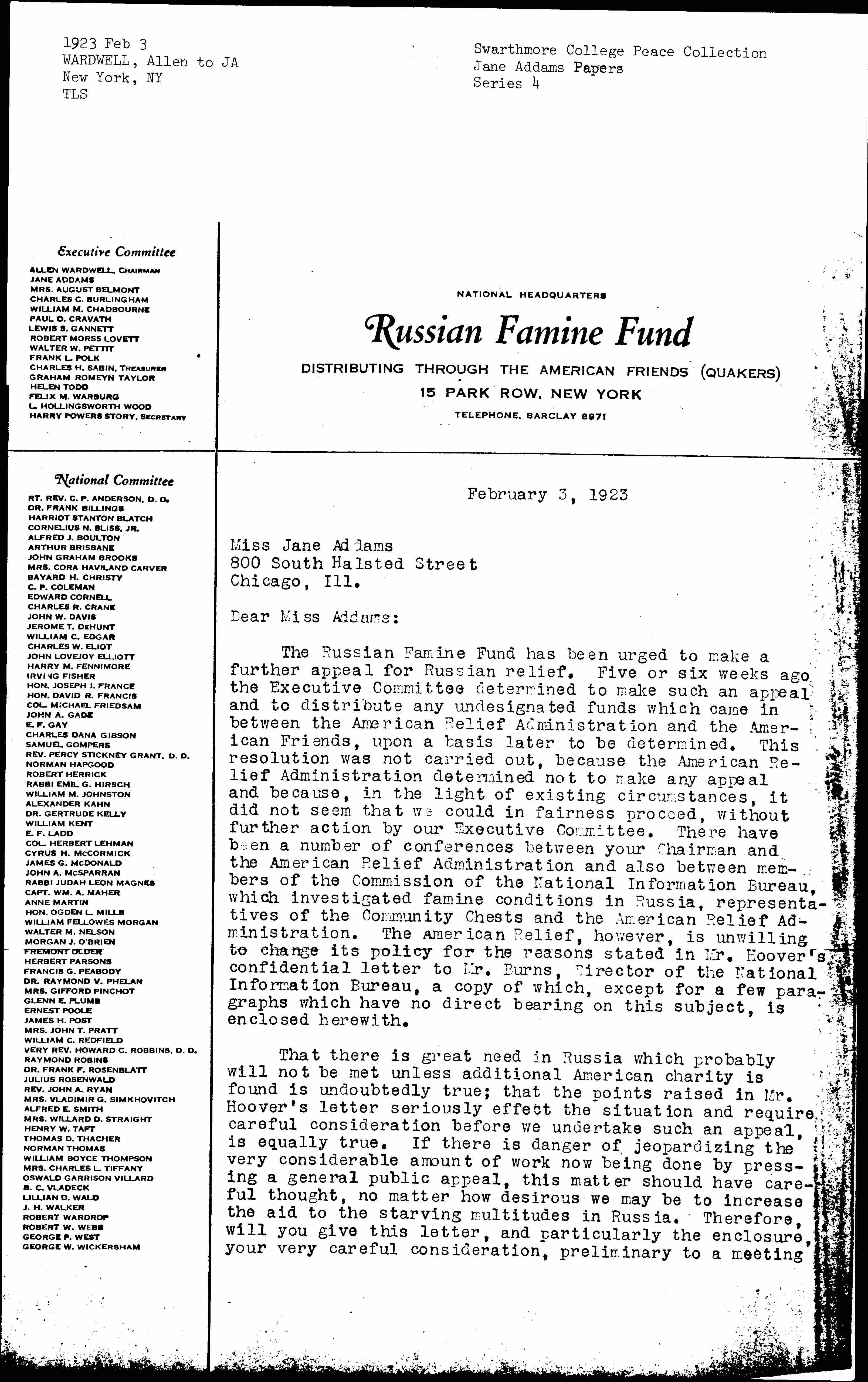 That there is great need in Russia which probably will not be met unless additional American charity is found is undoubtedly true; that the points raised in Mr. Hoover's letter seriously [affect] the situation and require careful consideration before we undertake such an appeal, is equally true. If there is danger of jeopardizing the very considerable amount of work now being done by pressing a general public appeal, this matter should have careful thought, no matter how desirous we may be to increase the aid to the starving multitudes in Russia. Therefore, will you give this letter, and particularly the enclosure, your very careful consideration, preliminary to a meeting [page 2] of the Executive Committee of the Russian Famine Fund, to be held at my office, 15 Broad Street, on Wednesday, February 7, at 2:30 P.M., at which time it is hoped to reach a final decision on this question.
