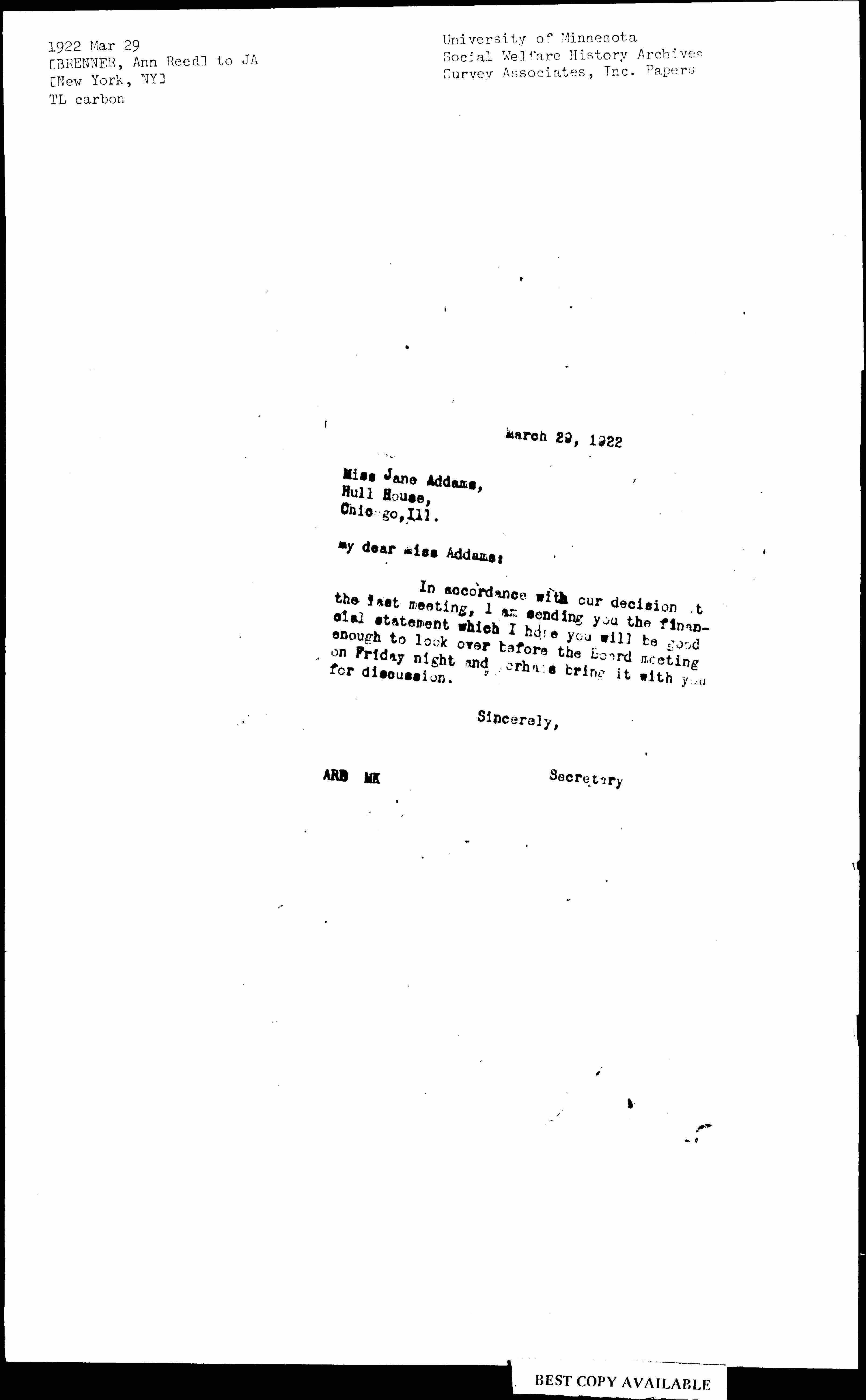 In accordance with our decision [at] the last meeting, I am sending you the financial statement which I hope you will be good enough to look over before the Board meeting on Friday night and perhaps bring it with you for discussion.