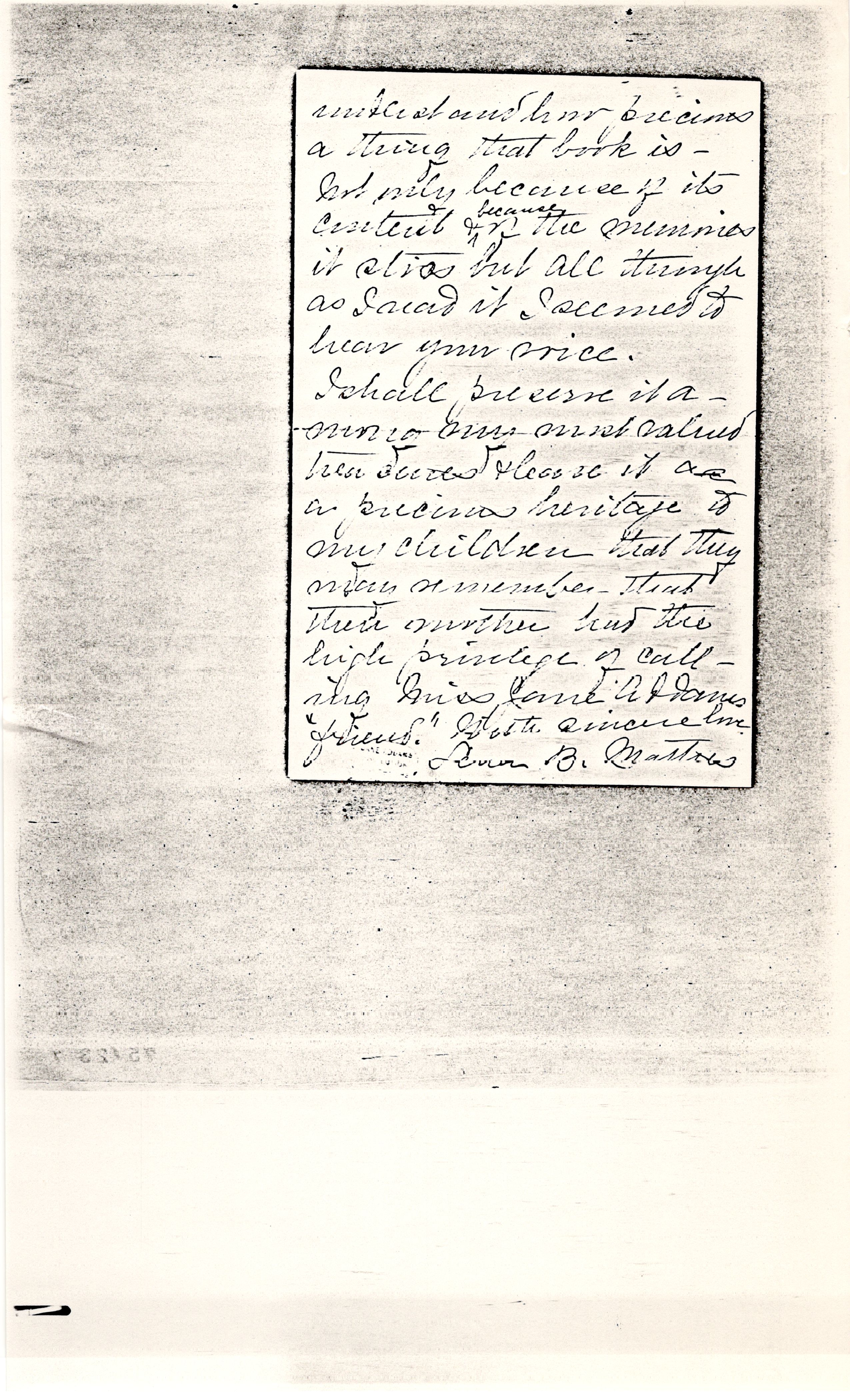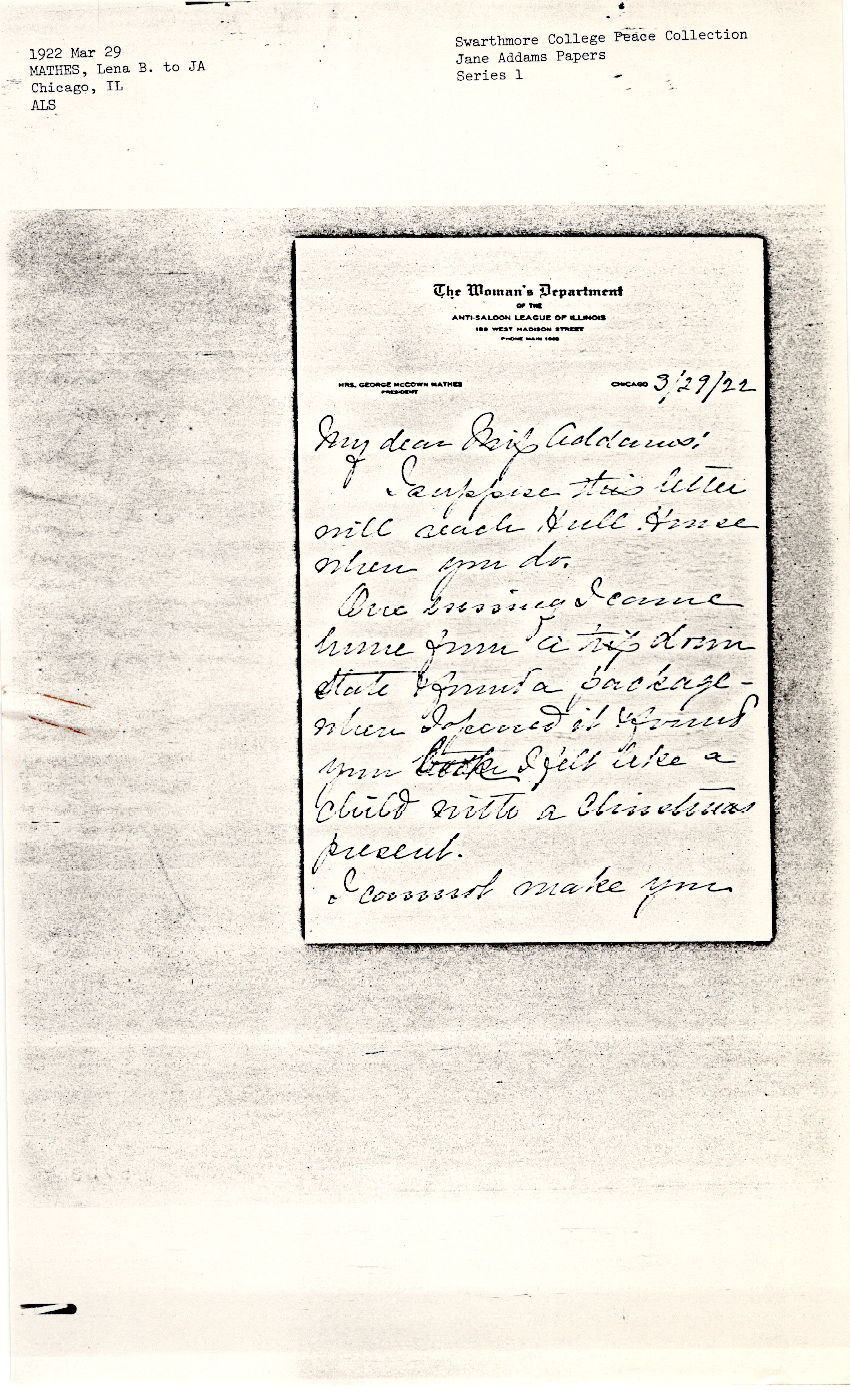 I shall preserve it among my most valued treasures & leave it as a precious heritage to my children that they may remember that their mother had the high privilege of calling Miss Jane Addams "friend." With sincere love