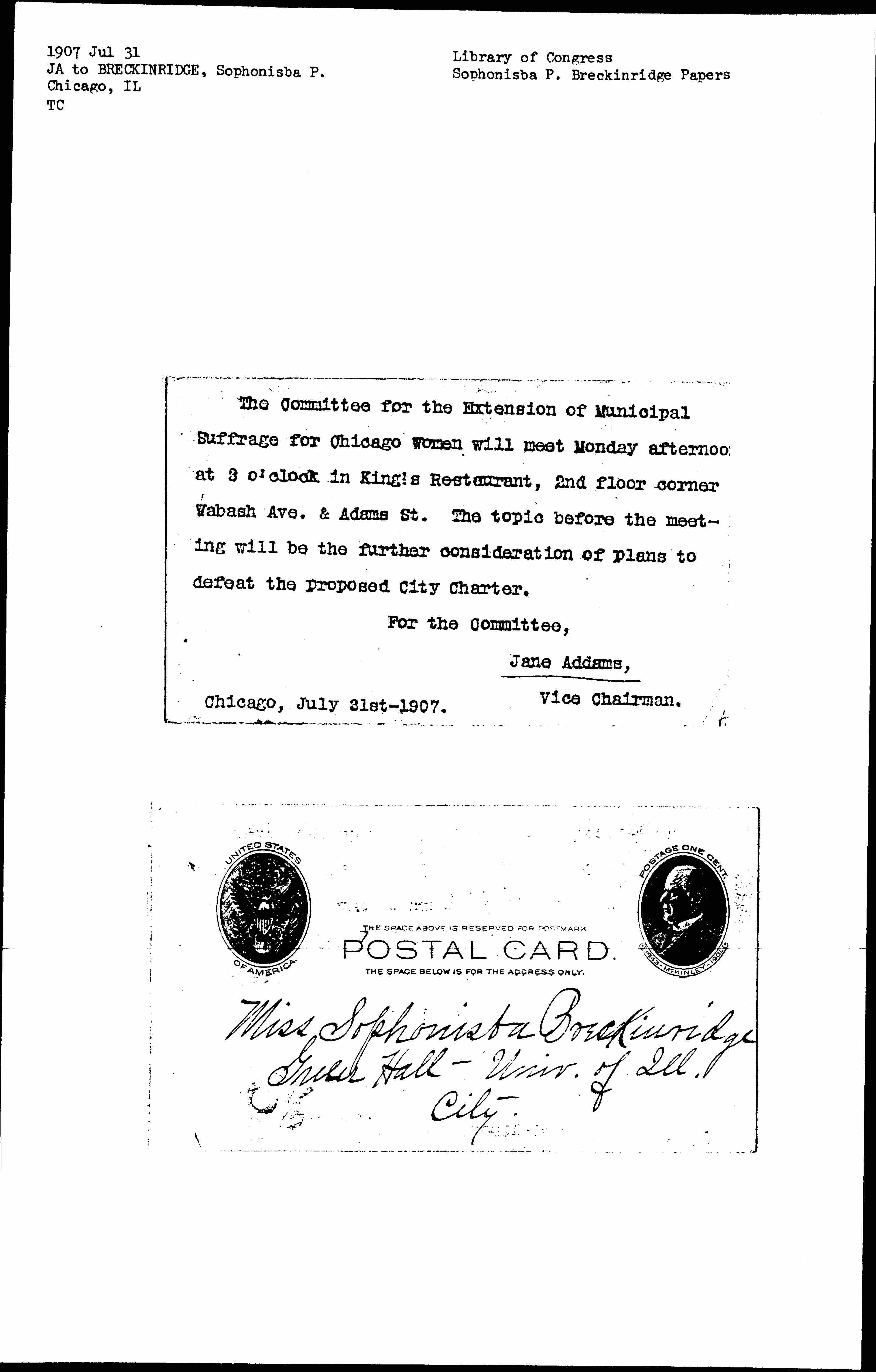 The Committee for the Extension of Municipal Suffrage for Chicago Women will meet Monday afternoon at 3 o'clock in King's Restaurant, 2nd floor corner Wabash Ave. & Adams St. The topic before the meeting will be the further consideration of plans to defeat the proposed City Charter.