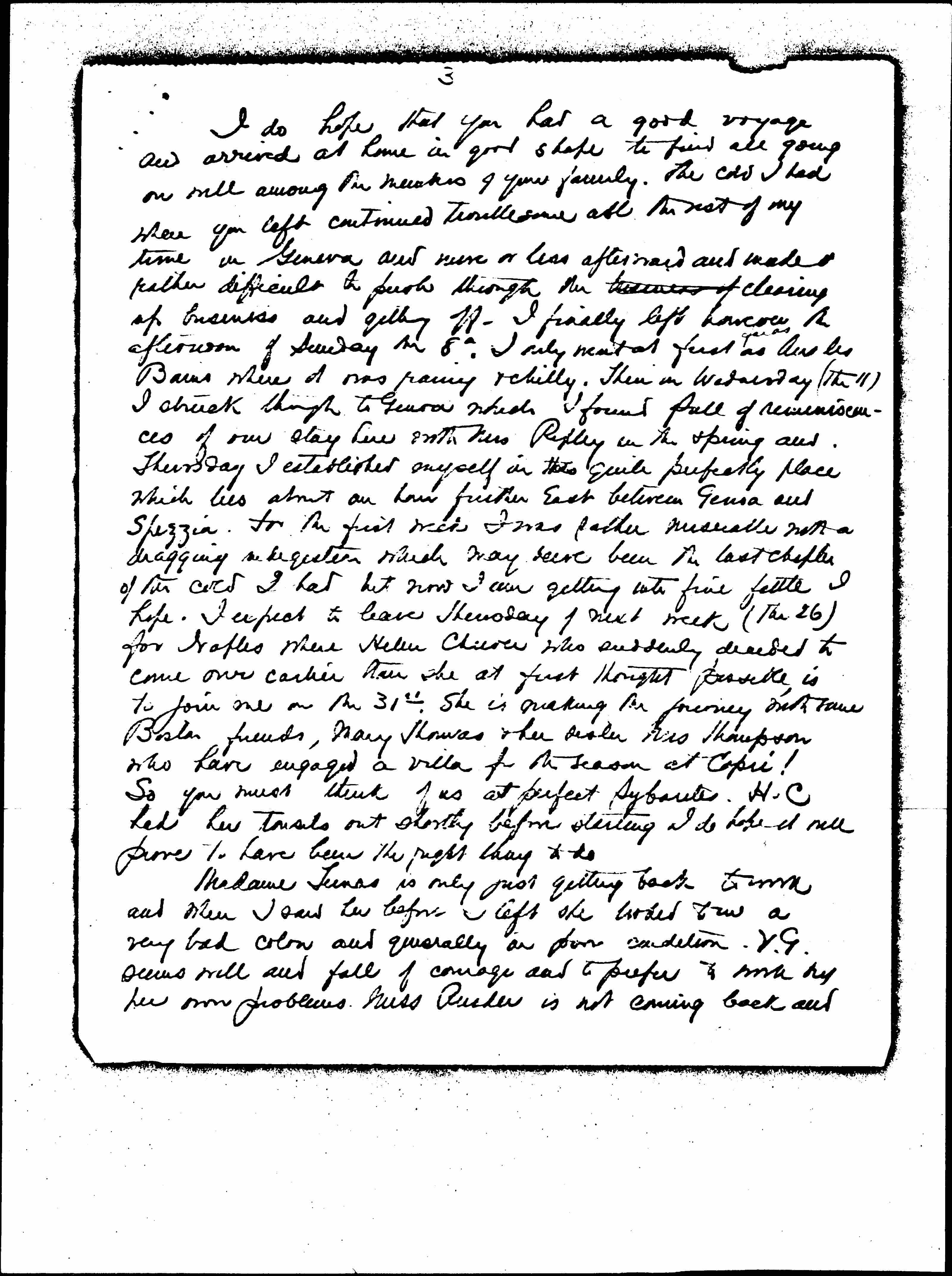 I do hope that you had a good voyage and arrived at home in good shape to find all going on well among the members of your family. The cold I had when you left continued troublesome all the rest of my time in Geneva and more or less afterward and made it rather difficult to push through the [business] clearing of business and getting off -- I finally left however the afternoon of Sunday the 8th. I only went at first as ↑far as↓ Aix Les Bains where it was rainy & chilly. Then on Wednesday (the 11) I struck through to Geneva which I found full of reminiscences of our stay here with Mrs Ripley in the spring and Thursday I established myself in this quite perfectly place which lies about an hour further East between Genoa and [Spezia]. For the first week I was rather miserable with a dragging indigestion which may have been the last chapter of the cold I had but now I am getting into fine fettle I hope. I expect to leave Thursday of next week (the 26) for Naples where Helen Cheever who suddenly decided to come over earlier than she at first thought possible, is to join me on the 31st. She is making the journey with some Boston friends, Mary Thomas & her sister Mrs Thompson who have engaged a villa for the season at Capri! So you must think of us [as] perfect Sybarites. H. C. had her tonsils out shortly before starting I do hope it will prove to have been the right thing to do.