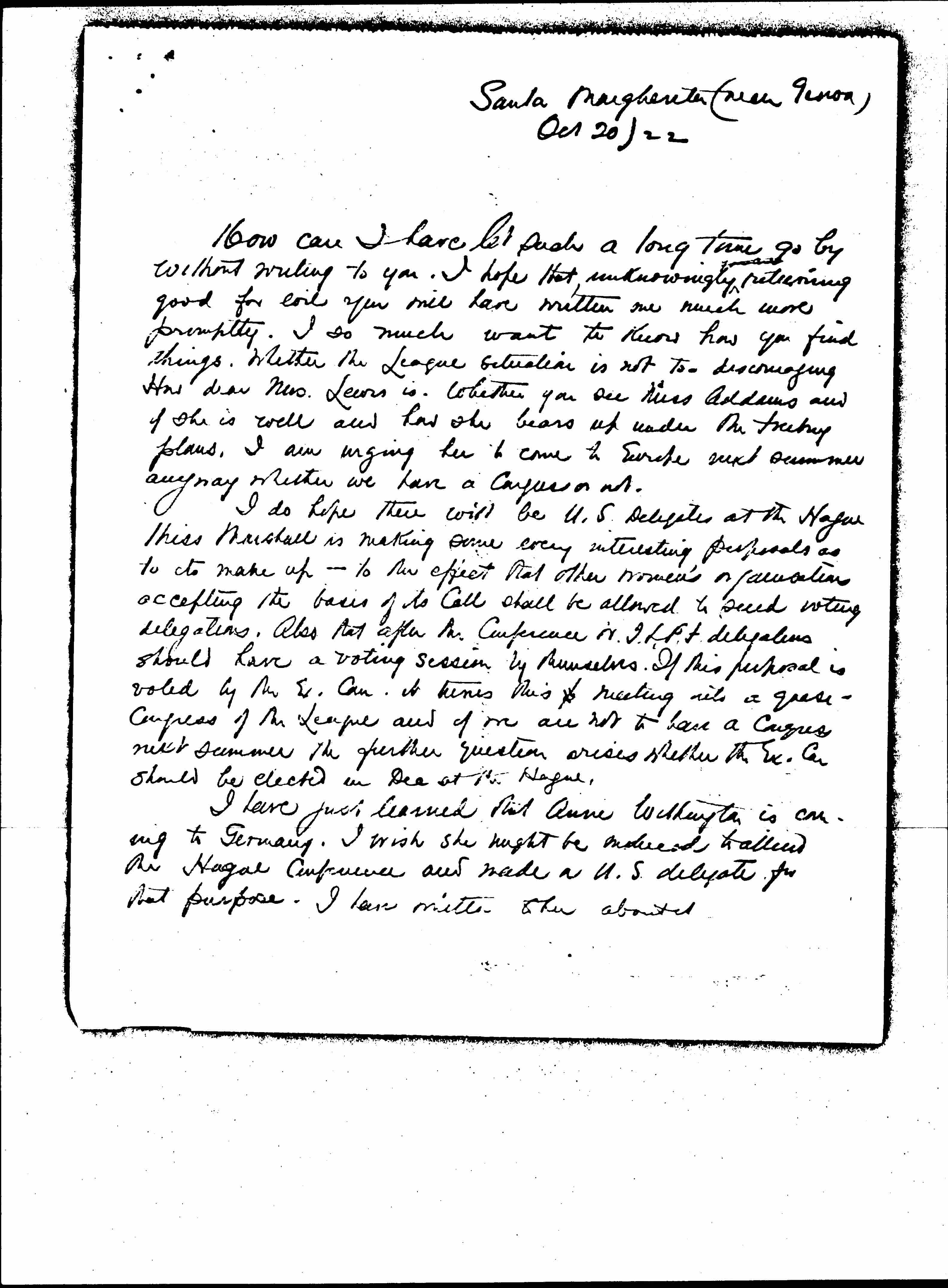 How can I have let such a long time go by without writing to you. I hope that, unknowingly ↑you are↓ returning good for evil you will have written me much more promptly. I so much want to know how you find things. Whether the League situation is not too discouraging. How dear Mrs. Lewis is. Whether you see Miss Addams and if she is well and how she bears up under the Freiberg plans. I am urging her to come to Europe next summer anyway whether we have a Congress or not.