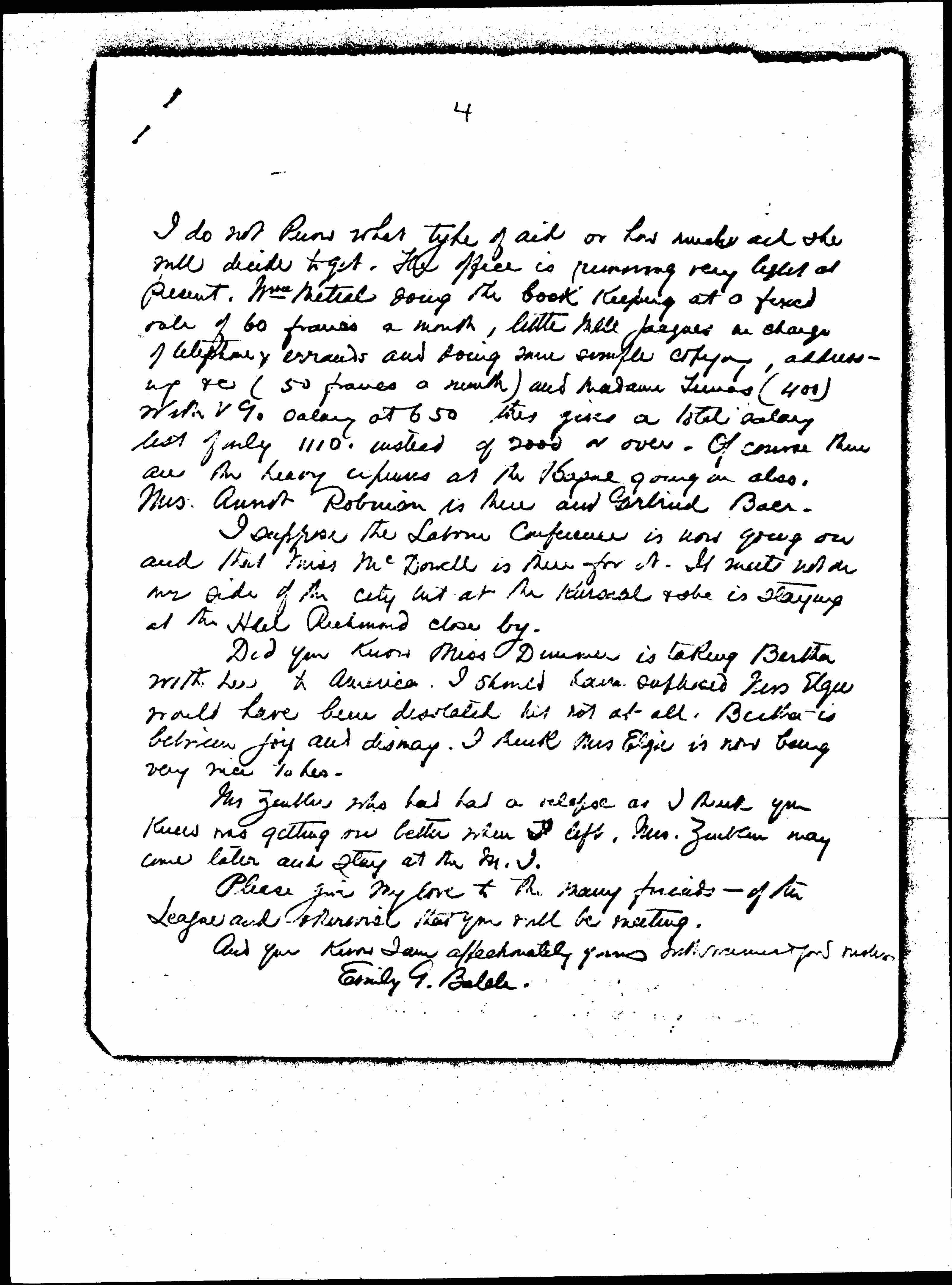Madame Tunas is only just getting back to work and when I saw her before I left she looked to me a very bad color and generally in poor condition. V. G. seems well and full of courage and to prefer to work out her own problems. Miss Reeder is not coming back and [page 4] I do not know what type of aid or how much aid she will decide to get. The office is running very light at present. Mme Métral doing the book keeping at a fixed rate of 60 francs a month, little Mlle. [Jacques?] in charge of telephone & errands and doing some simple copying, addressing [etc.] (50 francs a month) and Madame Tunas (400) with V. G. salary at 650 this gives a total salary list if only 1110 instead of 2000 or over -- Of course there are the heavy expenses at The Hague going on also. Mrs. Annot Robinson is there and Gertrud Baer.