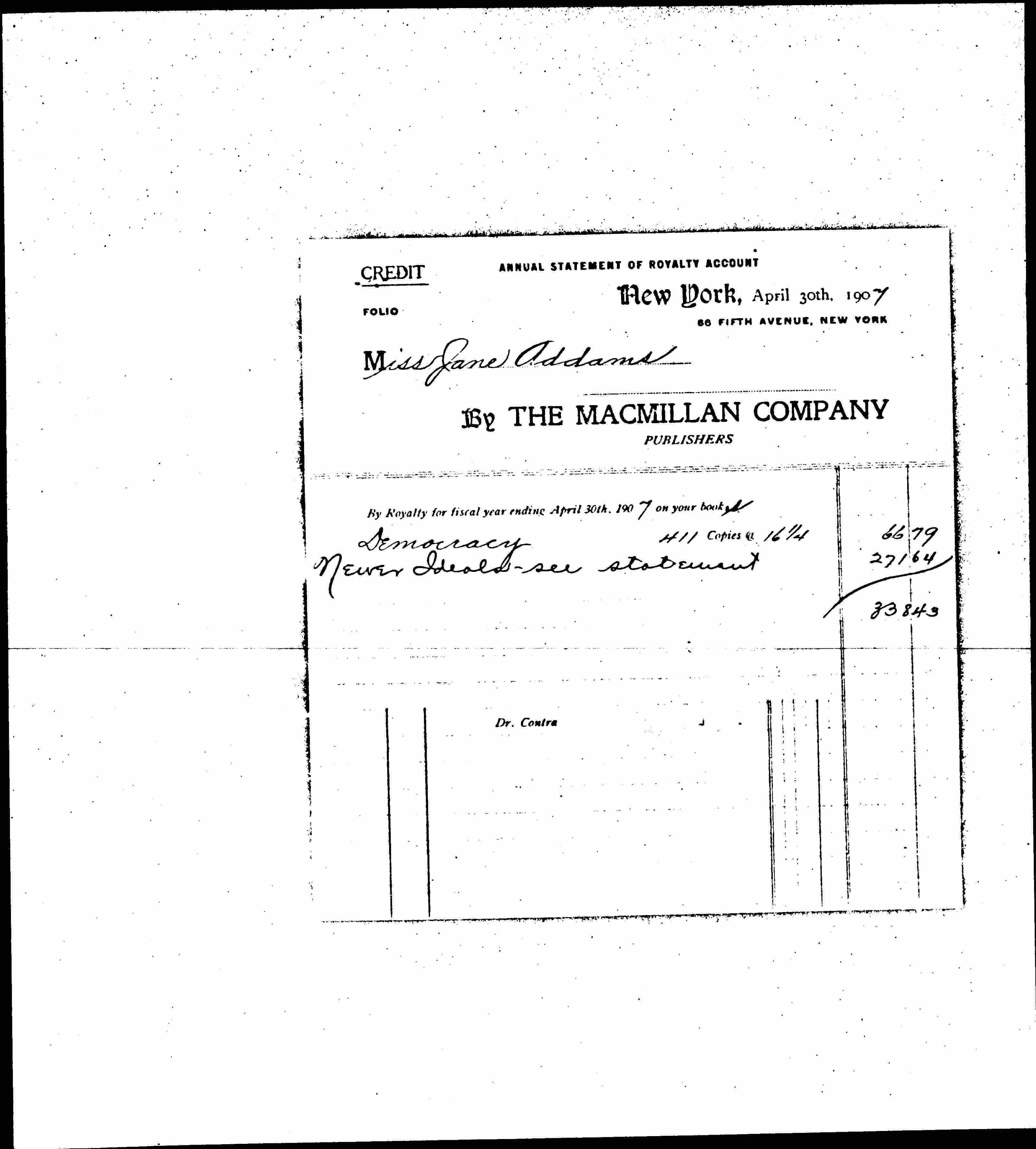 By Royalty for fiscal year ending April 30th, 1907 on your books.Democracy 411 Copies 16 1/4 --- 66.79