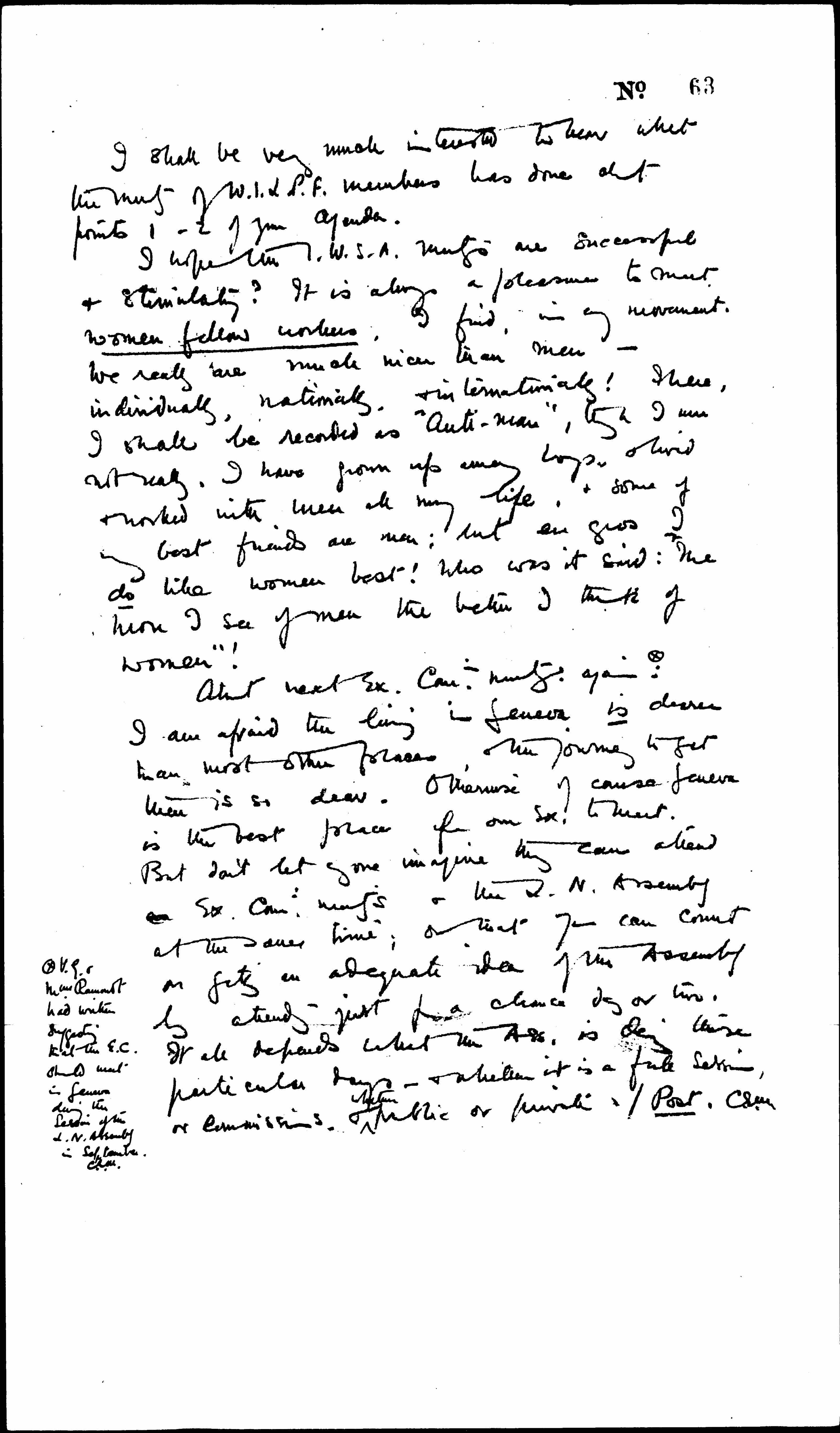 About next Ex Comtee meeting again.[X] I am afraid the living in Geneva is dearer than most other places, and the journey to get there is so dear. Otherwise of course Geneva is the best place for our Ex. to meet. But don't let anyone imagine they can attend [illegible] Ex. Comee meetings & the L. N. Assembly at the same time; or that you can count on getting an adequate idea of the Assembly by attending just for a chance day or two. It all depends what the Ass. is doing those particular days -- & whether it is a full session, or commissions, & ↑whether↓ public or private. / Post. C. E. M.