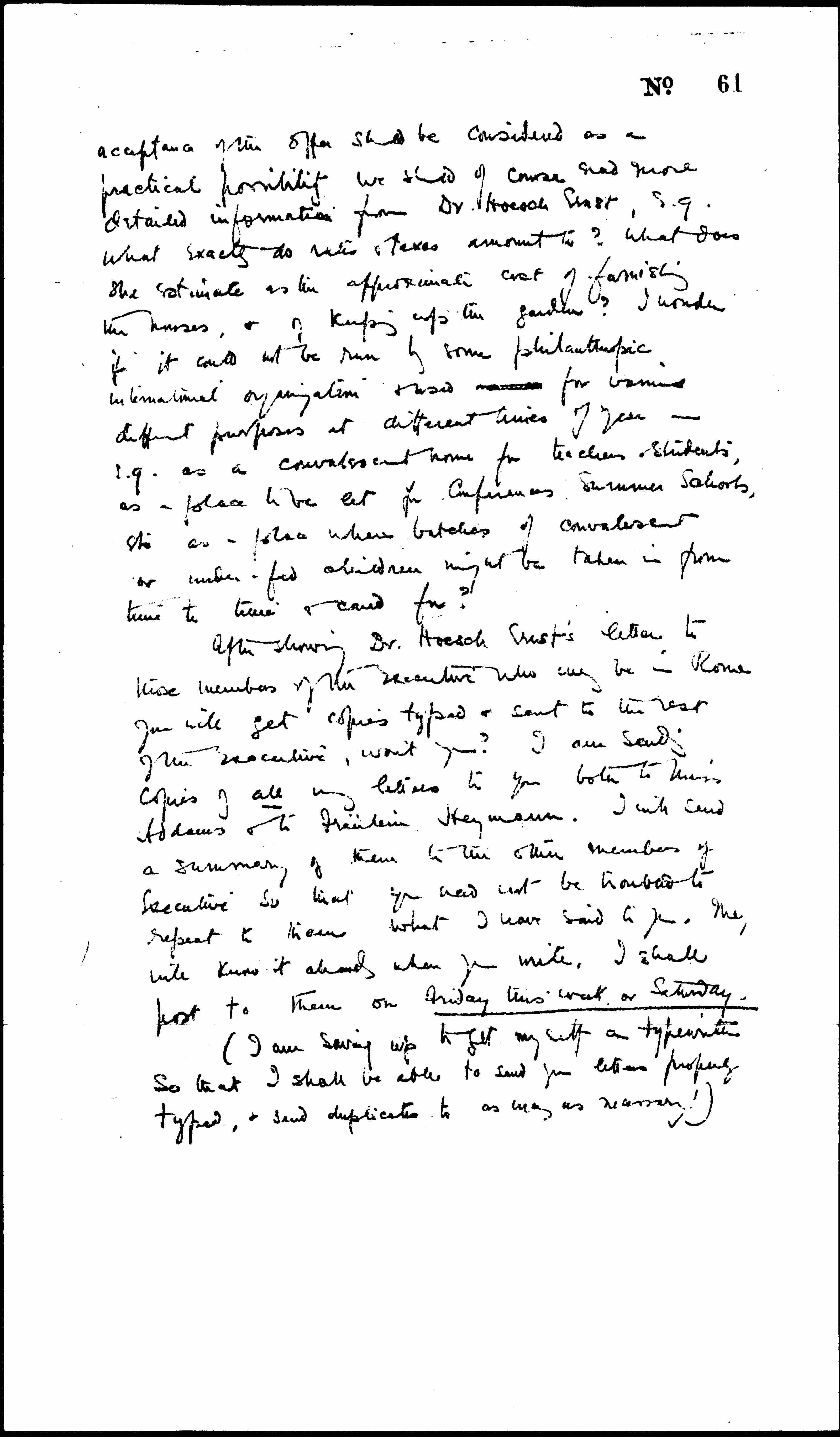 I enclose Dr. Hoesch Ernst's letter of which I have a second copy. I have thanked her for her very generous offer, & have said it would be referred at once to our International Executive. I did not know [page 2] at all what answer we should feel we could give, but I told her we were very short of funds, & could only just afford to keep our Geneva office going. There could be no question, I thought, of giving that up, & making Godesberg our headquarters instead. (If the Rhineland is made an "independent state," under French influence ↑(if not under direct French military control)↓ it wd be the last place in the world from which it would be easy to carry on international pacifist propaganda! See her suggestion as to this). We should therefore, if we accepted the offer, have to run Godesberg as a separate institution, with the expense of staff, rates & taxes, furnishing, etc. It seems to me out of the question in the present state of our finances. But it ↑also↓ seems a pity to have to refuse so generous an offer. I wonder whether it would be possible to ask her if we might have a chance again, say in ten years' time, when we shall, we hope, be a larger & stronger & richer body? I wonder what the Executive will think -- note that Dr. Hoesch Ernst does not want the house used simply as headquarters of our German Section -- she wants it to be an international [center]. I know that she is very insistent on this -- it is an essential point of her idea. Though I imagine it might be used partly as a German [center] if it were an international [center] as well. If the Ex. Comee thinks the [page 3] acceptance of the offer should be considered as a practical possibility we should of course need more detailed information from Dr. Hoesch Ernst, e.g. What exactly do rates & taxes amount to? What does she estimate as the approximate cost of furnishing the houses, & of keeping up the garden? I wonder if it would not be run by some philanthropic international organization & used [illegible] for various different purposes at different times of year -- e.g. as a convalescent home for teachers & students, as a place to be let for Conferences, Summer Schools, etc. as a place where batches of convalescent or [underfed] children might be taken in from time to time & cared for?