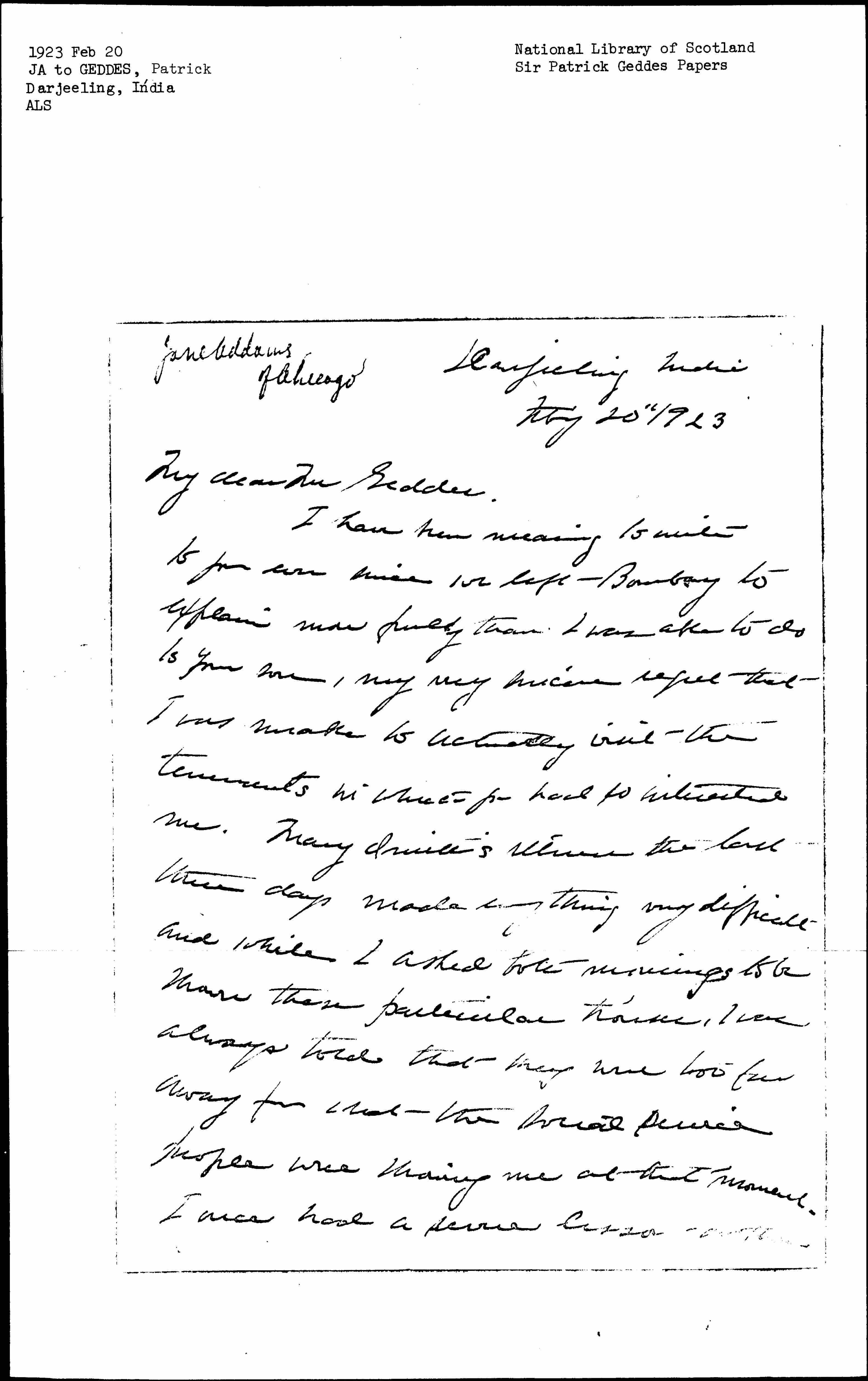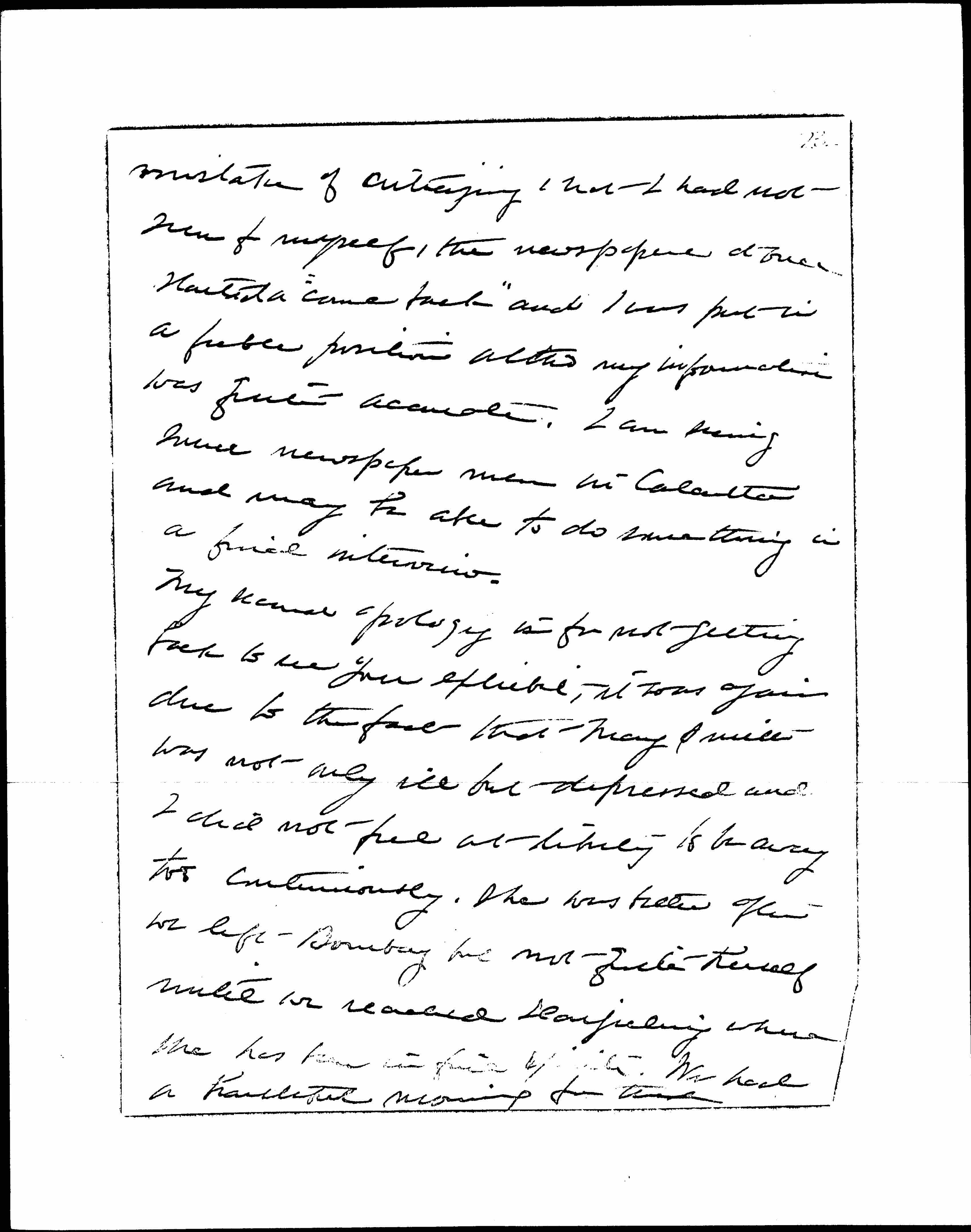 I have been meaning to write to you ever since we left Bombay to explain more fully than I was able to do to your son, my very sincere regret that I was unable to actually visit the tenements in which you had so interested me. Mary Smith's illness the last three days made everything very difficult and while I asked both mornings to be shown those particular houses, I was always told that they were too far away from what the social service people were showing me at that moment. I once had a severe lesson [illegible] [page 2] mistake of criticizing what I had not seen for myself, the newspaper at once started a "come back" and I was put in a feeble position [although] my information was quite accurate. I am seeing more newspaper men in Calcutta and may be able to do something in a final interview.
