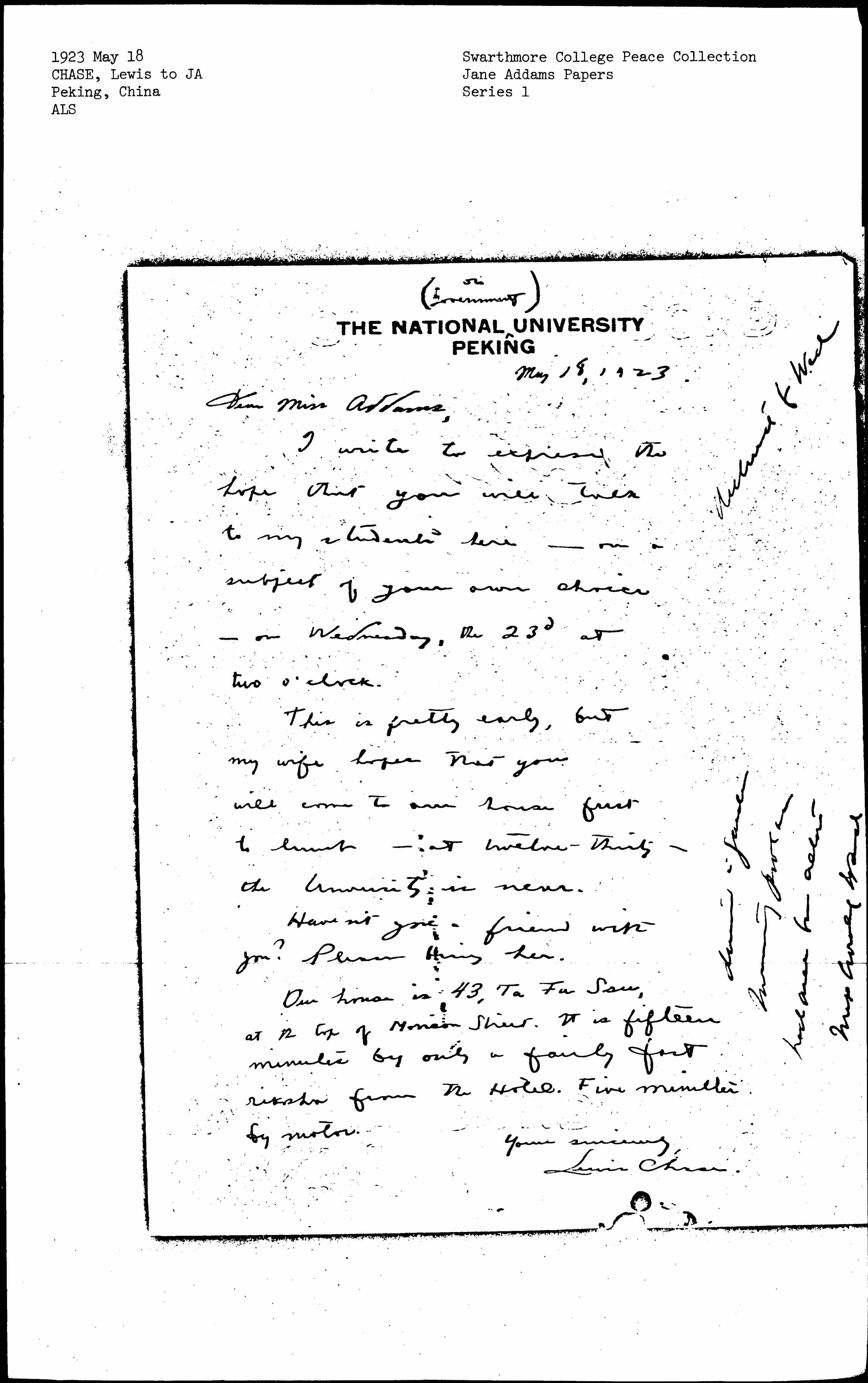 Our house is 43, Ta Fu San, at the top of [Morrison] Street. It is fifteen minutes by only a fairly fast [rickshaw] from the Hotel. Five minutes by motor.