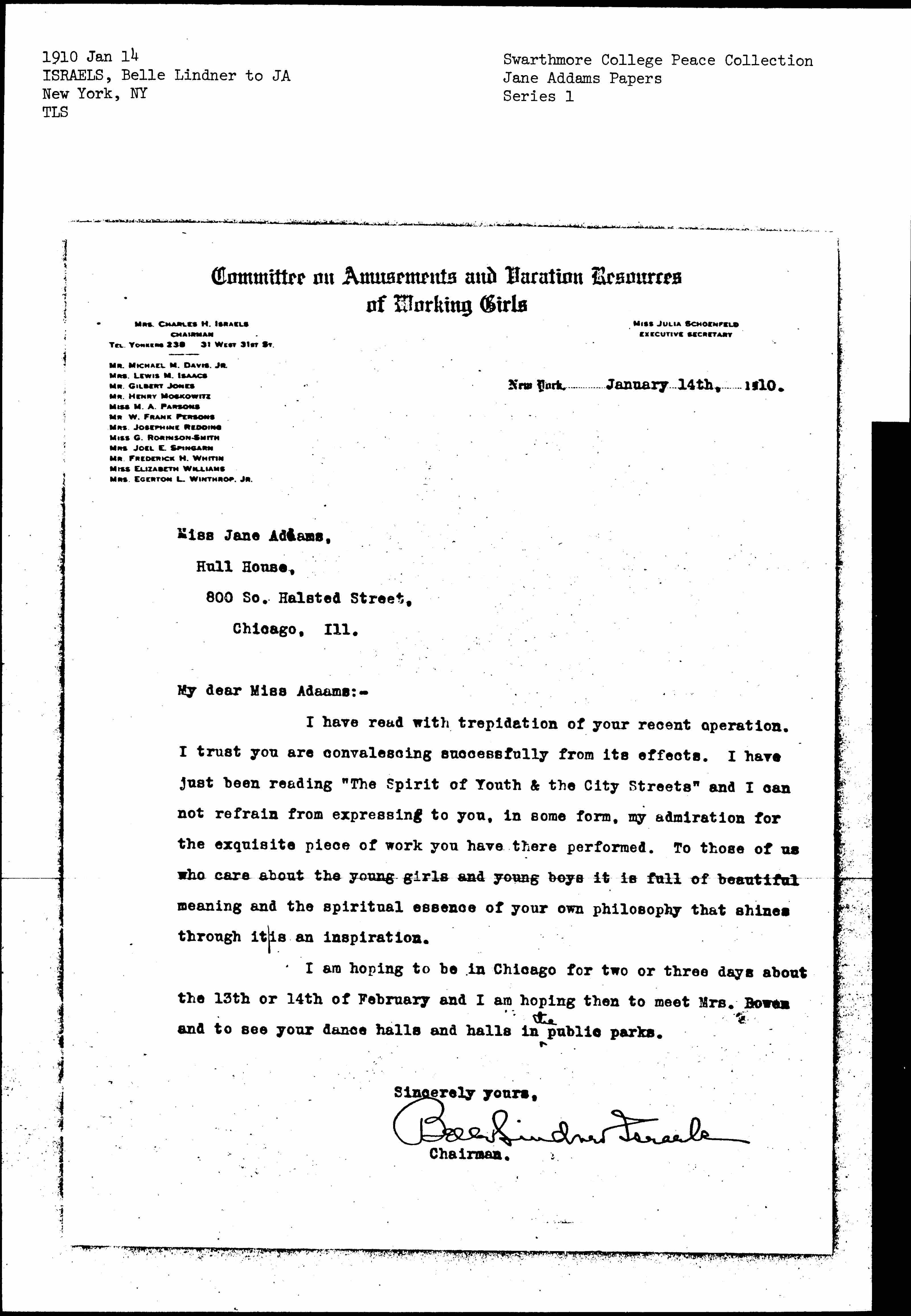 Belle Lindner Israels [signed]